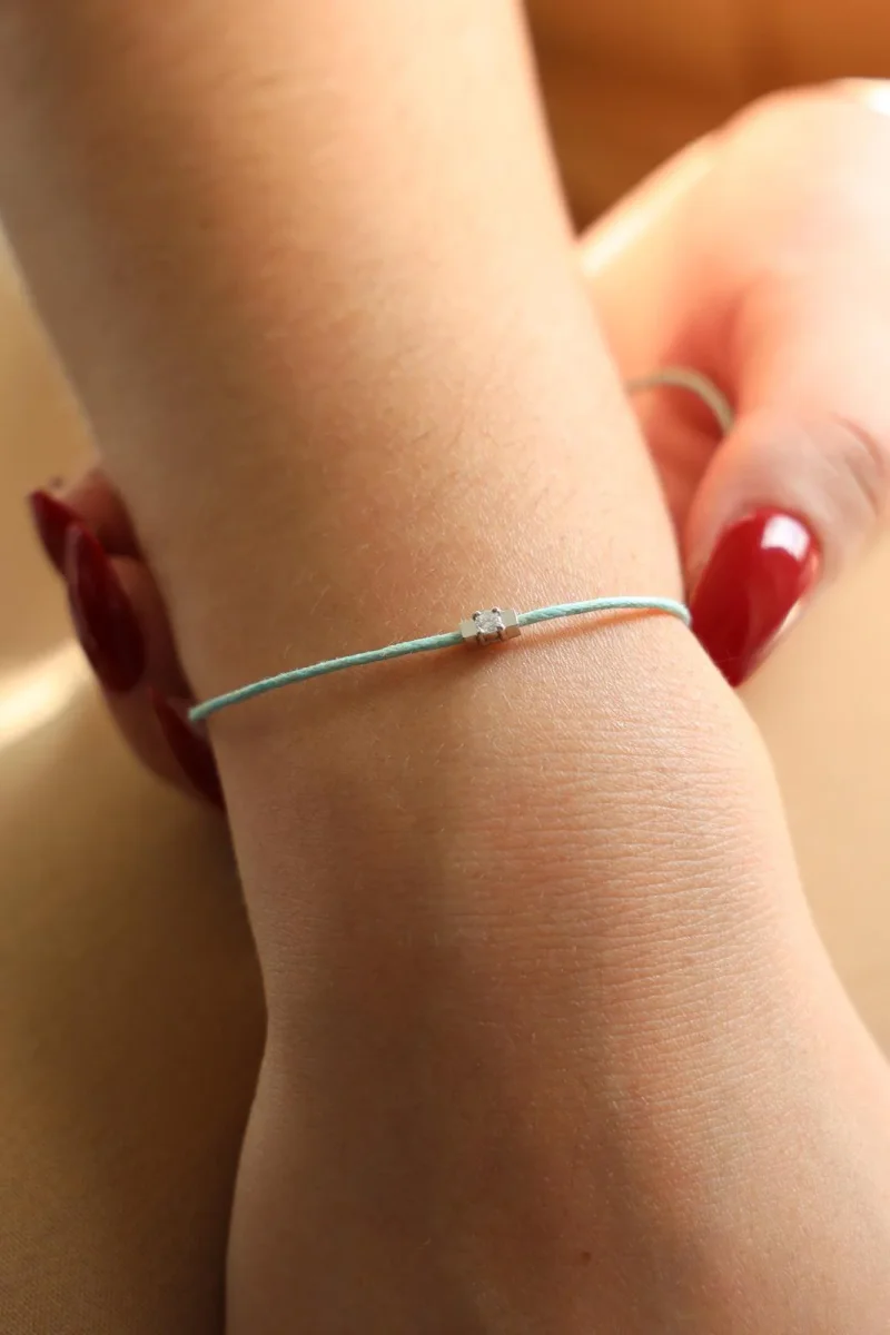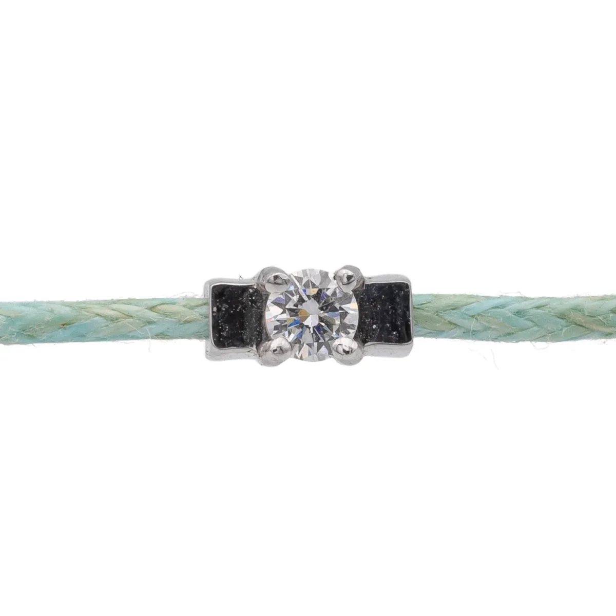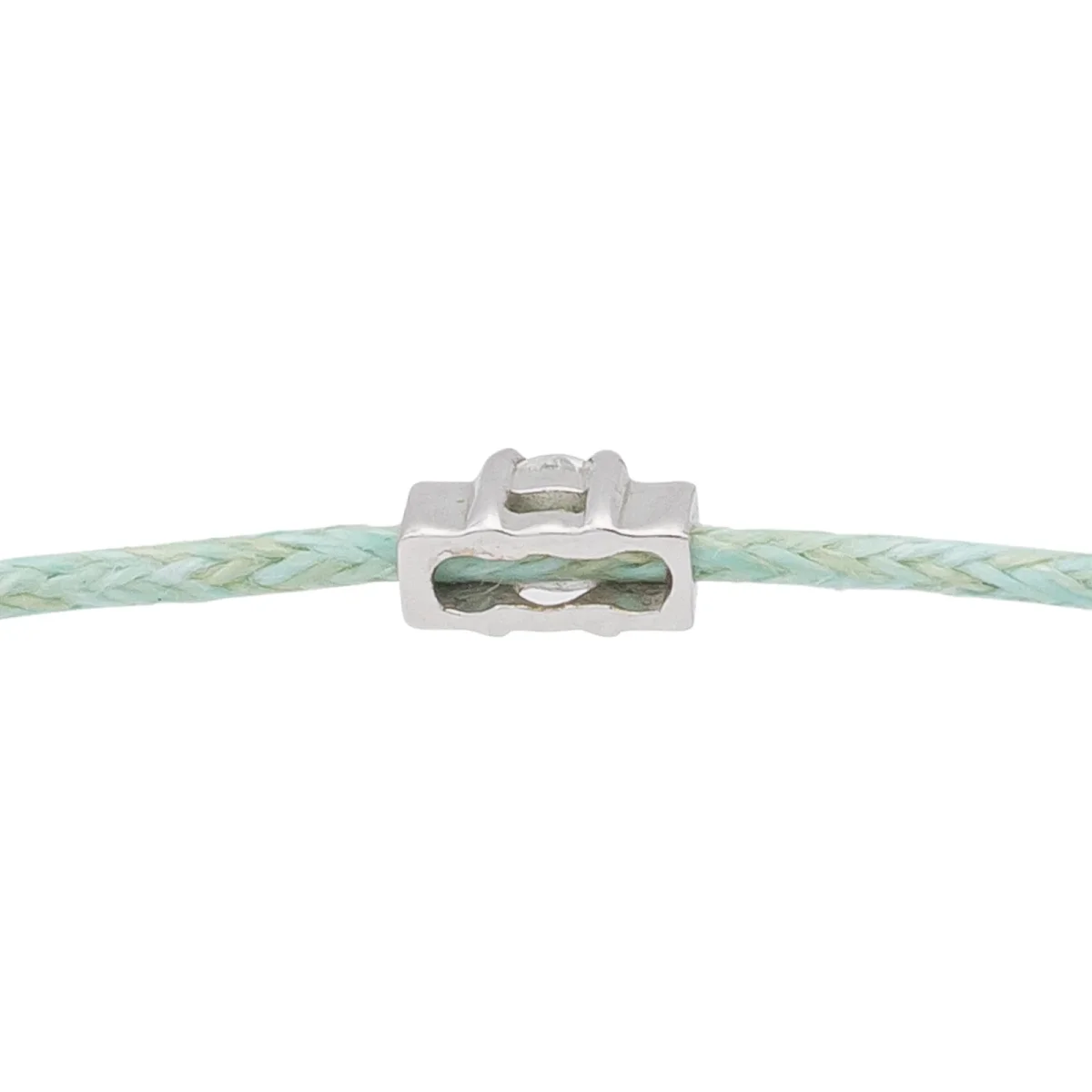 Bracelet cordon vert d’eau, composé d’un motif en or blanc 750 millièmes (18 carats) serti d’un diamant taille brillant G-VS de 0,06 ct, dimension du motif: 0,54 cm x 0,26 cm, poids en or: 0,40 g, poids total: 0,46 g, taille ajustable, état neuf