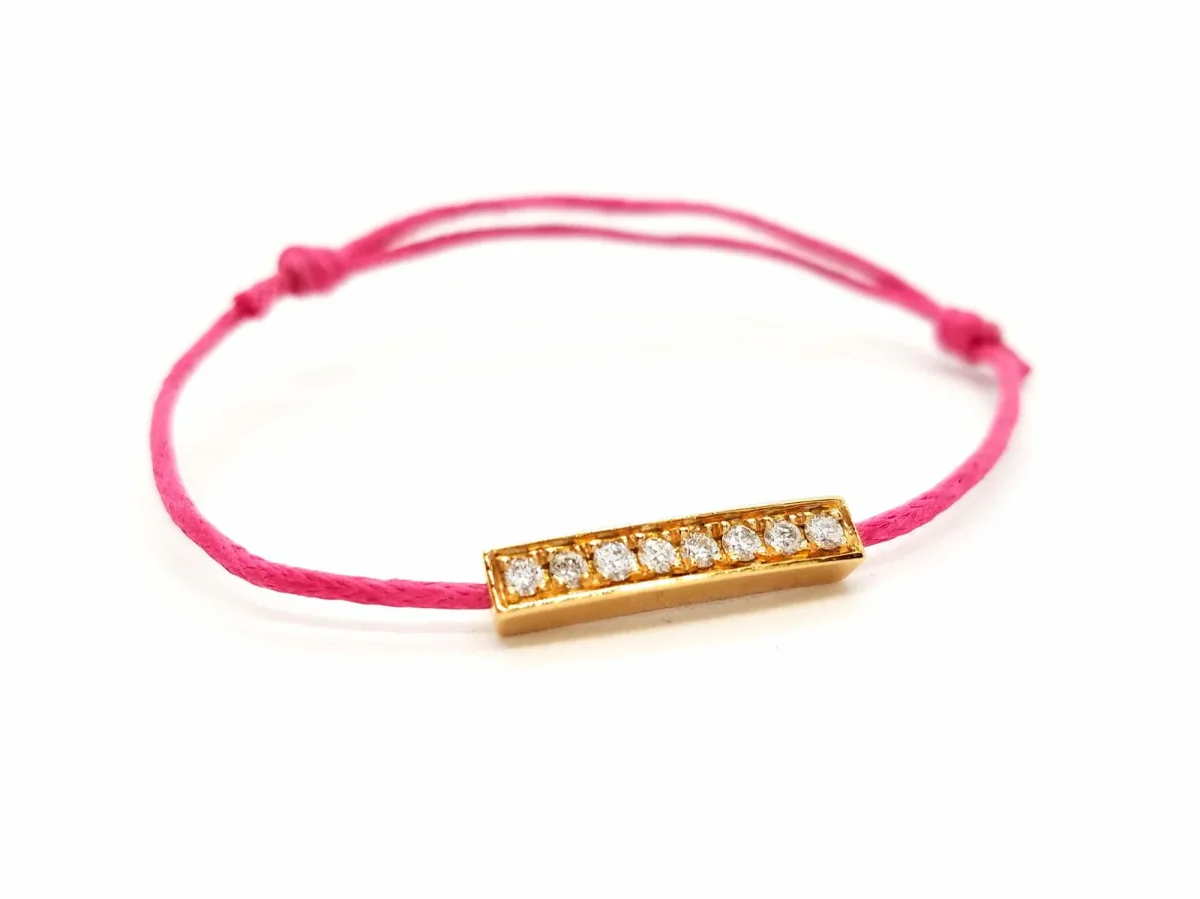 Bracelet cordon rose fushia, composé d’un motif rectangulaire en or rose 750 millièmes (18 carats), serti de 8 diamants taille brillant G-VS pour un total de 0,16 ct, dimension du motif: 1,69 cm x 0,34 cm, poids en or: 0,95 g, poids total:1,05 g, taille ajustable, état neuf