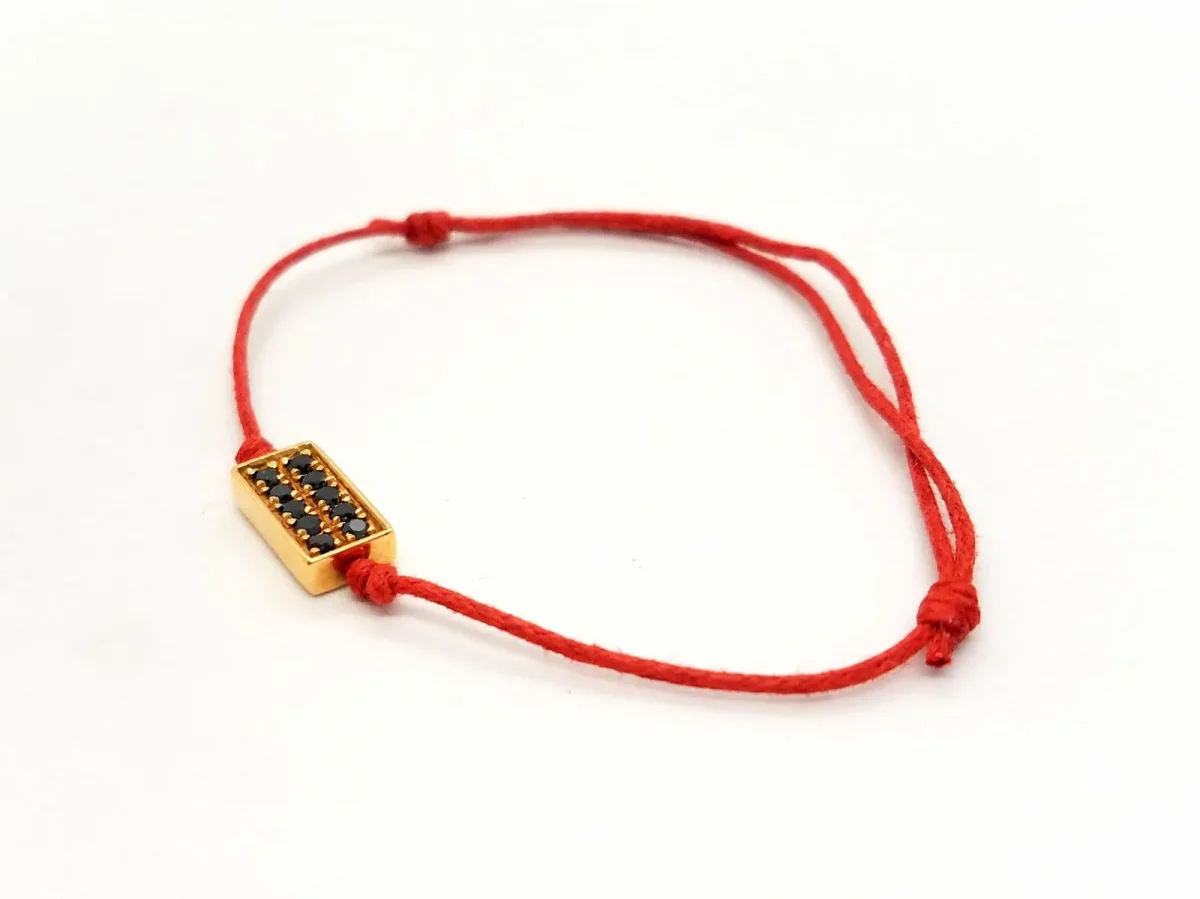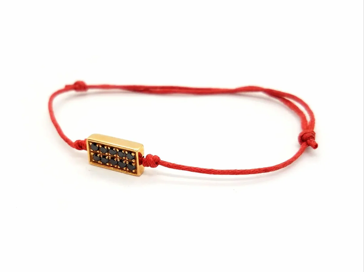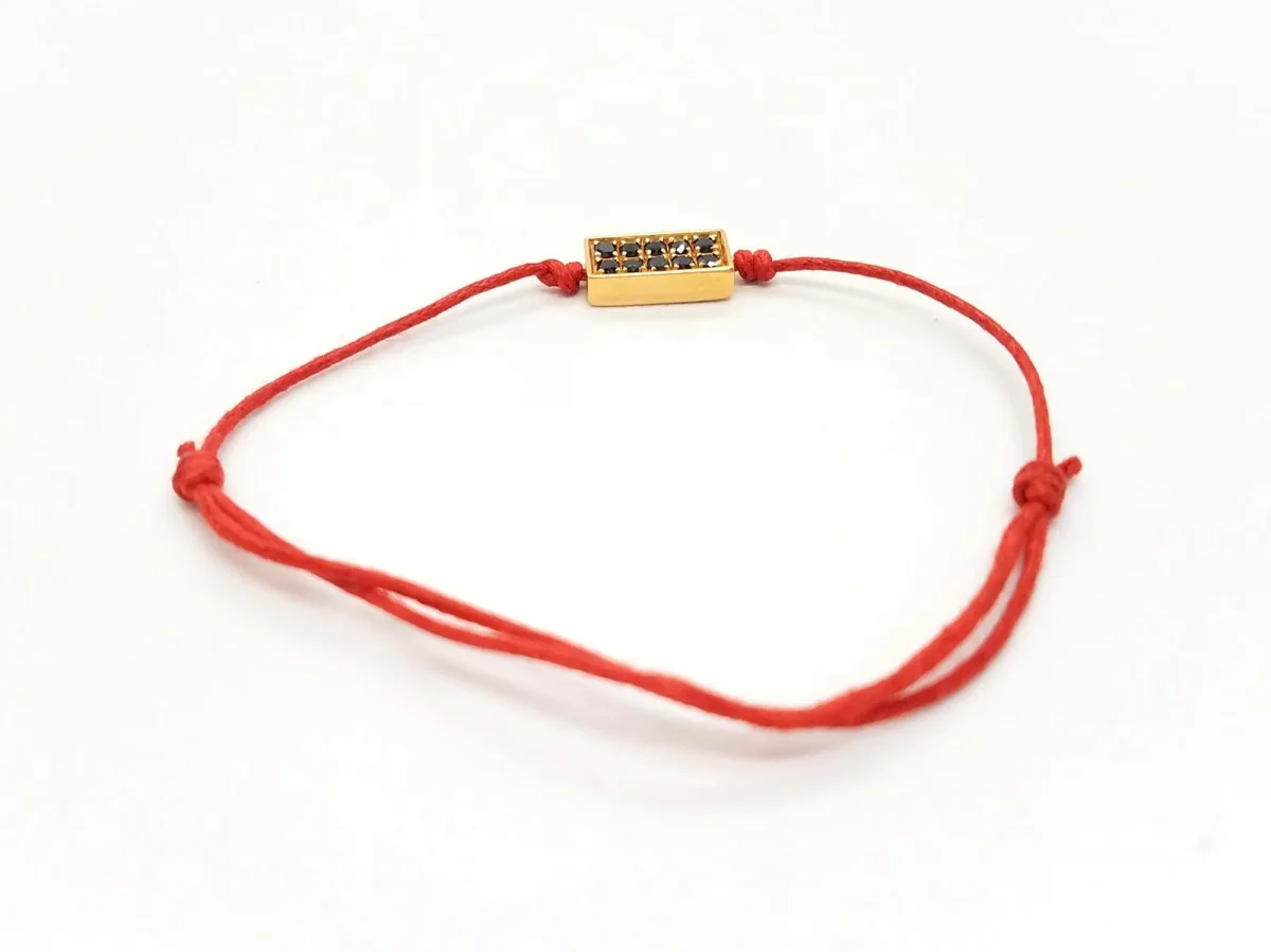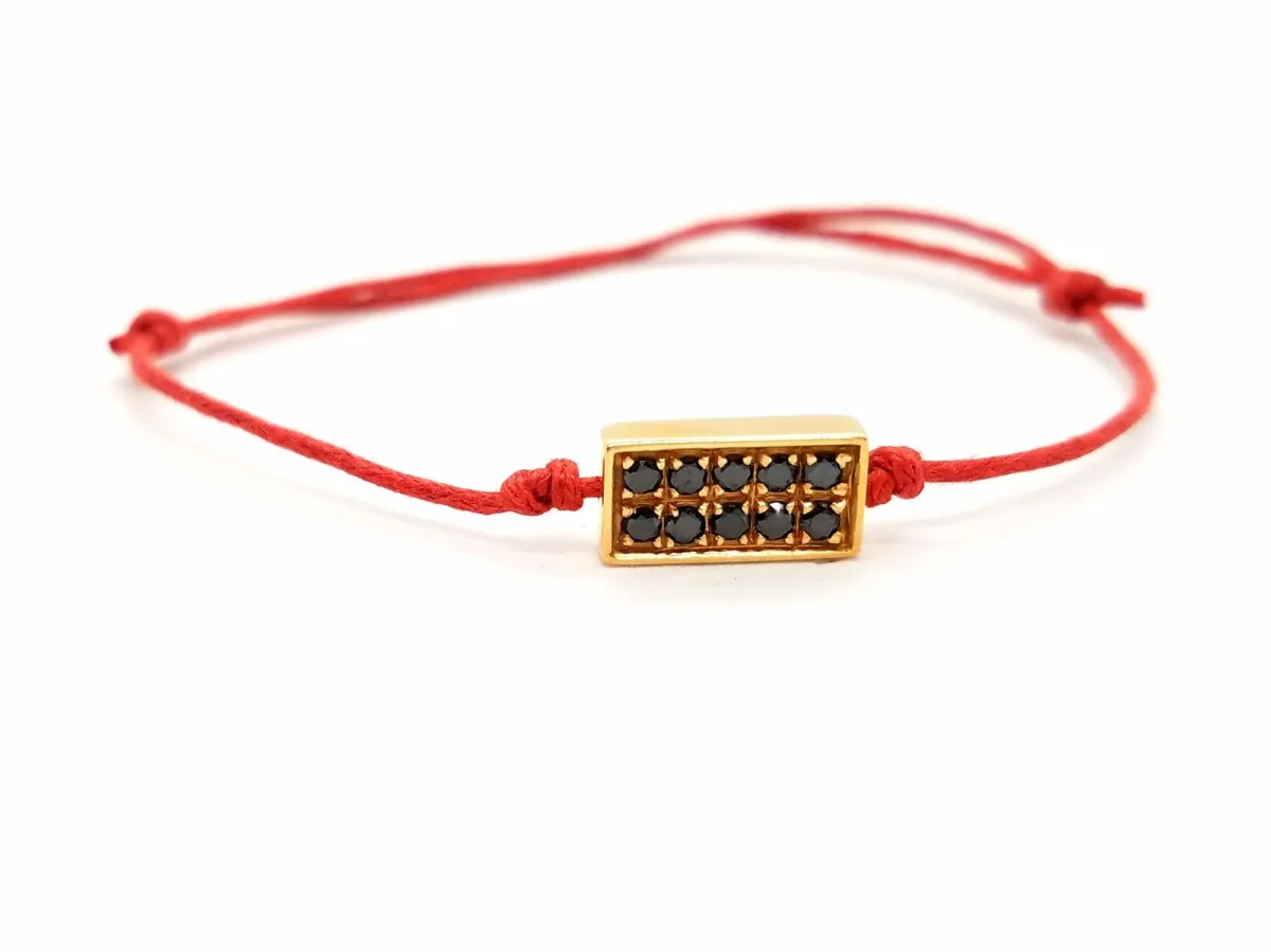 Bracelet cordon rouge, composé d’un motif rectangulaire en or rose 750 millièmes (18 carats), serti de 10 diamants noirs taille brillant pour un total de 0,20 ct, dimension du motif: 1,15 cm x 0,6 cm, poids en or: 1,18 g, poids total: 1,33 g, taille ajustable, état neuf