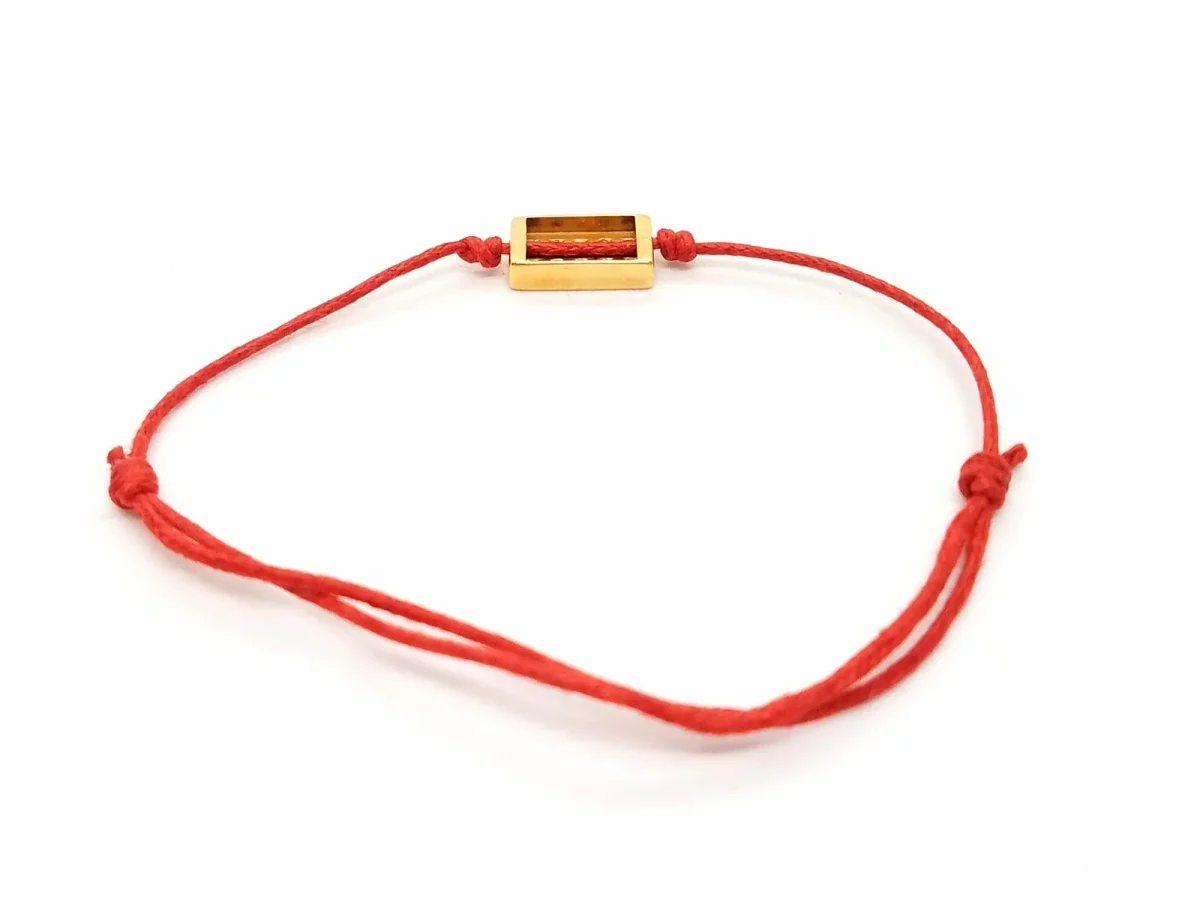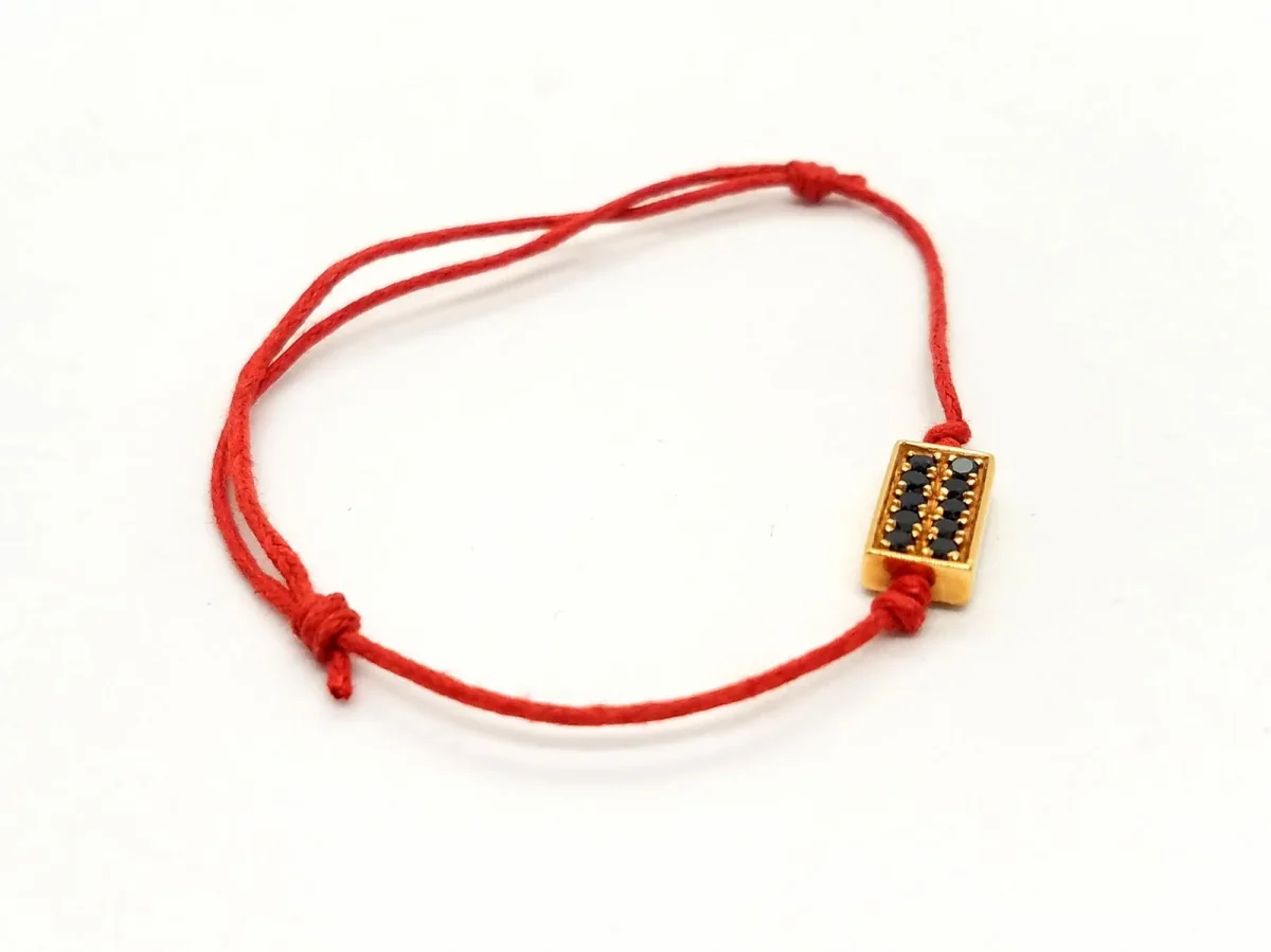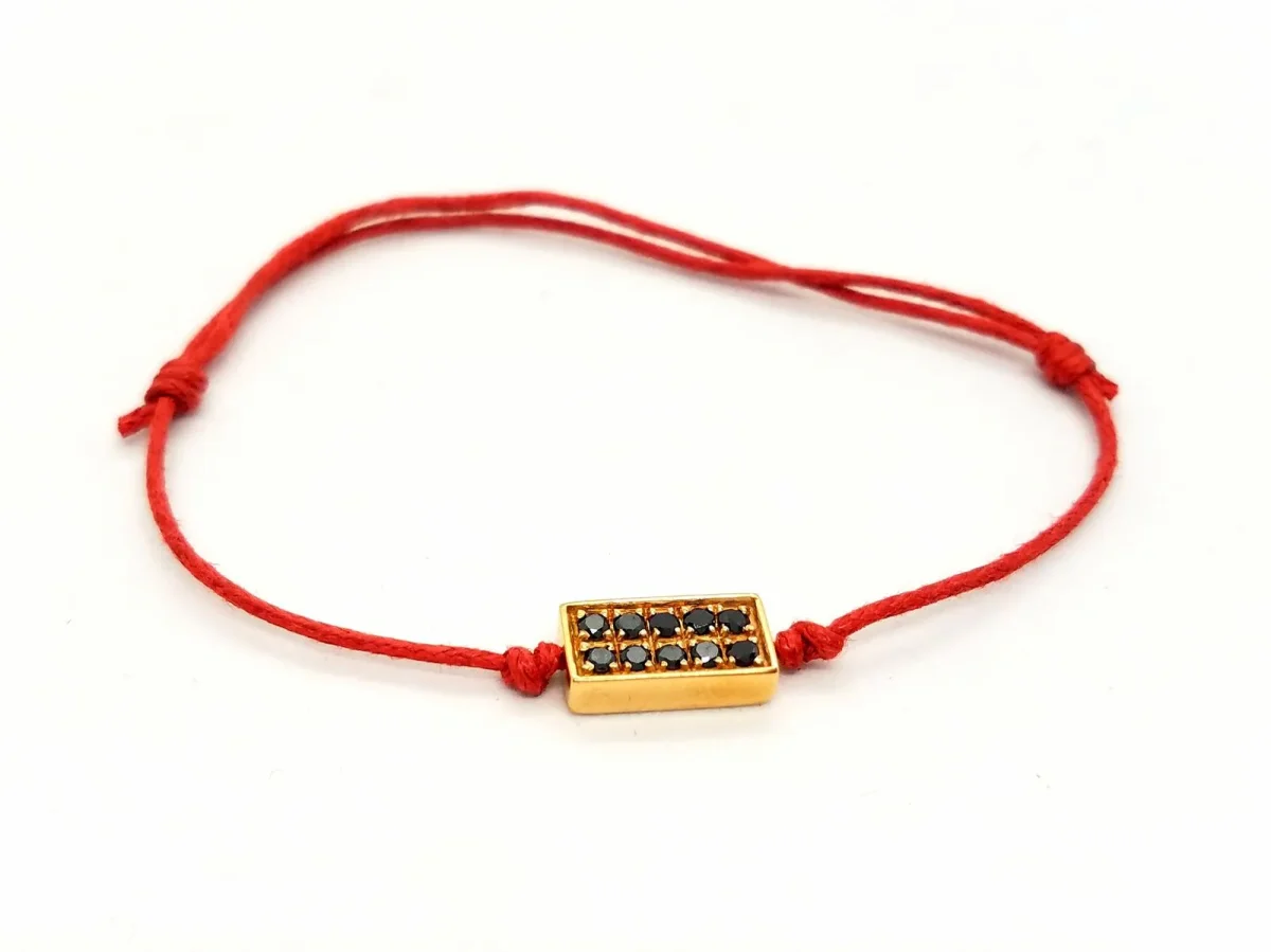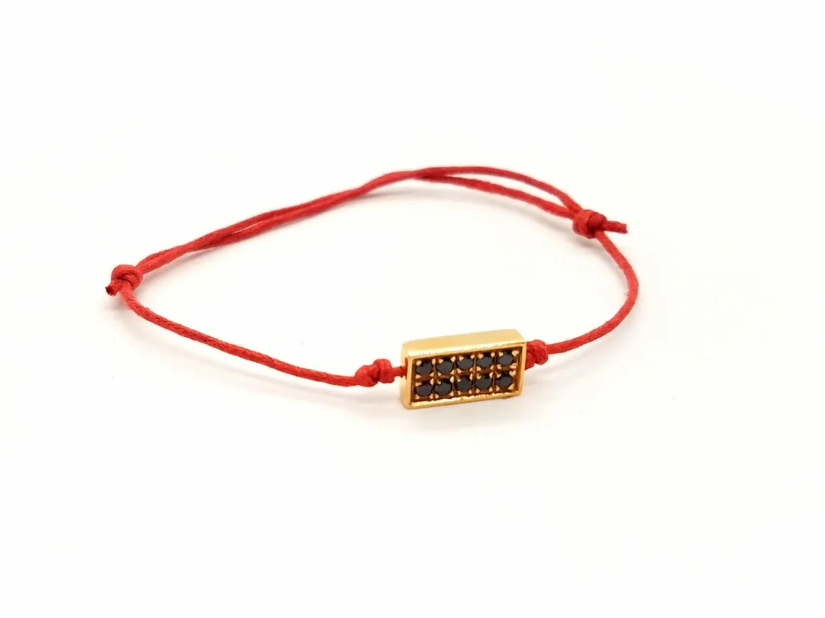 Bracelet cordon rouge, composé d’un motif rectangulaire en or rose 750 millièmes (18 carats), serti de 10 diamants noirs taille brillant pour un total de 0,20 ct, dimension du motif: 1,15 cm x 0,6 cm, poids en or: 1,18 g, poids total: 1,33 g, taille ajustable, état neuf