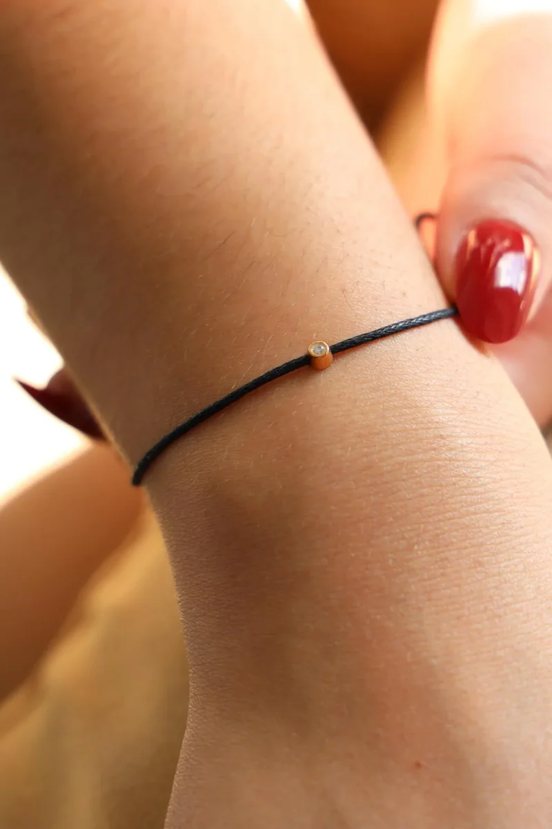 Bracelet cordon noir, composé d’un motif rond en or rose 750 millièmes (18 carats) avec un serti clos, diamant taille brillant G-VS pour un total de 0,02 ct, dimension du motif: 0,35 cm, poids en or: 0,14 g, poids total: 0,33 g, taille ajustable, état neuf