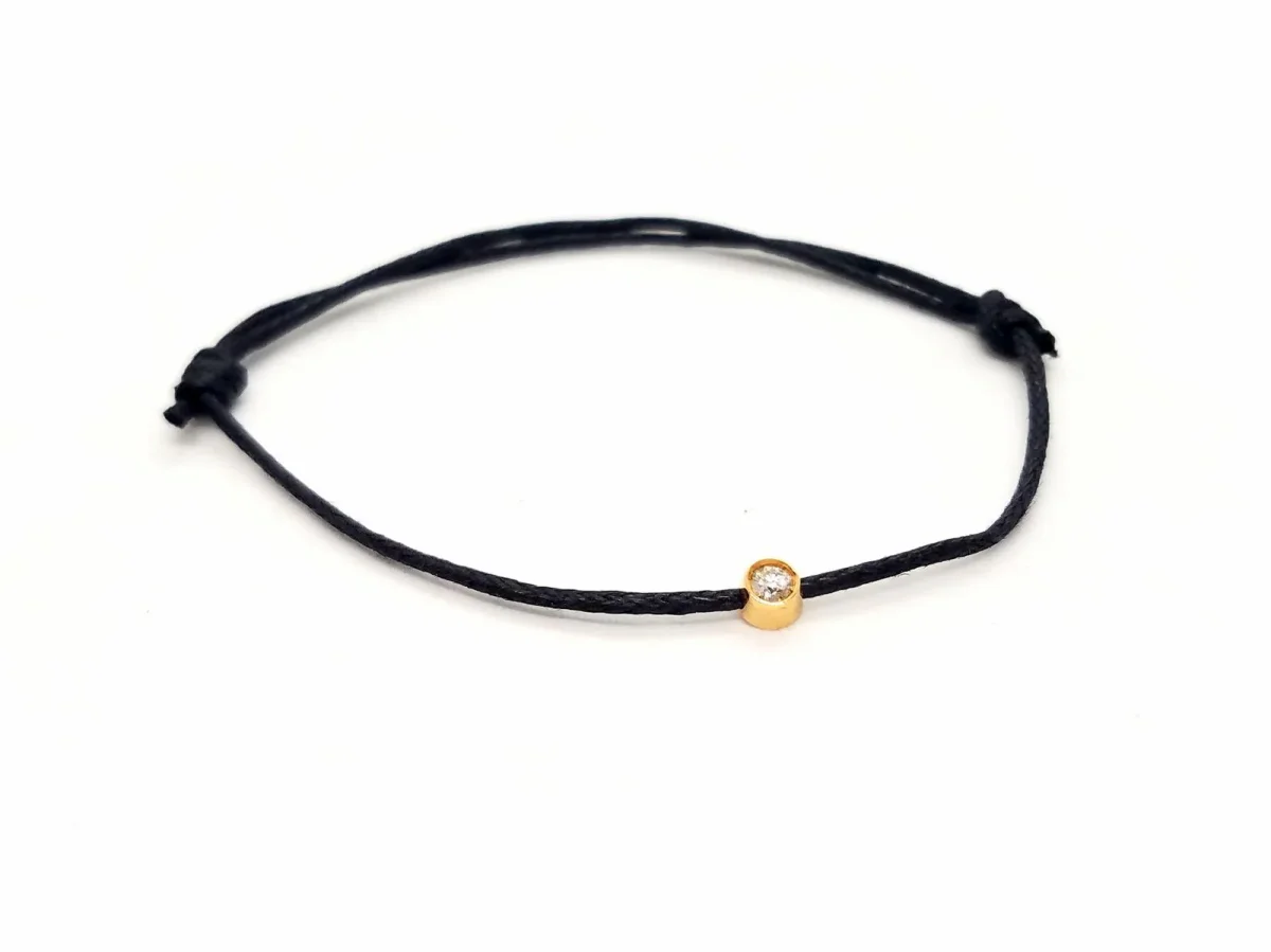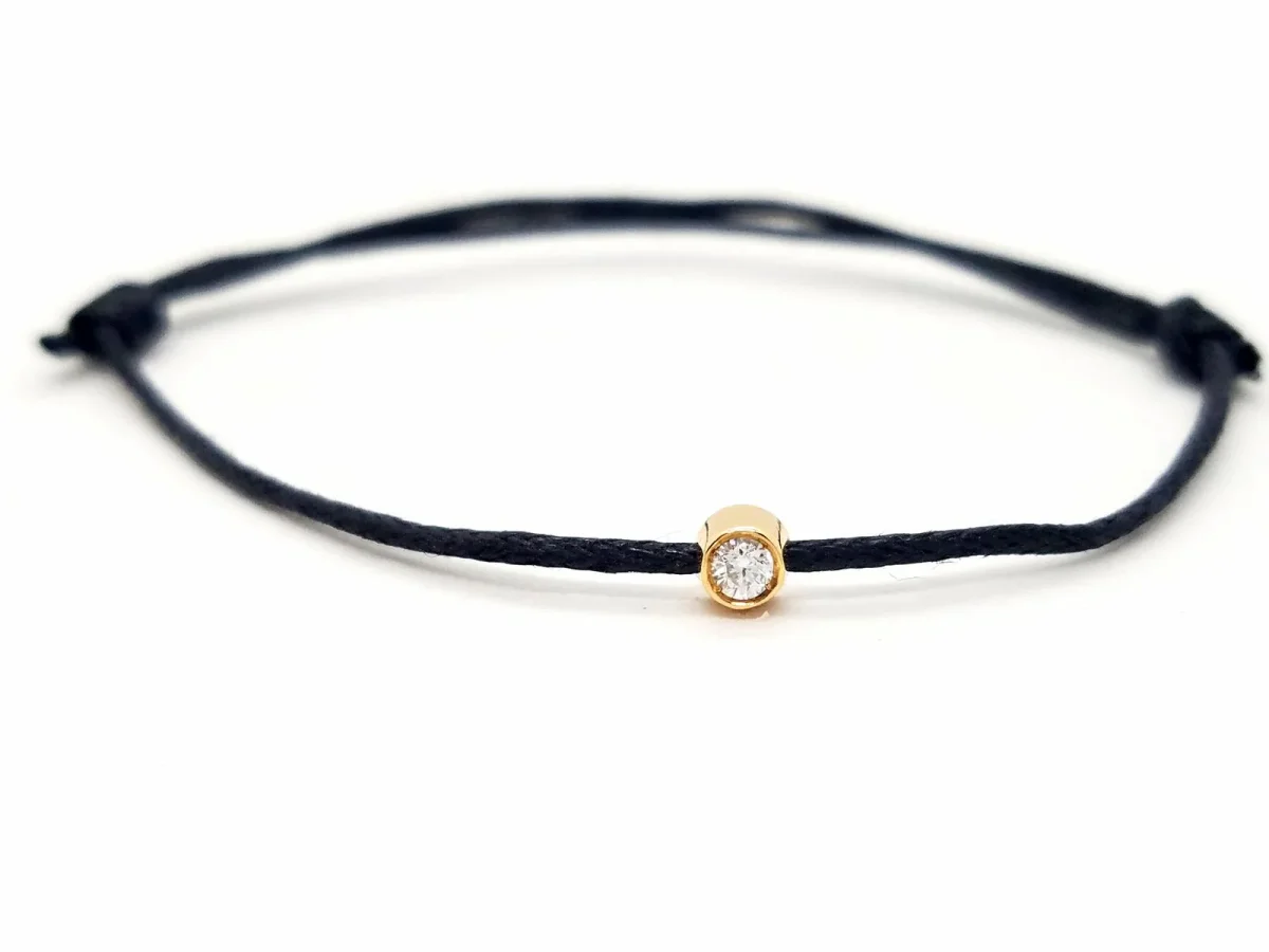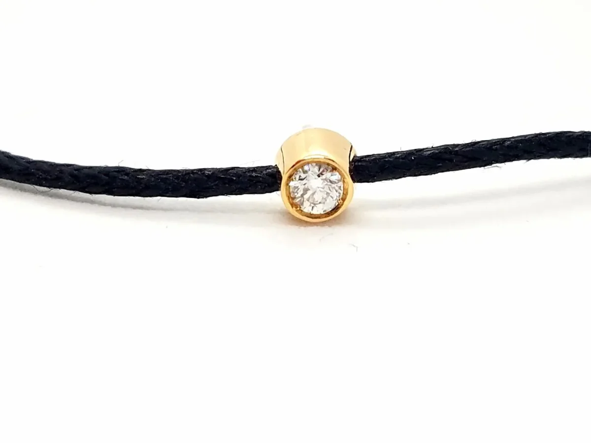 Bracelet cordon noir, composé d’un motif rond en or rose 750 millièmes (18 carats) avec un serti clos, diamant taille brillant G-VS pour un total de 0,04 ct, dimension du motif: 0,38 cm, poids en or: 0,18 g, poids total: 0,34 g, taille ajustable, état neuf