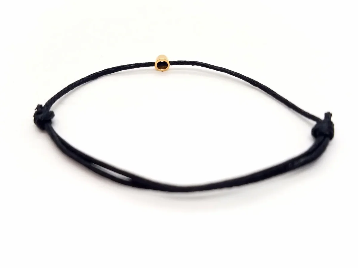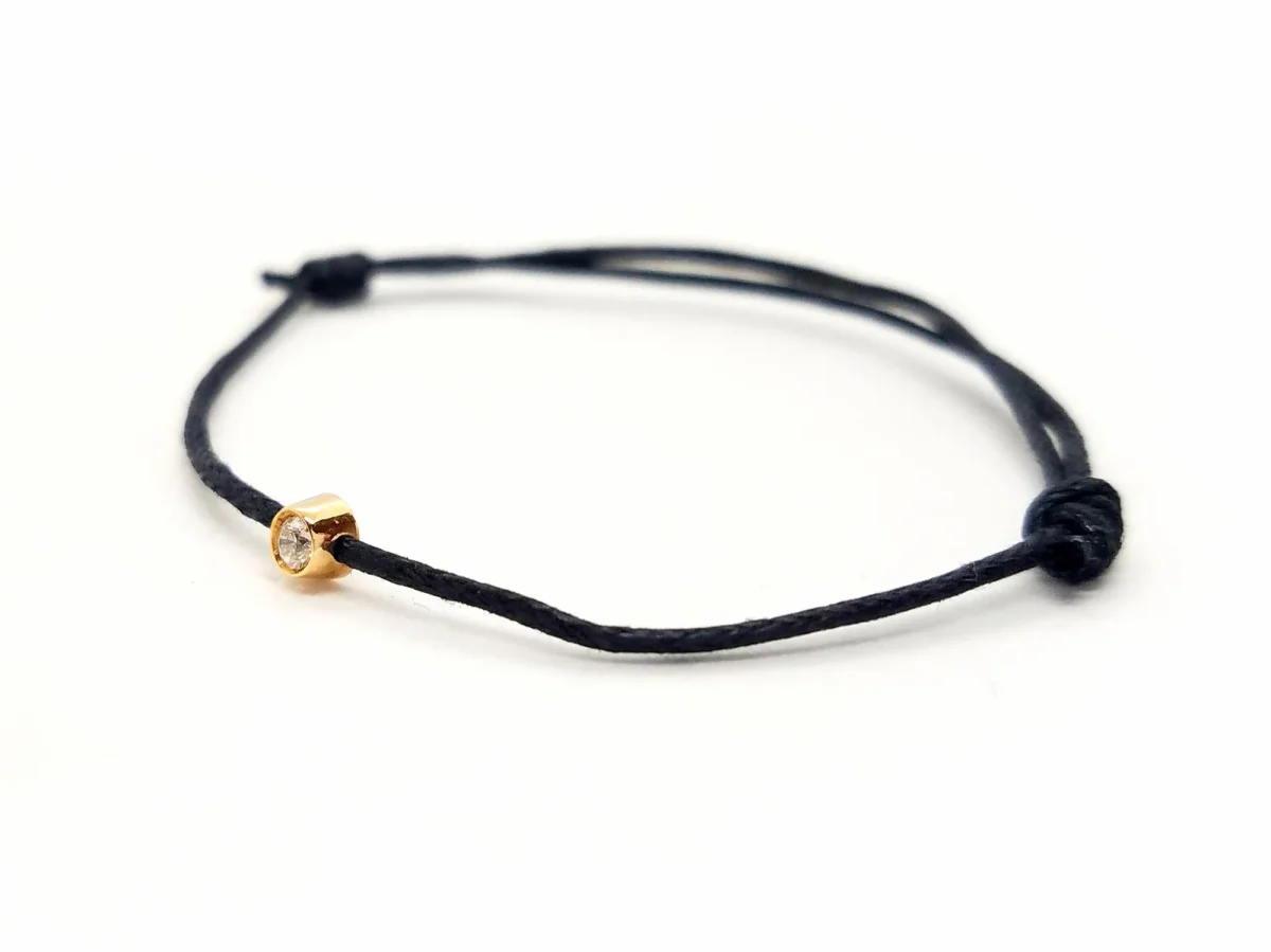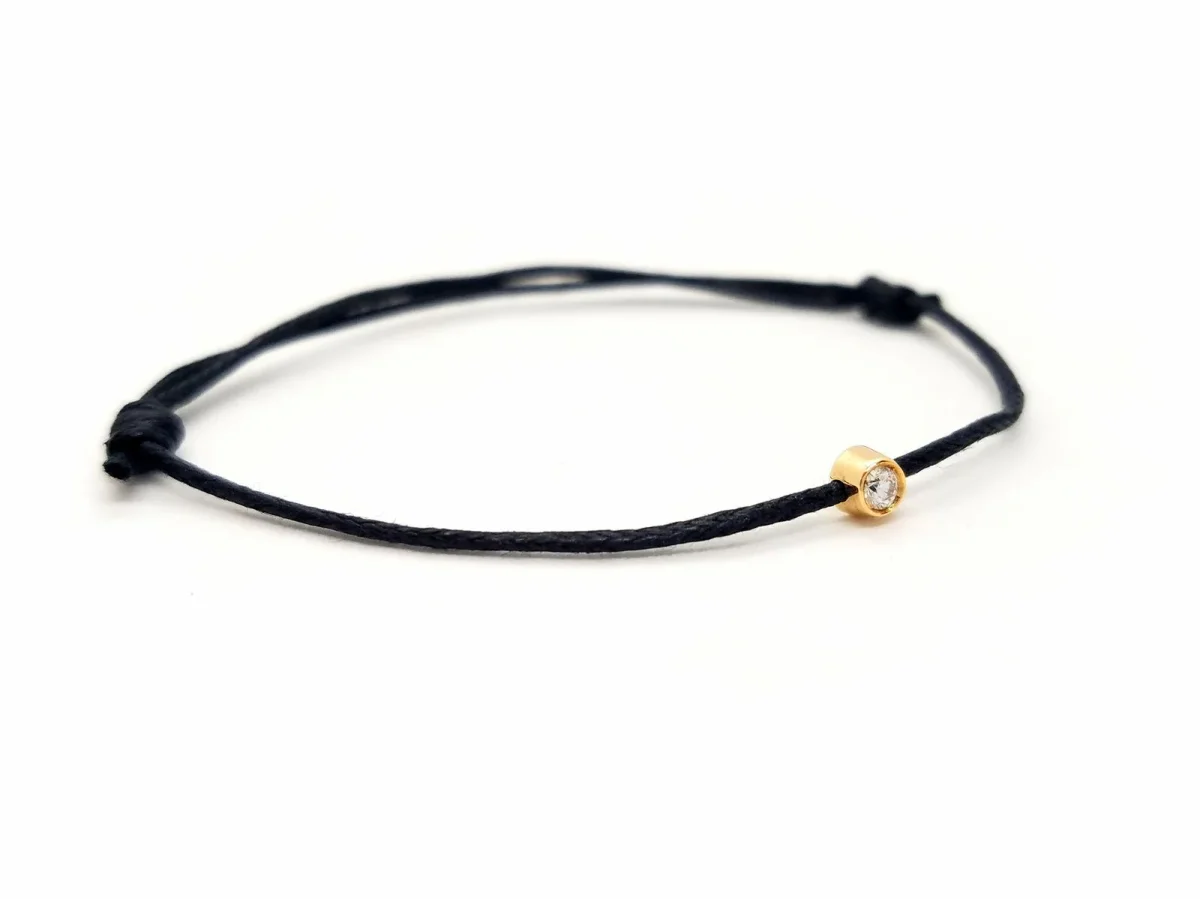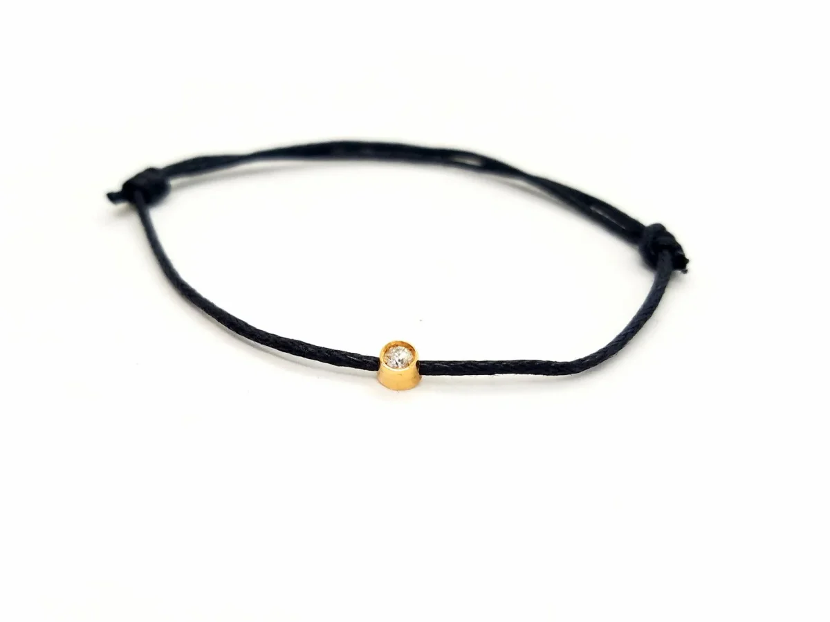 Bracelet cordon noir, composé d’un motif rond en or rose 750 millièmes (18 carats) avec un serti clos, diamant taille brillant G-VS pour un total de 0,04 ct, dimension du motif: 0,38 cm, poids en or: 0,18 g, poids total: 0,34 g, taille ajustable, état neuf