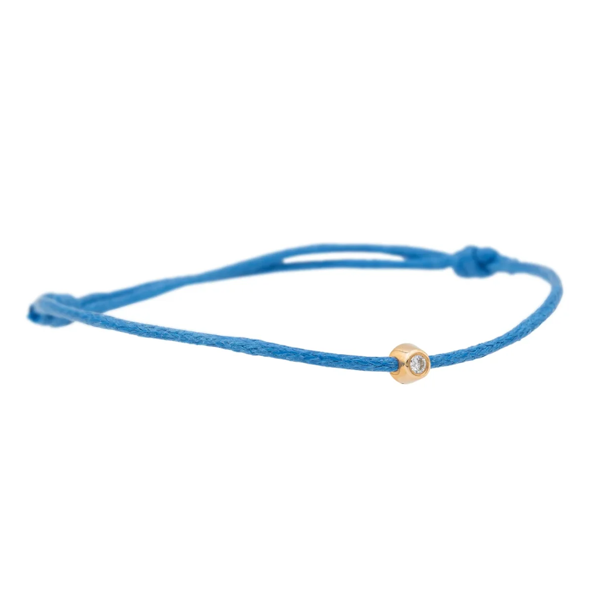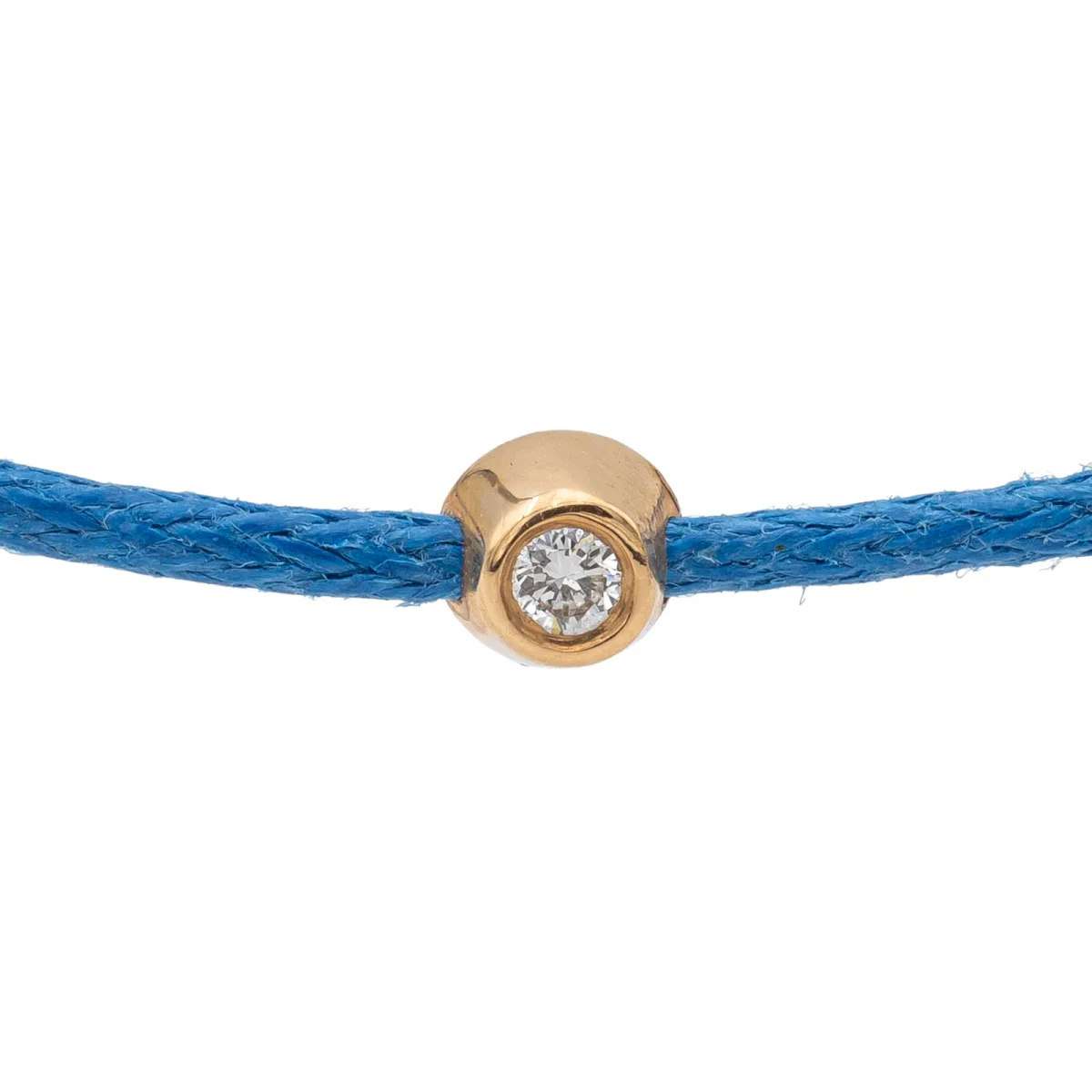 Bracelet cordon bleu, composé d’un motif rond en or rose 750 millièmes (18 carats) avec un serti clos, diamant taille brillant G-VS pour un total de 0,02 ct, dimension du motif: 0,36 cm, poids en or: 0,13 g, poids total: 0,35 g, taille ajustable, état neuf