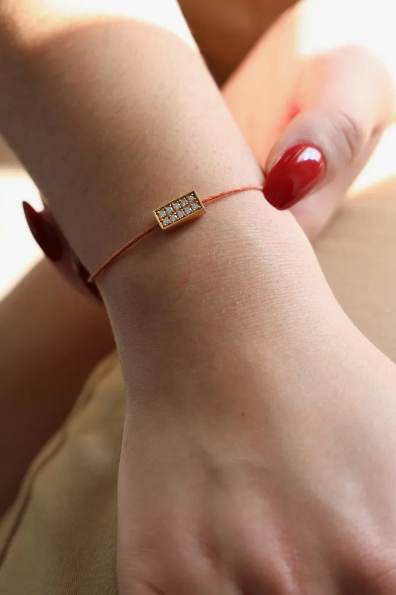 Bracelet cordon rouge, composé d’un motif rectangulaire en or rose 750 millièmes (18 carats), serti de 10 diamant taille brillant G-VS pour un total de 0,20 ct, dimension du motif: 1,15 cm x 0,6 cm, poids en or: 1,19 g, poids total: 1,34 g, taille ajustable, état neuf