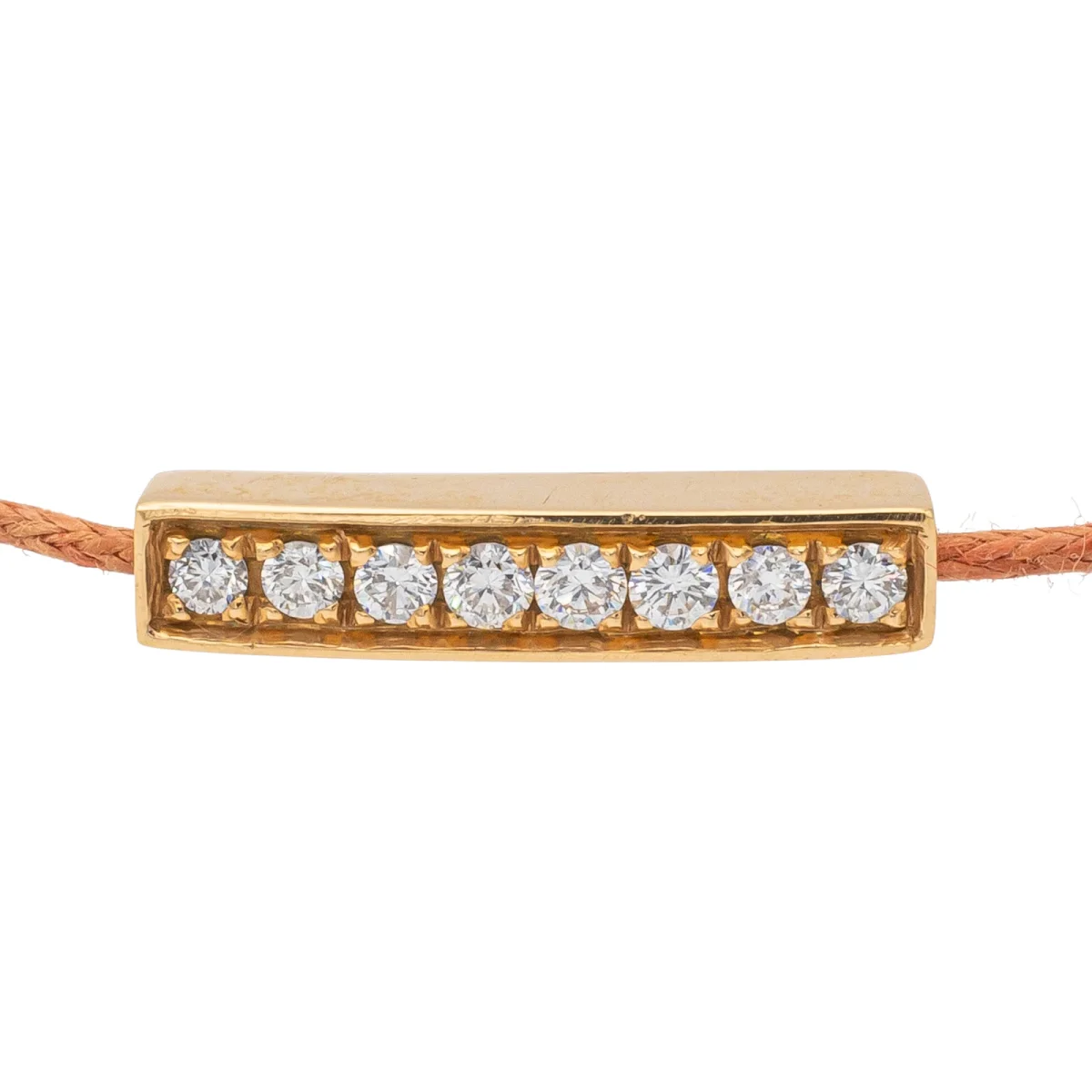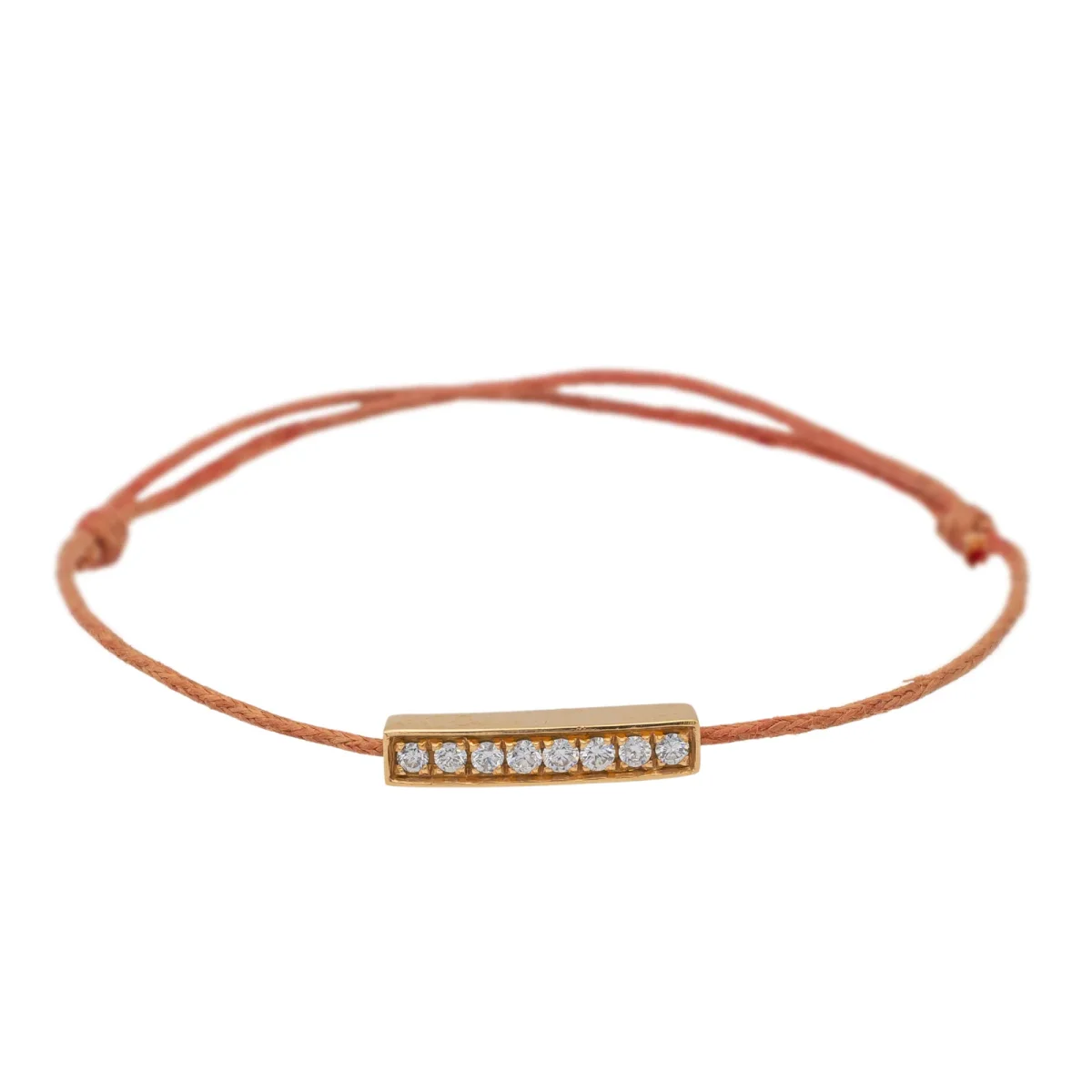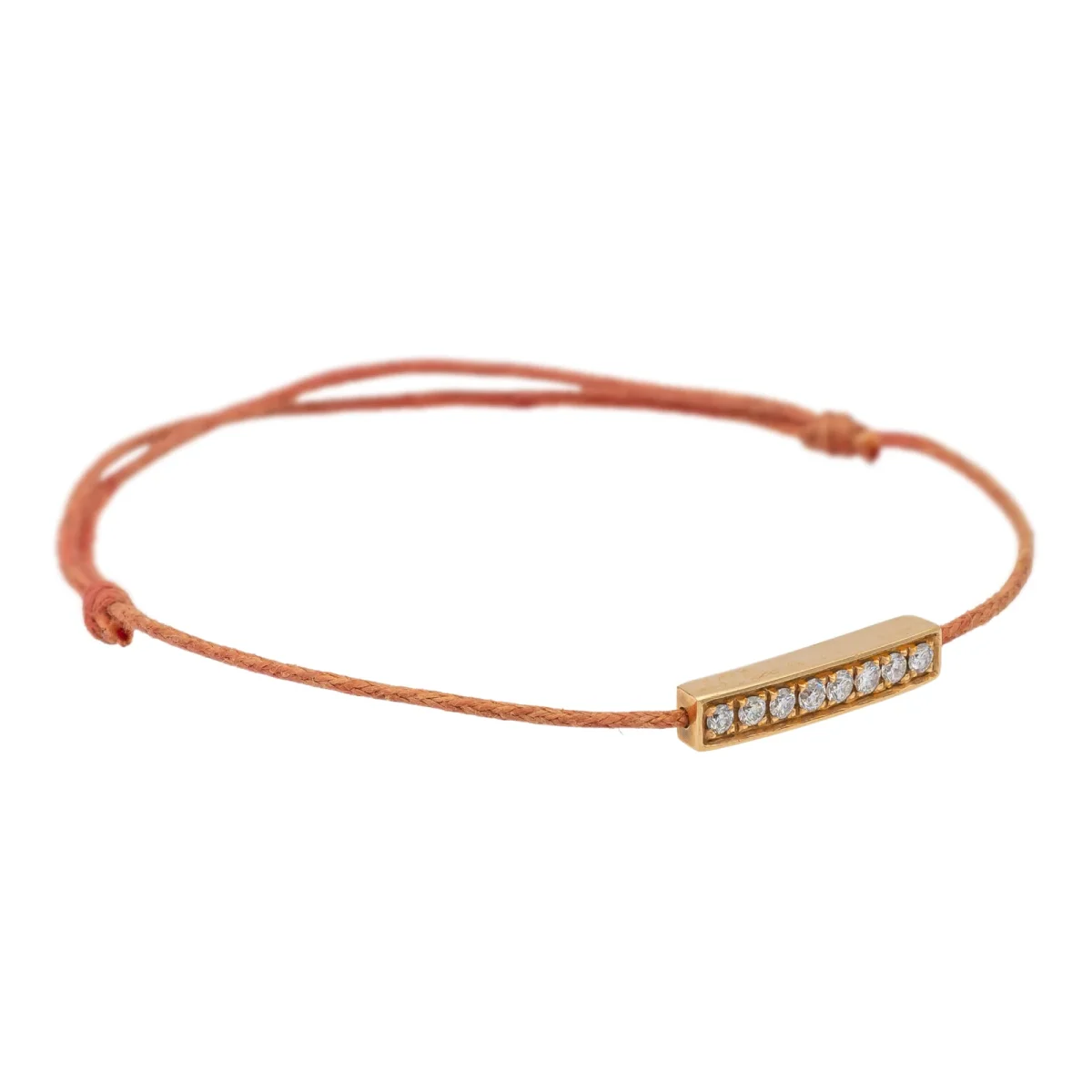 Bracelet cordon rouge, composé d’un motif rectangulaire en or rose 750 millièmes (18 carats), serti de 8 diamants taille brillant G-VS pour un total de 0,16 ct, dimension du motif: 1,69 cm x 0,34 cm, poids en or: 0,95 g, poids total: 1,10g, taille ajustable, état neuf