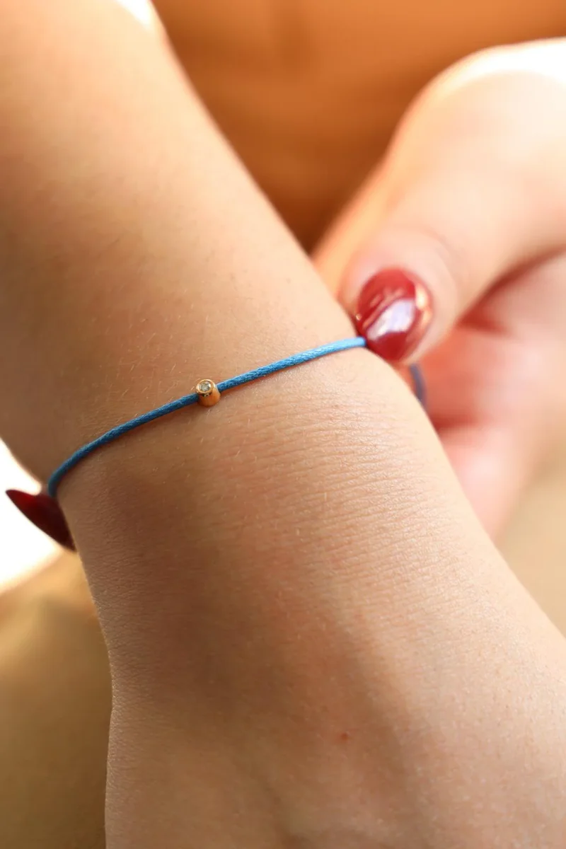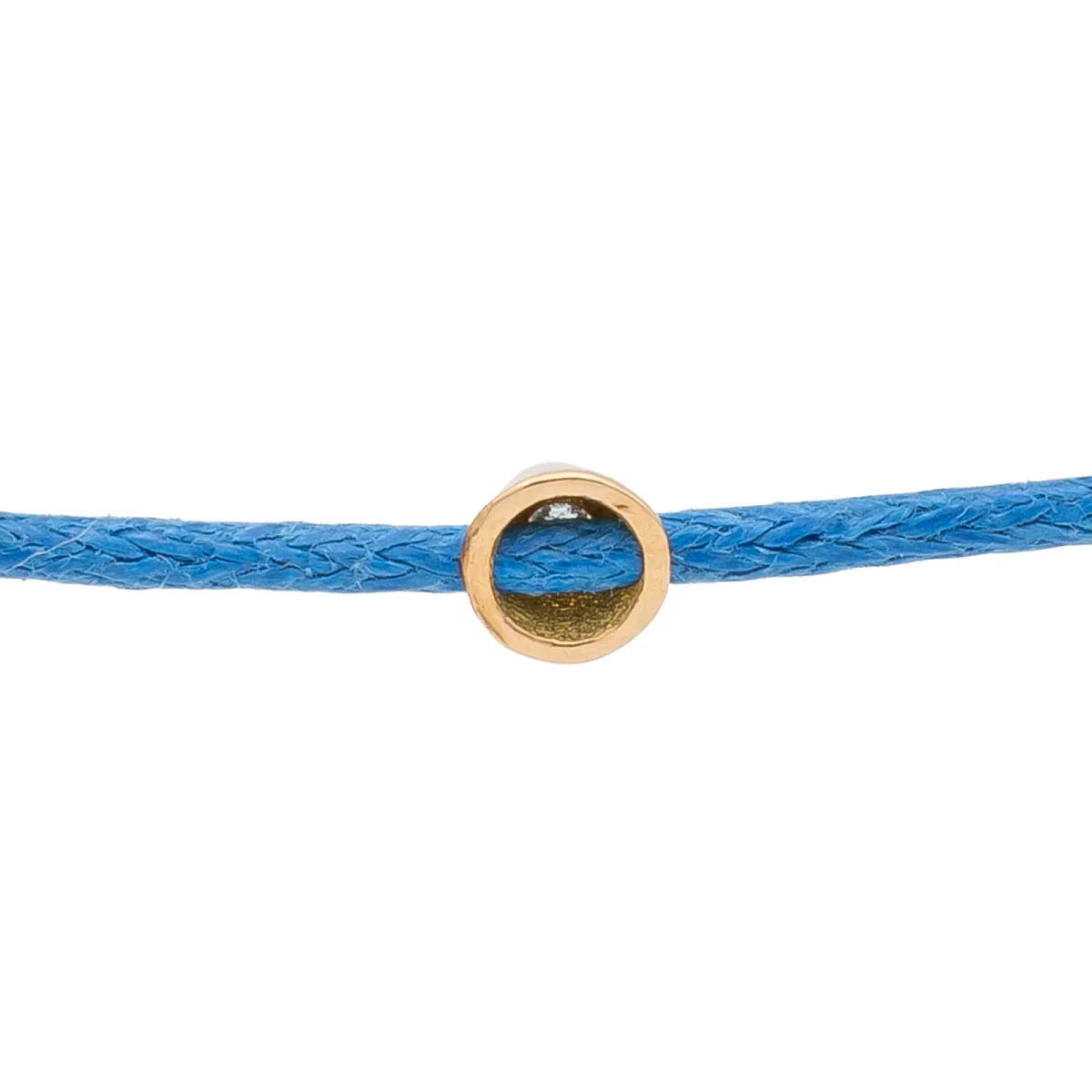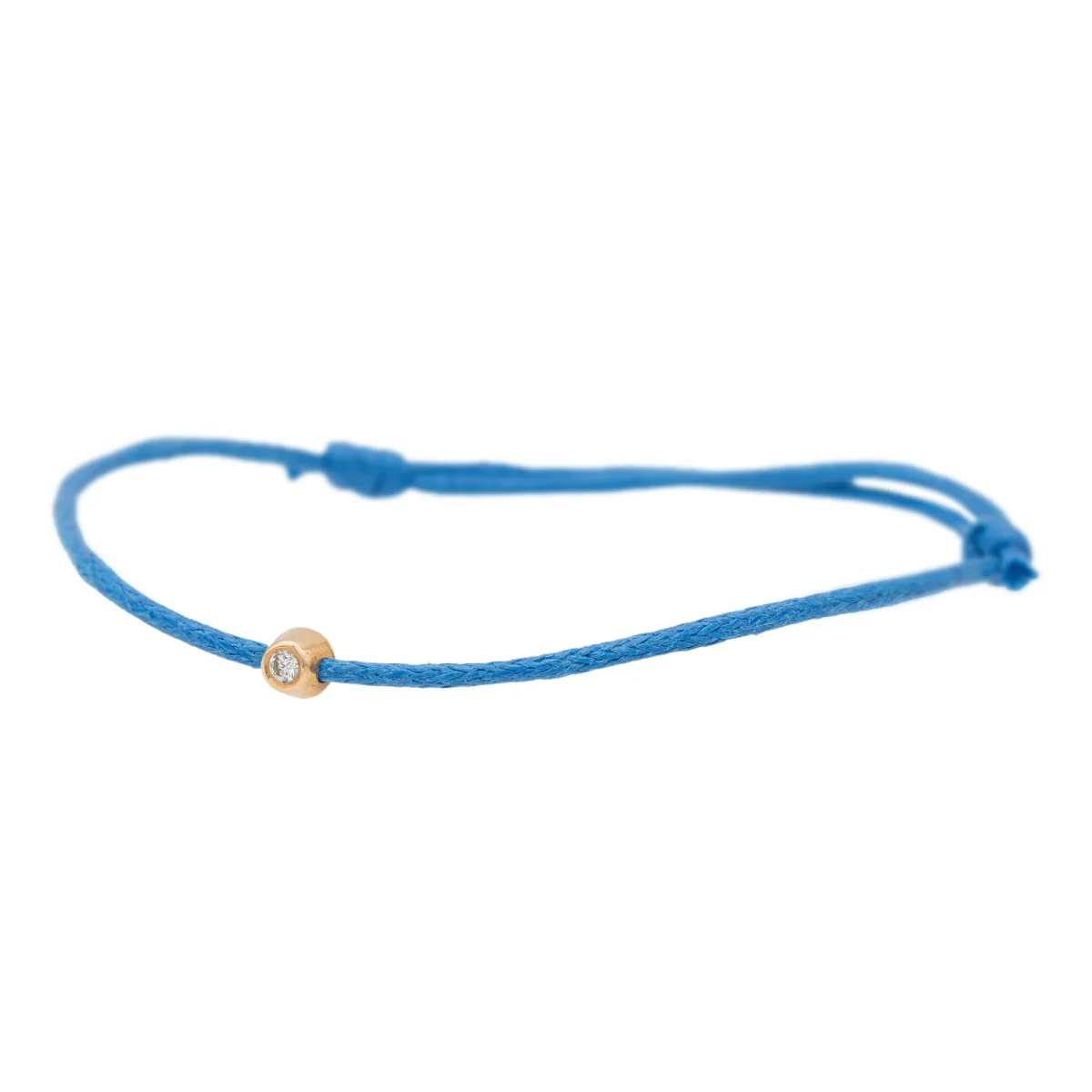 Bracelet cordon bleu, composé d’un motif rond en or rose 750 millièmes (18 carats) avec un serti clos, diamant taille brillant G-VS pour un total de 0,02 ct, dimension du motif: 0,35 cm, poids en or: 0,15 g, poids total: 0,38 g, taille ajustable, état neuf