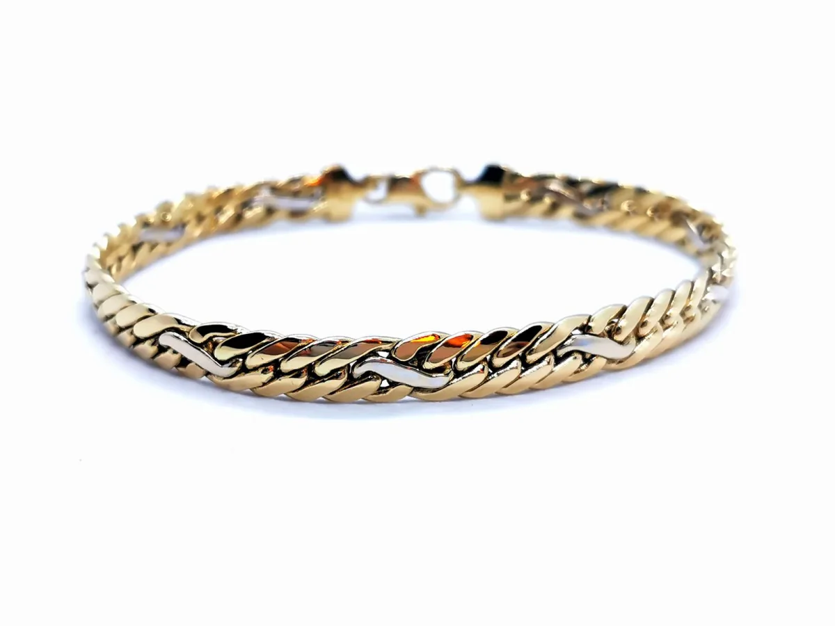 Bracelet en or jaune et blanc 750 millièmes (18 carats), maille anglaise, longueur: 19 cm, largeur: 0,62 cm, épaisseur: 0,25 cm, poids total: 8,06 g, poinçon tête d’aigle, excellent état