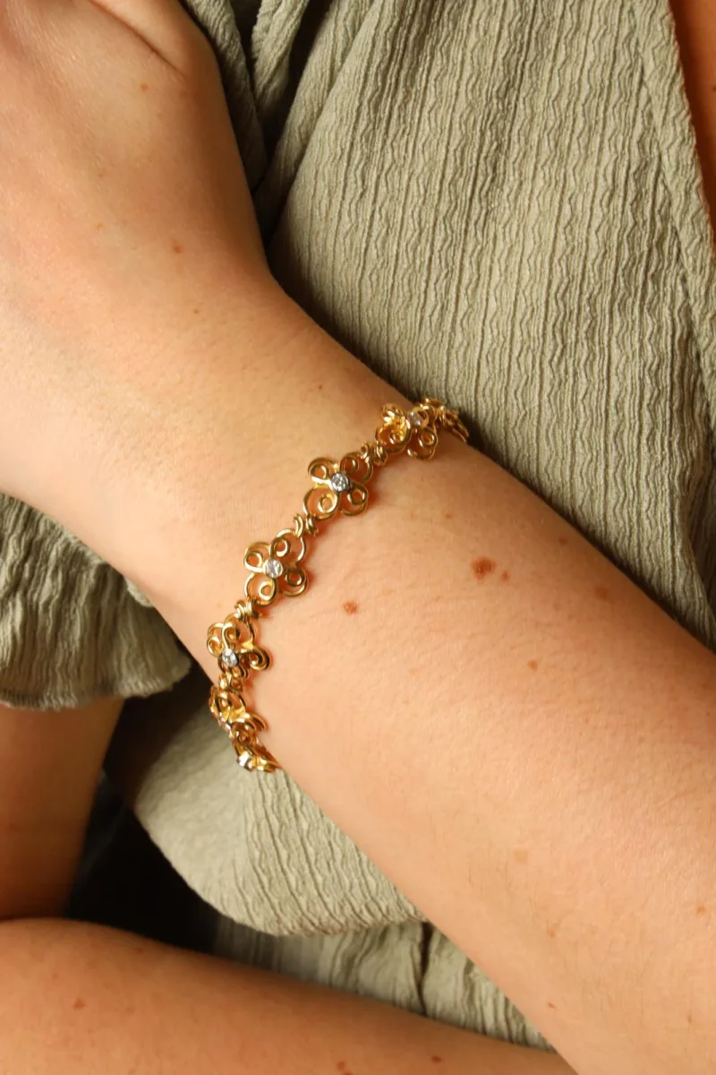 Bracelet filigrané or jaune 750 millièmes (18 carats), serti de 11 diamants taille brillant, environ H/VS, poids total des diamants : environ 0,77 ct, longueur: 18 cm, largeur: 1,16 cm, épaisseur: 0,4 cm, fermoir languette, huit de sécurité, poids total: 19,43 g, poinçon tête de rhinocéros, excellent état