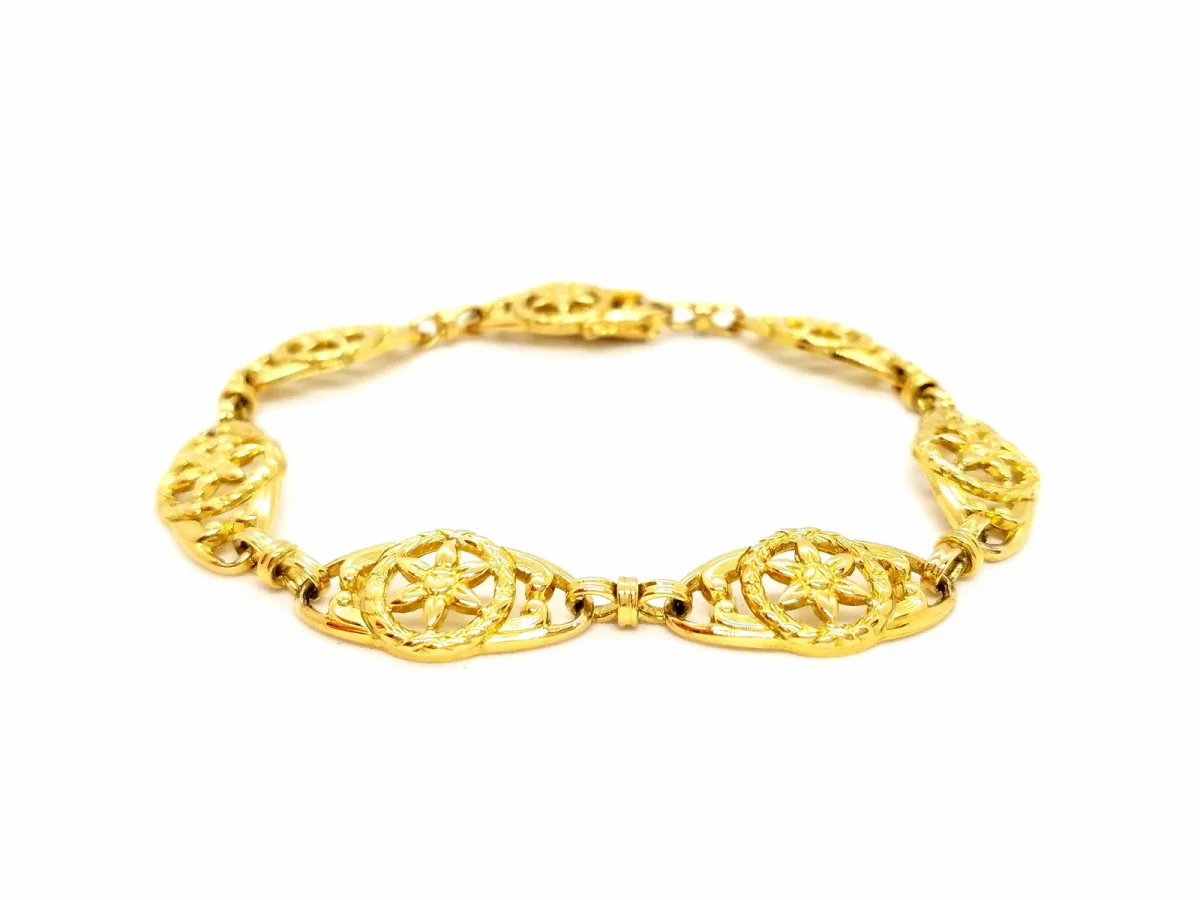 Bracelet filigrane en or jaune 750 millièmes (18 carats), motif floral, longueur: 18,5 cm, largeur: 1,05 cm, épaisseur: 0,24 cm, fermoir avec huit de sécurité, poids total: 18,09 g, poinçon tête d’aigle, excellent état