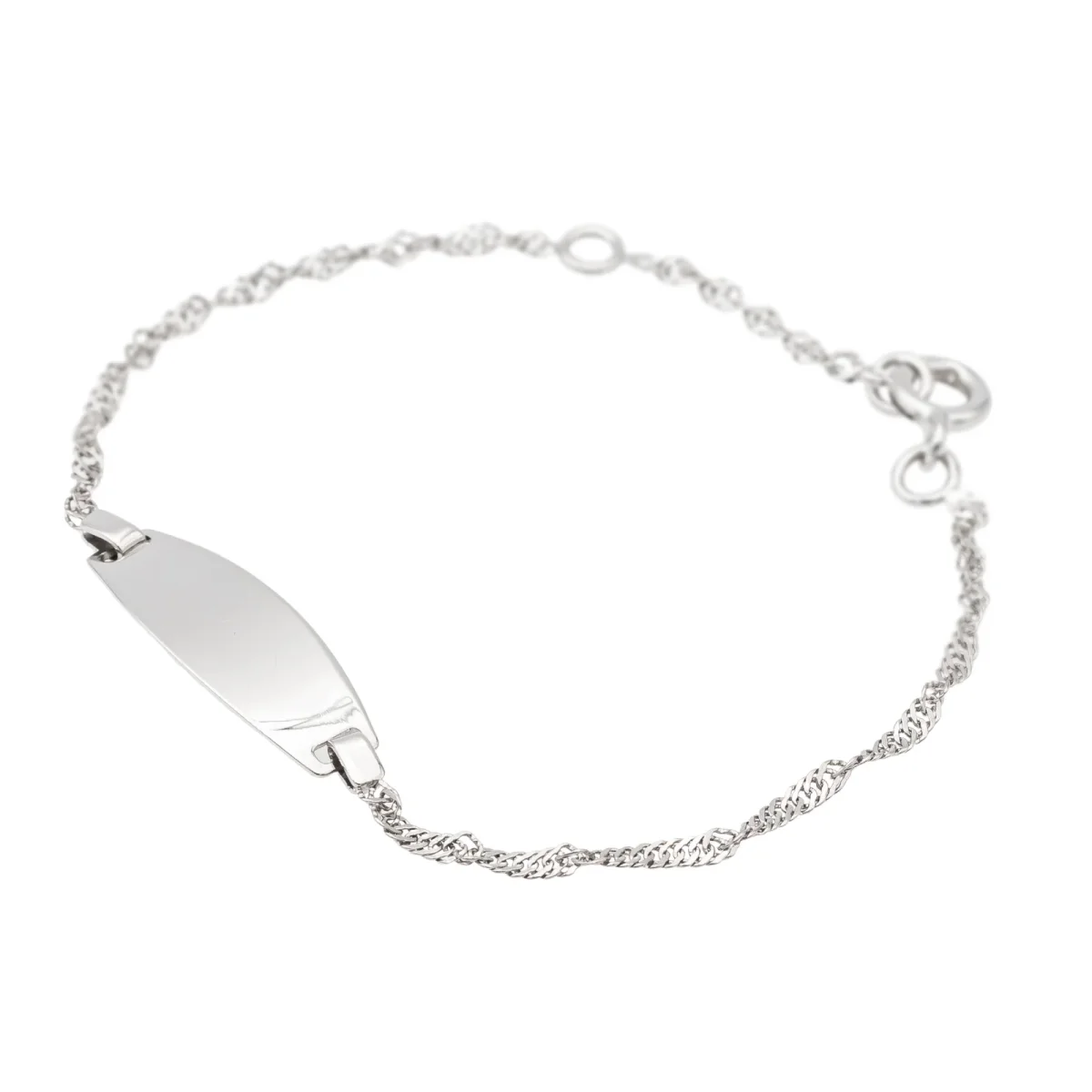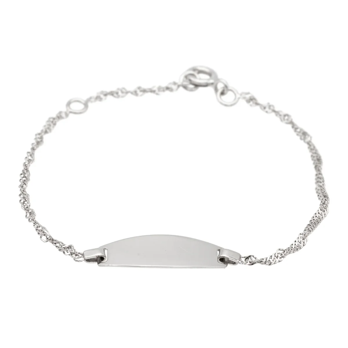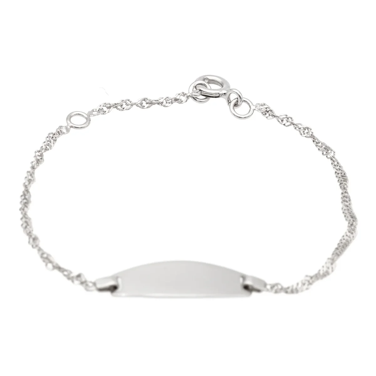 Bracelet gourmette bébé, en or blanc 750 millièmes (18 carats) testé, maille gourmette torsadée, dimensions de la plaque ovale: 1,82 cm X 0,64 cm, longueur: 13,5 cm avec anneau intermédiaire à 12,5 cm, poids total: 1,40 g, état neuf.