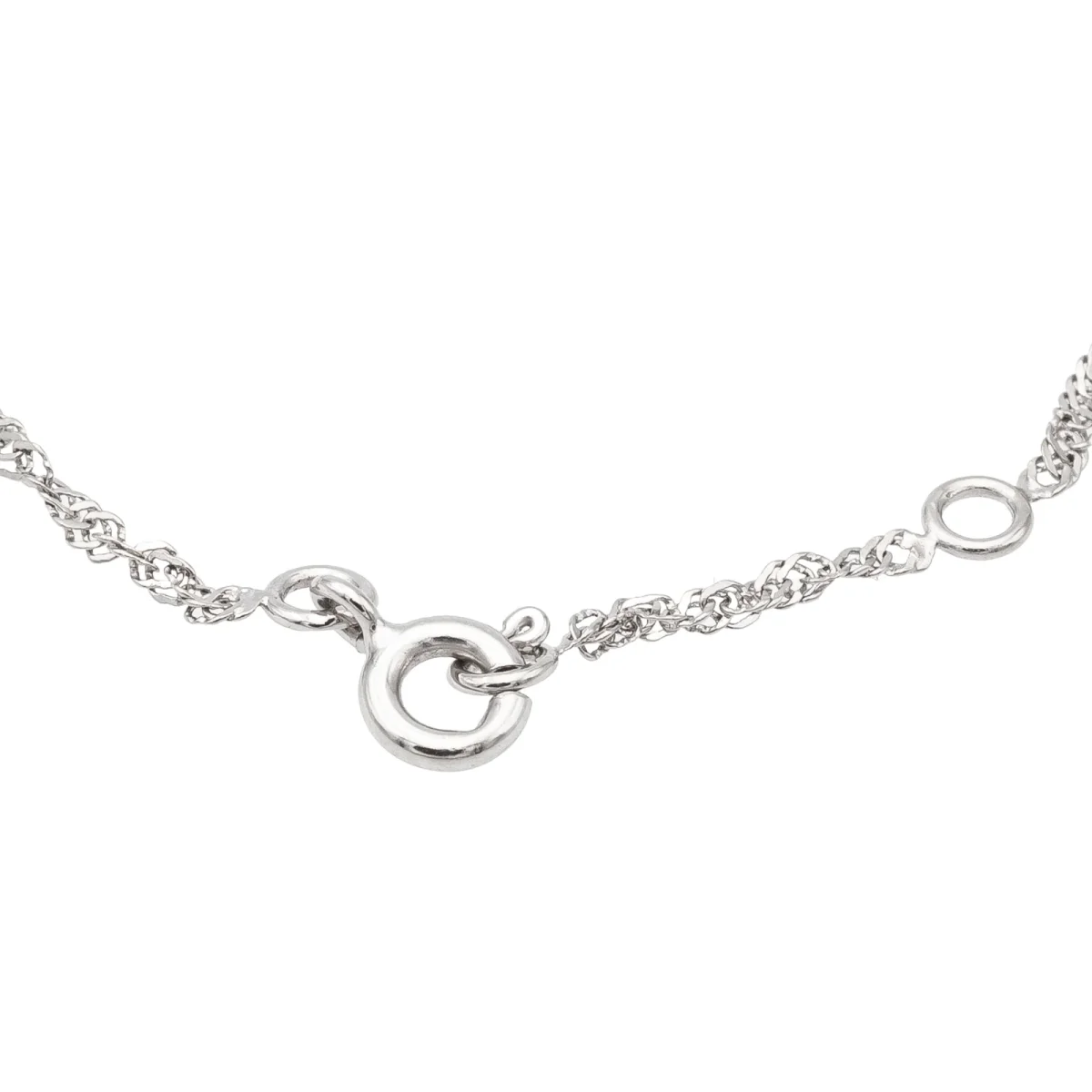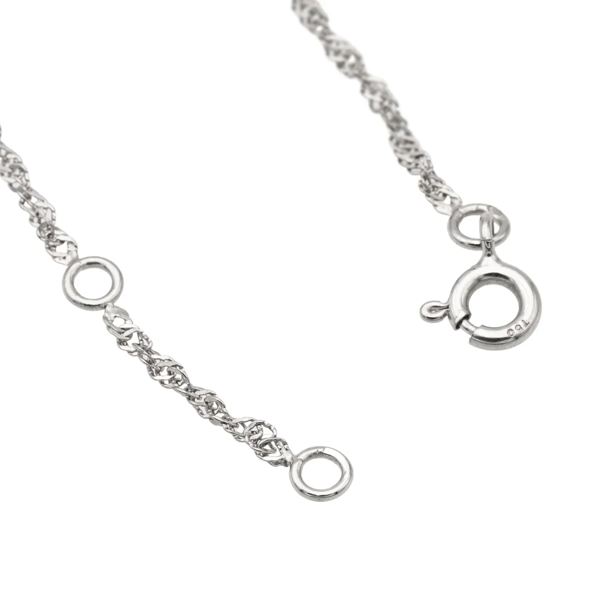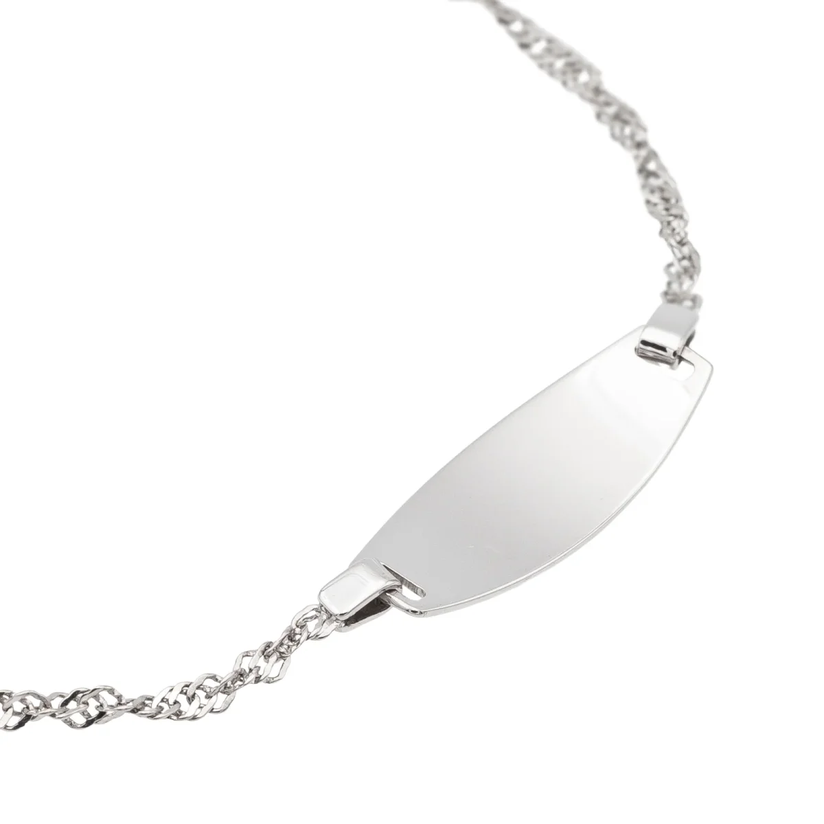 Bracelet gourmette bébé, en or blanc 750 millièmes (18 carats) testé, maille gourmette torsadée, dimensions de la plaque ovale: 1,82 cm X 0,64 cm, longueur: 13,5 cm avec anneau intermédiaire à 12,5 cm, poids total: 1,40 g, état neuf.
