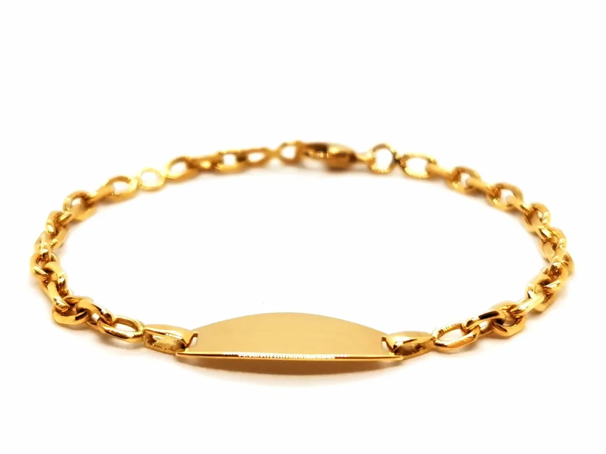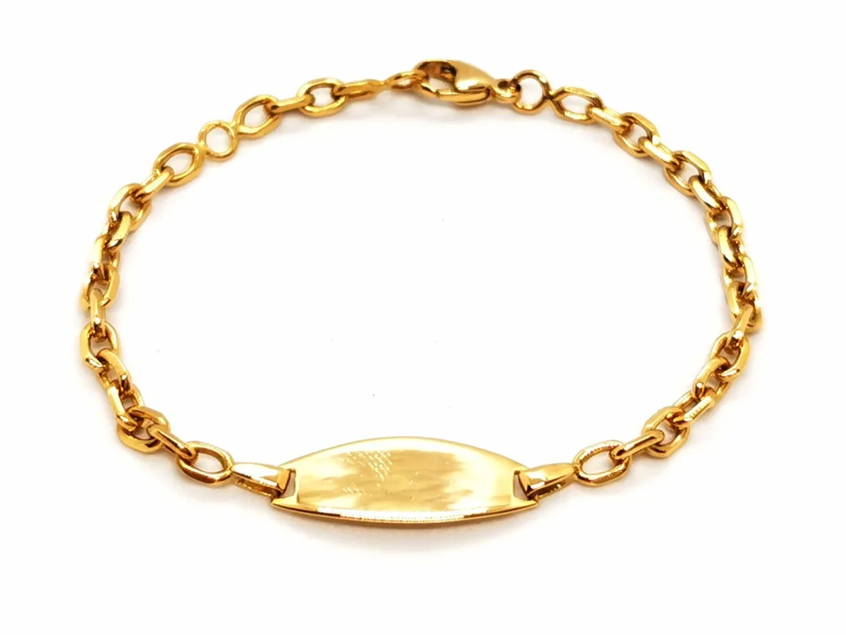 Bracelet gourmette enfant, en or jaune 750 millièmes (18 carats), longueur: 14 cm, largeur: 0,29, dimensions plaque: 1,83 cm X 0,66 cm, poids total: 4,29 g, poinçon tête d’aigle, excellent état.