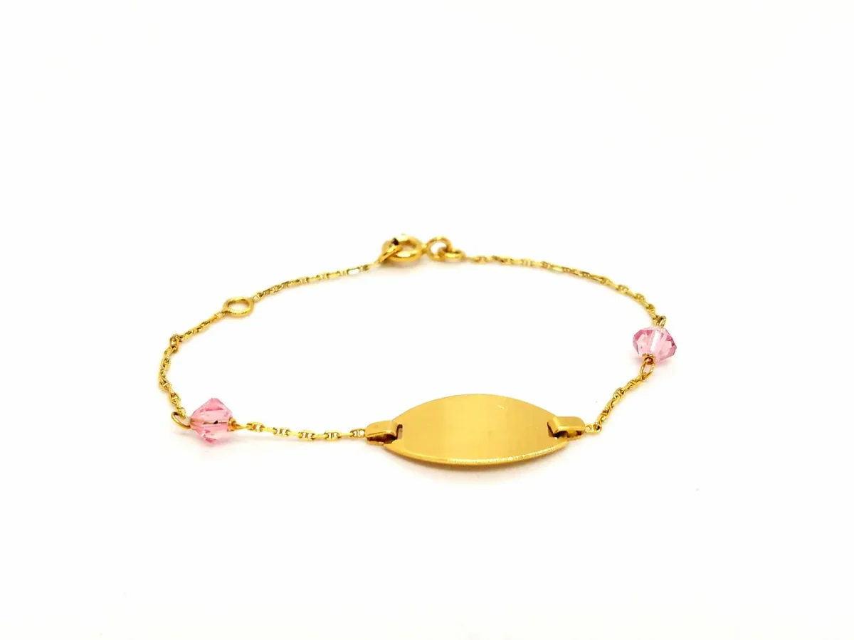 Bracelet en or jaune 750 millièmes (18 carats) testé, gourmette enfant, deux perles en verre rose, longueur: 14,5 cm, largeur chaîne: 0,09 cm, dimensions plaque: 1,71 cm x 0,89 cm, dimensions perles: 0,4 cm x 0,4 cm, poids total: 1,74 g, état neuf