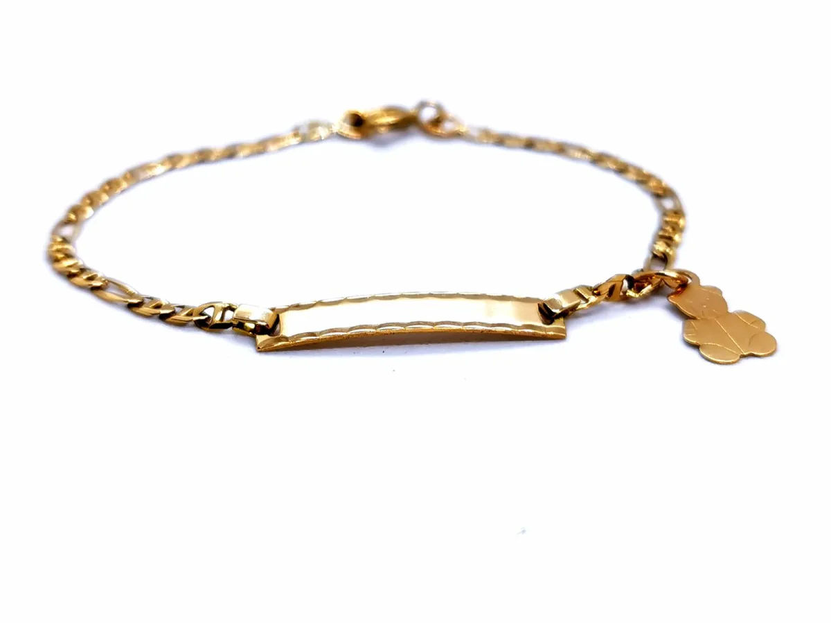 Bracelet en or jaune 750 millièmes (18 carats), gourmette bébé, plaque rectangulaire, taille: 14 cm, chaîne maille forçat, largeur chaîne: 0,23 cm, dimensions plaque: 2,18 cm x 0,38cm, pampille motif Ours, dimensions ours: 1,13 cm x 0,65 cm, poids total: 2,44g, poinçon tête d’aigle, excellent état