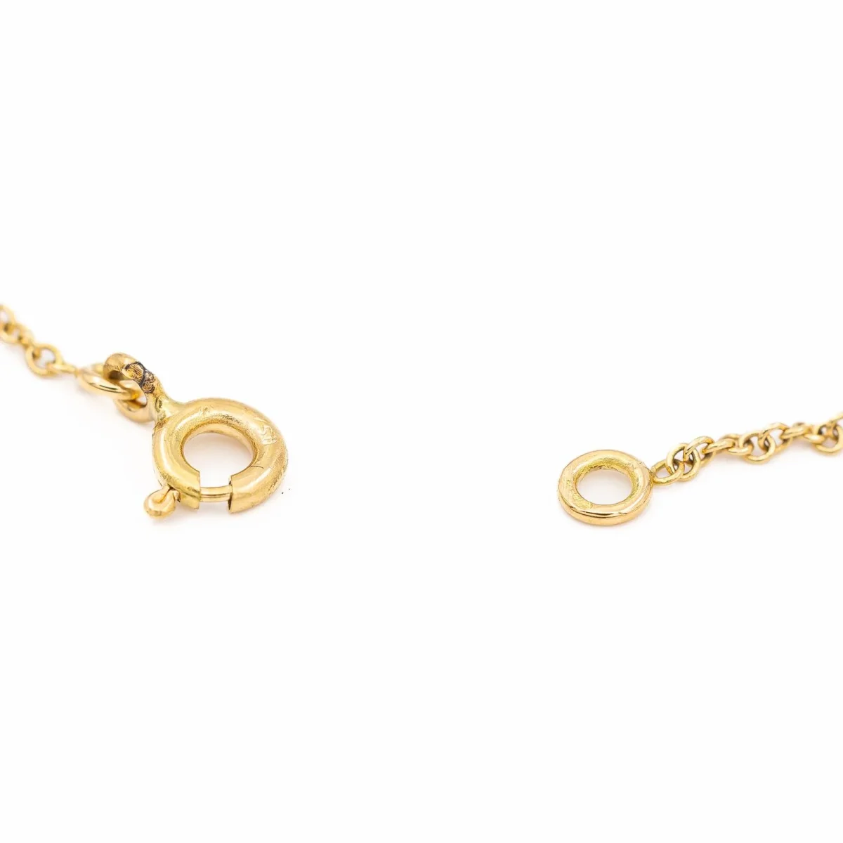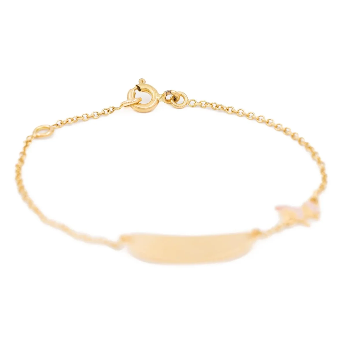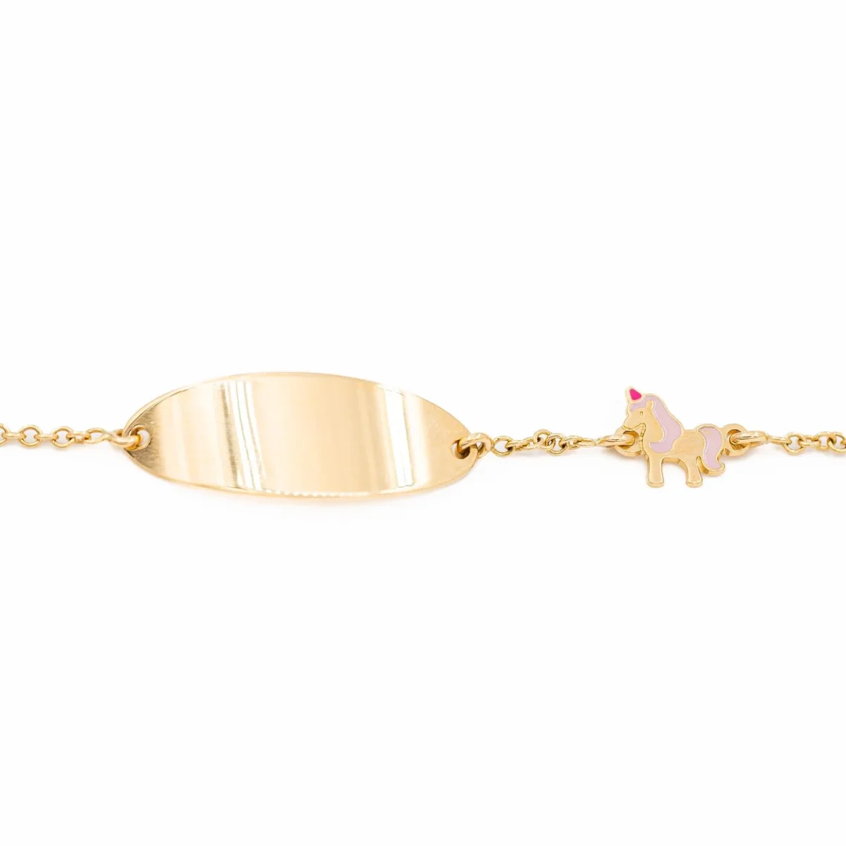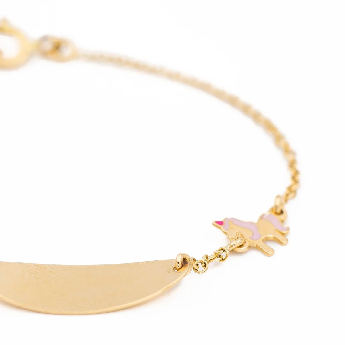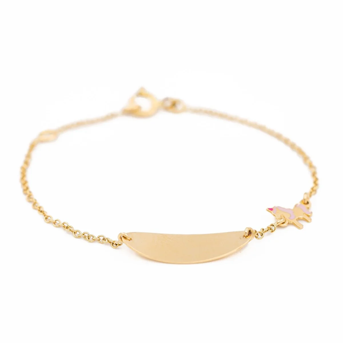 Bracelet gourmette pour bébé, en or jaune 750 millièmes (18 carats) testé, avec une licorne émaillée en petit maillon, Fermoir ajustable avec anneau ressort, Dimensions gourmette : 1,93 x 0,70 cm, Dimensions de la licorne: 0,60 x 0,60 cm, Poids total: 1,55 g, Excellent état