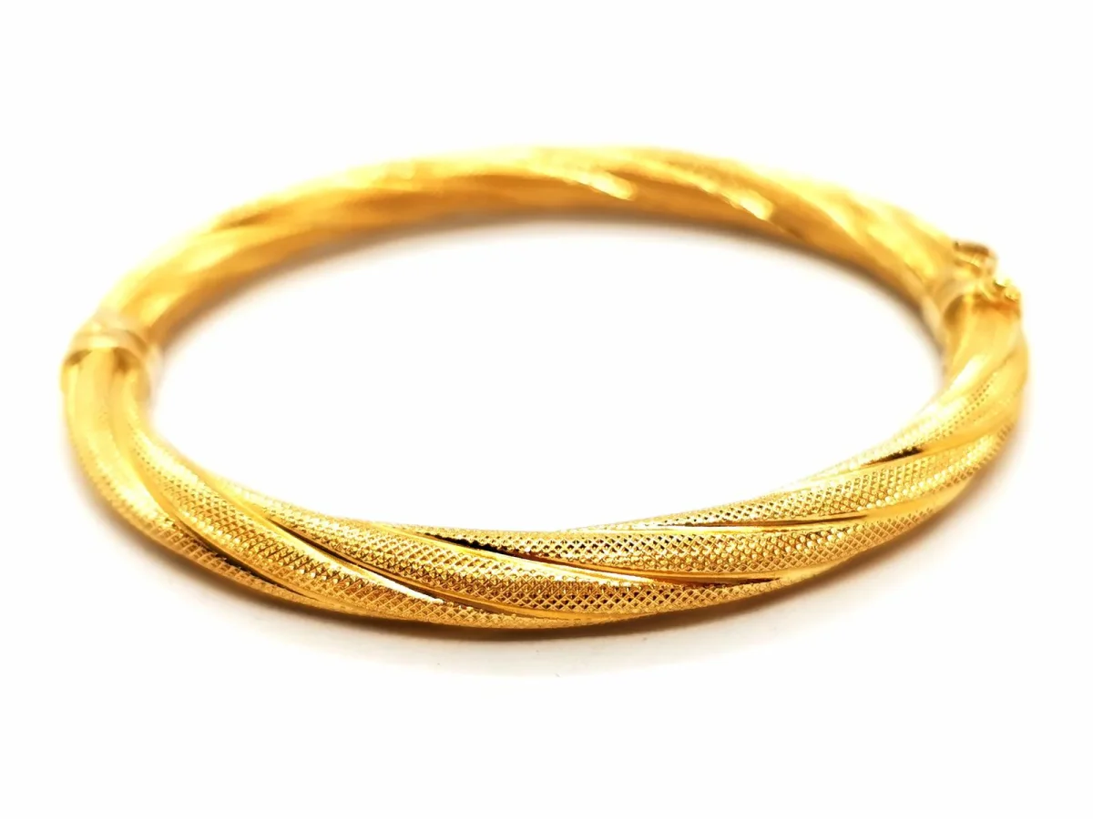 Bracelet jonc ovale ouvrant, en or jaune 750 millièmes (18 carats), motif torsadé, longueur : 17,5 cm, largeur: 0,58 cm, poids total: 13,52 g, fermoir languette avec huit de sécurité, poinçon tête d’aigle à demi-effacé, excellent état