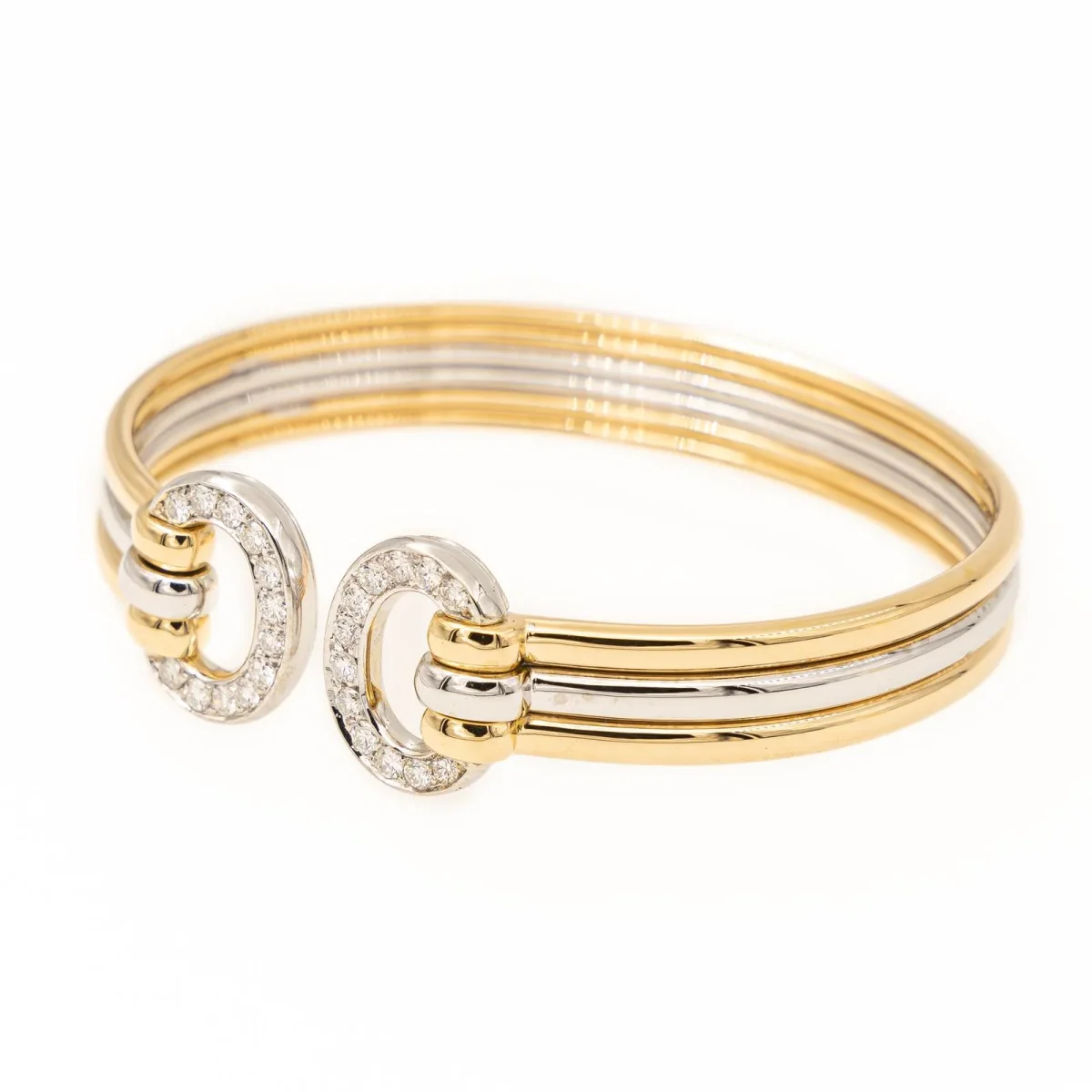 Bracelet jonc or jaune et blanc 750 millièmes (18 carats), serti de24 diamants, ouvert et fini par deux motifs ovales endiamantés, 3 brins à fil rond dont un en or blanc, 24 diamants taille brillant, environ G-VS, d’un poids total d’environ 0,84 ct, (chaque diamant d’un poids d’environ 0,035 ct), dimensions de chaque motif: 1,59 cm X 1,39 cm, largeur d’un brin: 0,29 cm, largeur: 0,85 cm, longueur: 18,0 cm, poids total: 21,99 g, poinçon tête d’aigle, excellent état