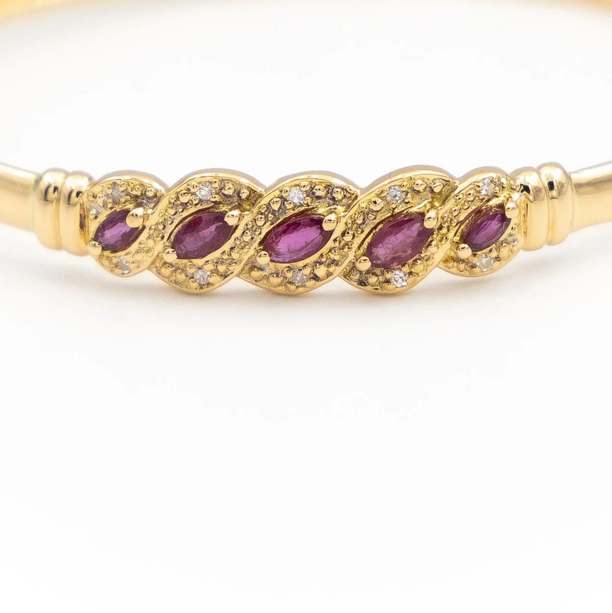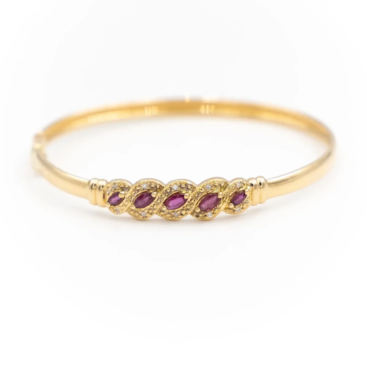 Bracelet en or jaune 750 millièmes (18 carats), serti de 5 rubis de taille marquise, 2 d’environ 0,09 ct chacun, 2 de 0,17 ct et 1 de 0,15 ct, Poids total des rubis: 0,67 ct, et 10 diamants de taille brillant d’environ 0,01 ct chacun, estimés G/VS, Poids total des diamants: 0,10 ct, Tour de poignet: 17 cm, Largeur: 0,82 cm, Poids total: 9,26 g, Poinçon tête d’aigle, Excellent état