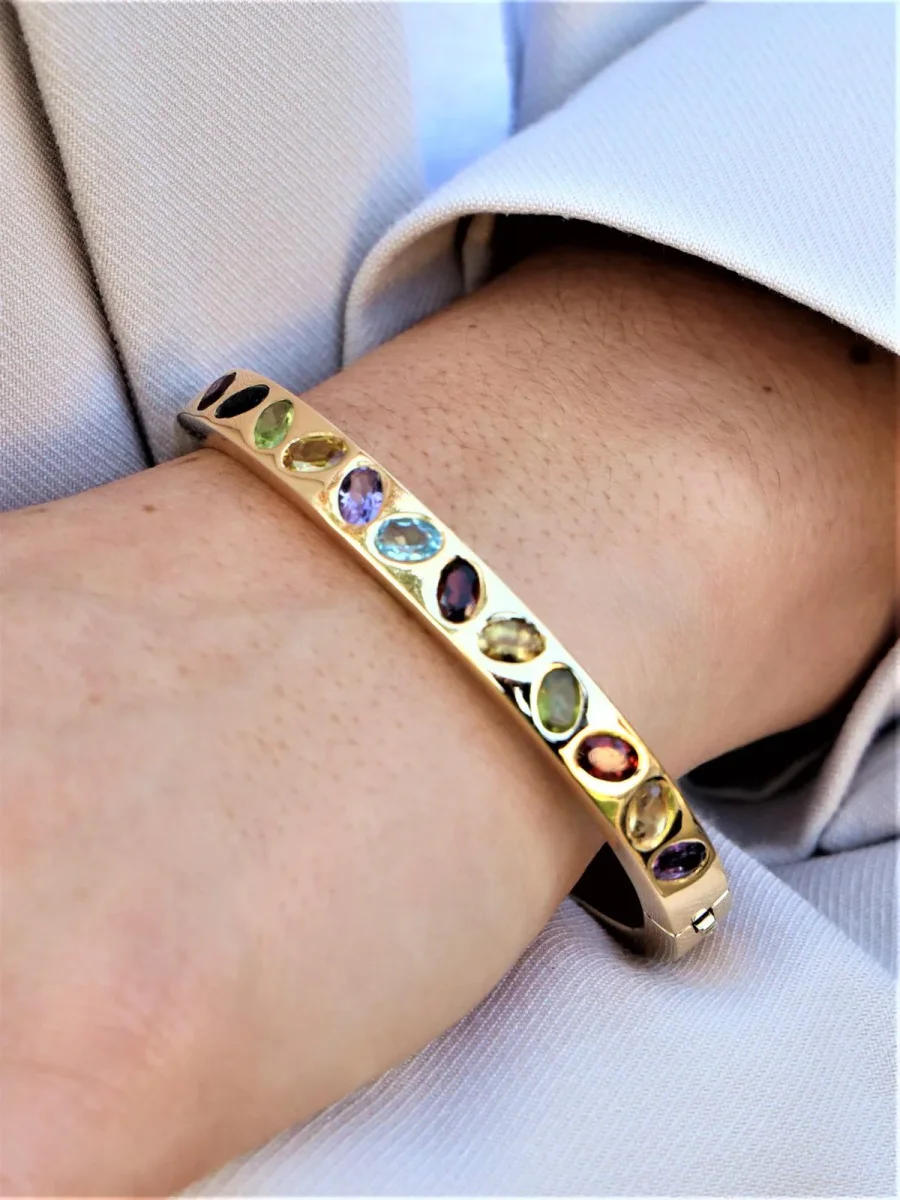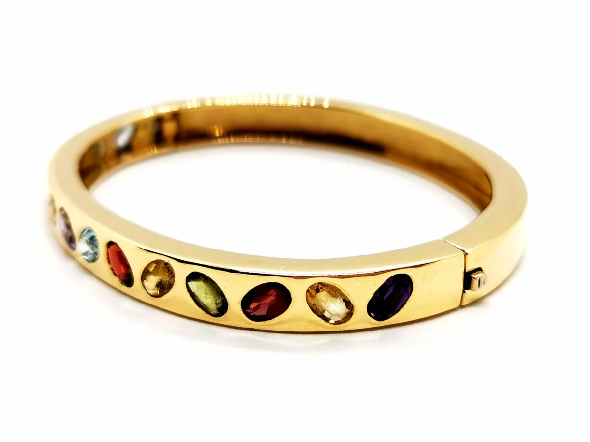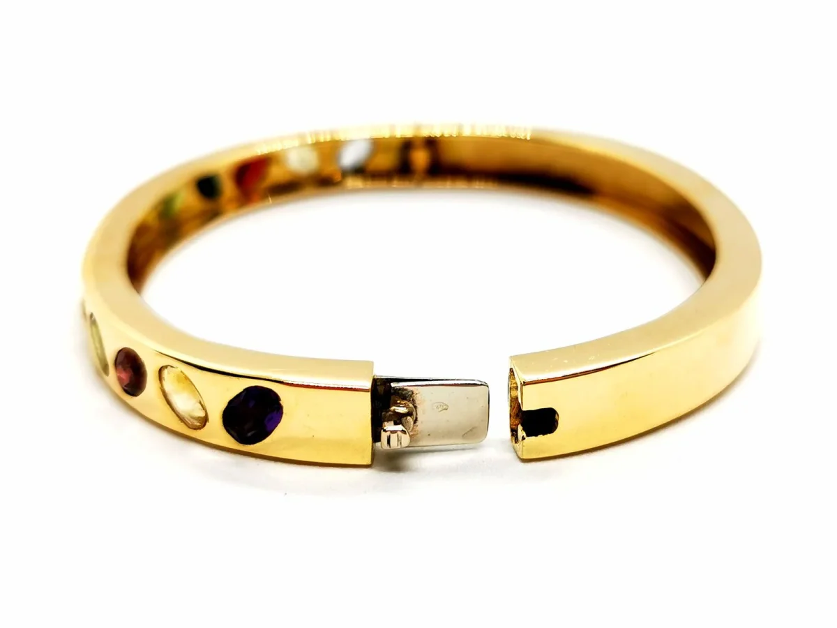 Bracelet jonc ouvrant, en or jaune 750 millièmes (18 carats), forme ovale, composé de 14 pierres ovales, serti clos, deux améthystes ( environ 0,19 ct chacune) , citrine (environ 0,13 ct), 3 grenats (environ 0,37) ct et deux d’environ 0,29 chacun), tourmaline (environ 0,27), deux péridots ( un d’environ 0,22 ct et 0,20 ct ), saphir jaune (environ 0,32 ct) , topaze (environ 0,29 ct ), quartz jaune (environ 0,22 ct), spinelle rouge (environ 0,29 ct), saphir violet (environ 0,26 ct), taille : 17,5 cm, largeur du bracelet 6 cm, épaisseur 0,7 cm, poids total : 43,39 g, poinçon tête d’aigle, excellent état