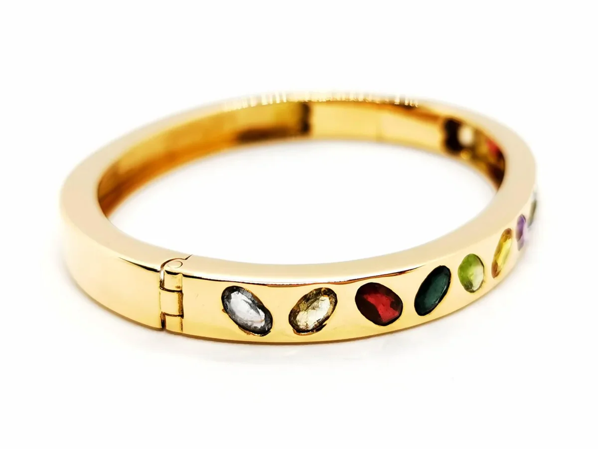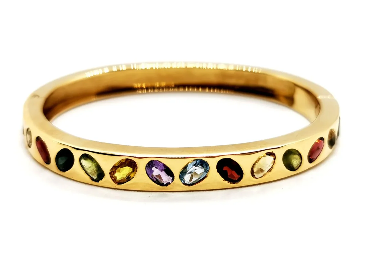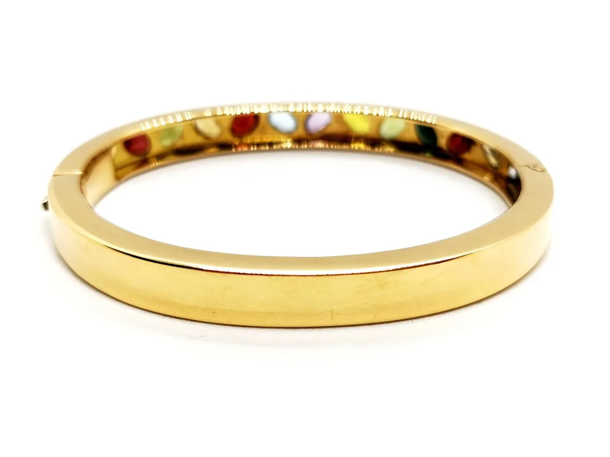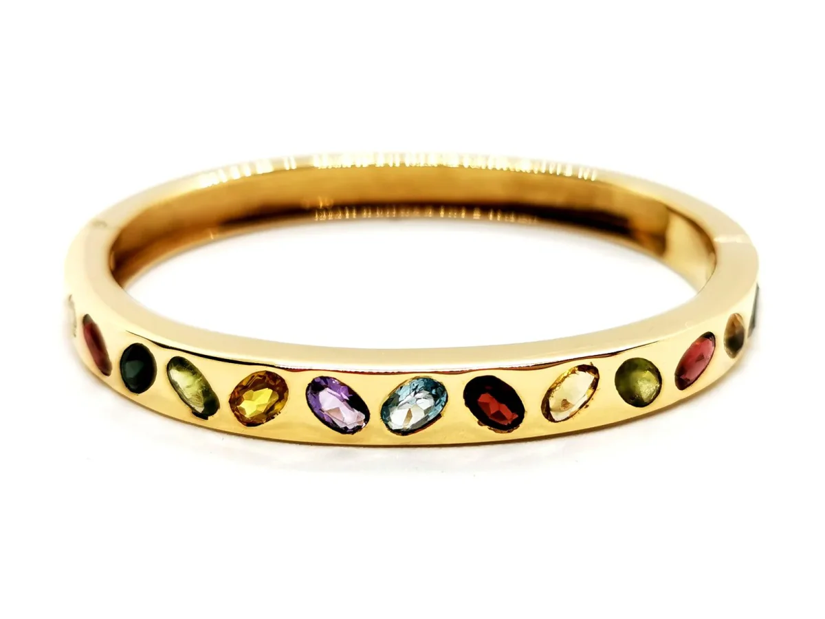 Bracelet jonc ouvrant, en or jaune 750 millièmes (18 carats), forme ovale, composé de 14 pierres ovales, serti clos, deux améthystes ( environ 0,19 ct chacune) , citrine (environ 0,13 ct), 3 grenats (environ 0,37) ct et deux d’environ 0,29 chacun), tourmaline (environ 0,27), deux péridots ( un d’environ 0,22 ct et 0,20 ct ), saphir jaune (environ 0,32 ct) , topaze (environ 0,29 ct ), quartz jaune (environ 0,22 ct), spinelle rouge (environ 0,29 ct), saphir violet (environ 0,26 ct), taille : 17,5 cm, largeur du bracelet 6 cm, épaisseur 0,7 cm, poids total : 43,39 g, poinçon tête d’aigle, excellent état