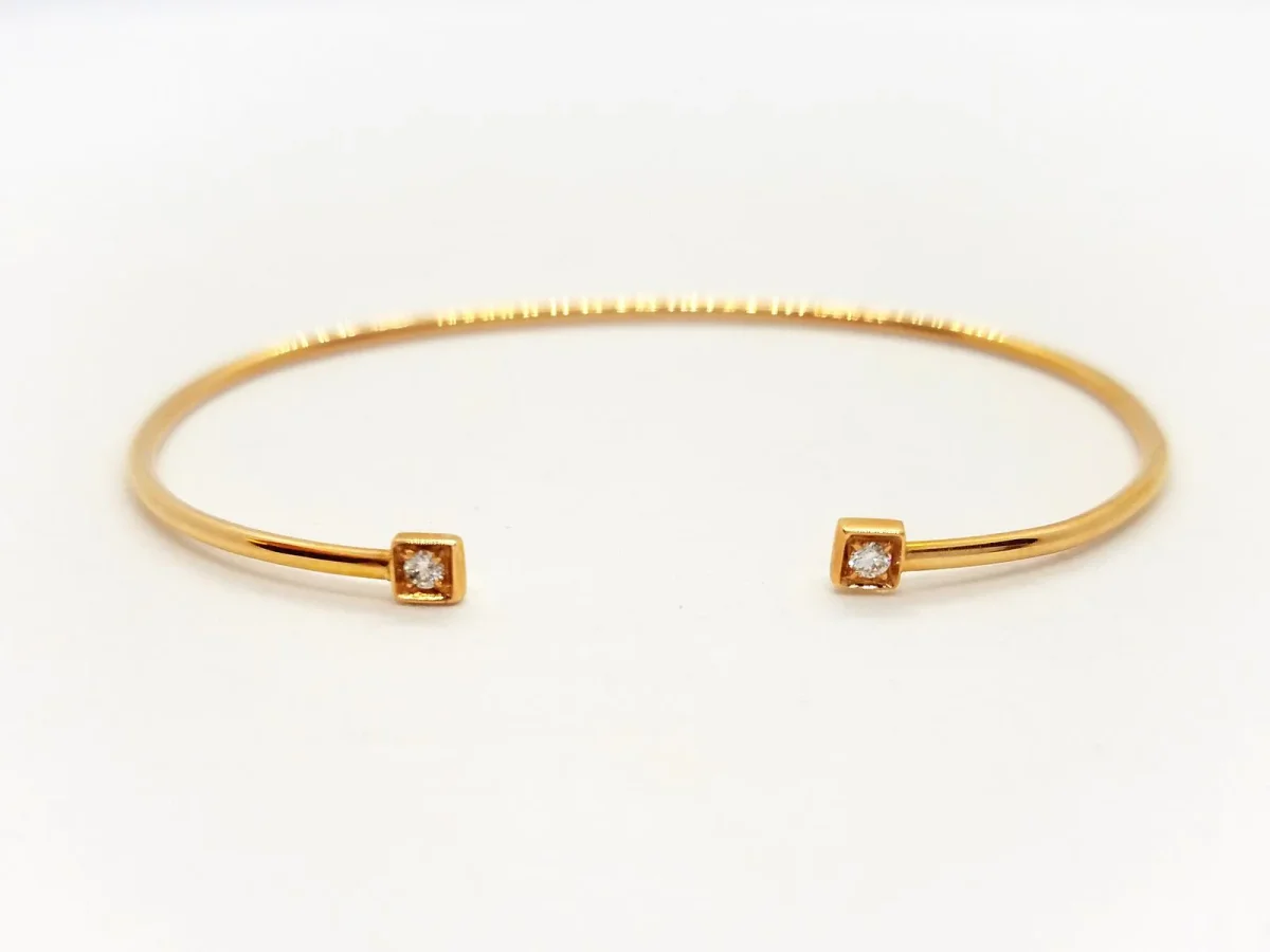 Bracelet jonc ouvrant, en or rose 750 millièmes (18 carats), serti aux extrémités de deux diamants taille brillant G-H V-SI pour 0,07 ct au total, diamètre: 6 cm x 4,4 cm, largeur: 0,13 cm, tour de poignet: 17 cm, poinçon tête d’aigle, poids total: 3,83 g, état neuf