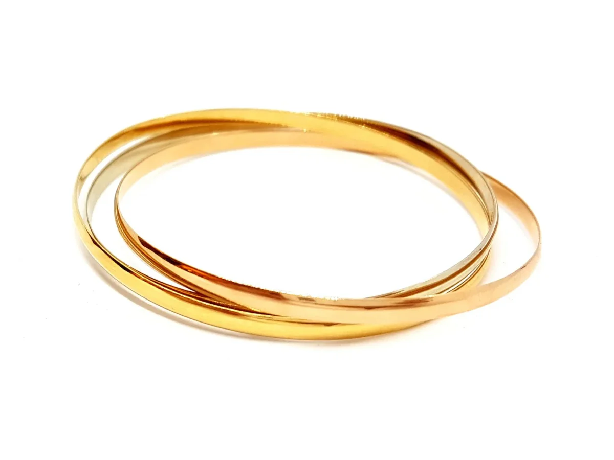Bracelet joncs, 3 ors 750 millièmes (18 carats), 3 joncs rigides entrelacés, un anneau en or rose , un en or blanc et un or jaune, diamètre: 6,65 cm, largeur d’un anneau: 0,36 cm, poids total: 25,53 g, poinçon tête d’aigle, état neuf