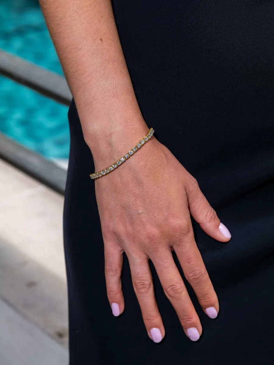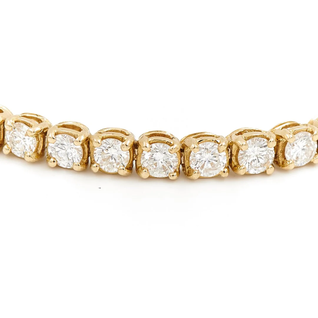 Bracelet ligne diamants, or jaune 750 millièmes (18 carats), 41 diamants d’environ 0,15 ct chacun, environ G-H/VS, poids total diamants : 6,15 cts, longueur : 18 cm, largeur : 0,41 cm, poids total : 14,01 g, poinçon tête d’aigle, excellent état