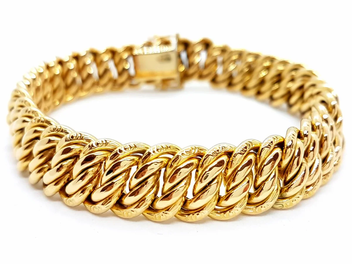 Bracelet en or jaune 750 millièmes (18 carats), maille américaine, fermoir avec 2 huits de sécurité, longueur 20 cm, largeur: 1,25 cm, poids total: 47,29 g, excellent état, poinçon tête d’aigle