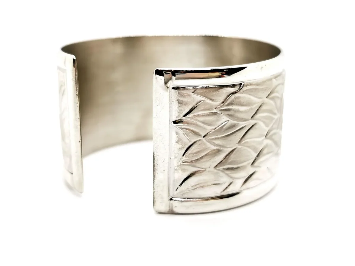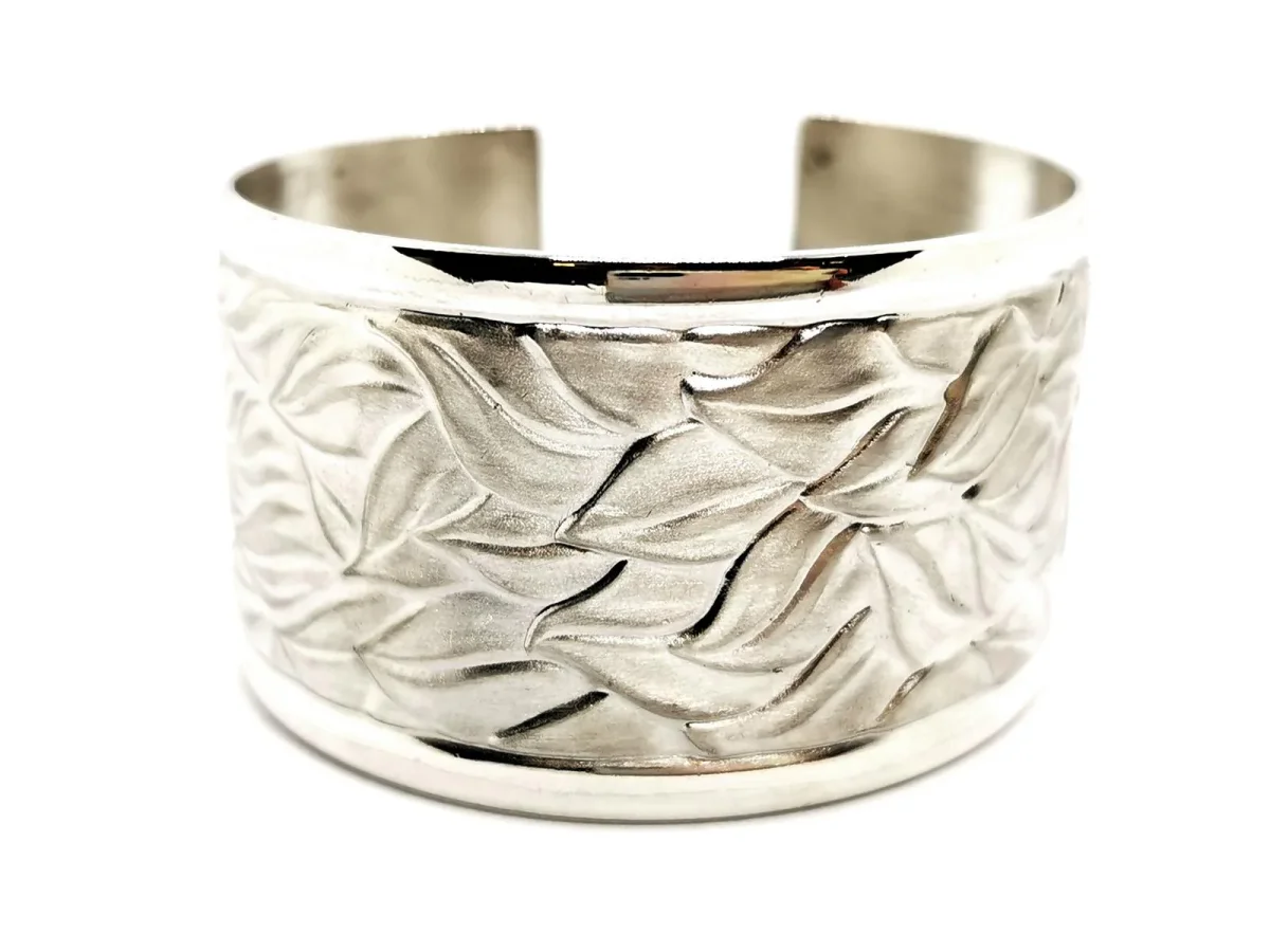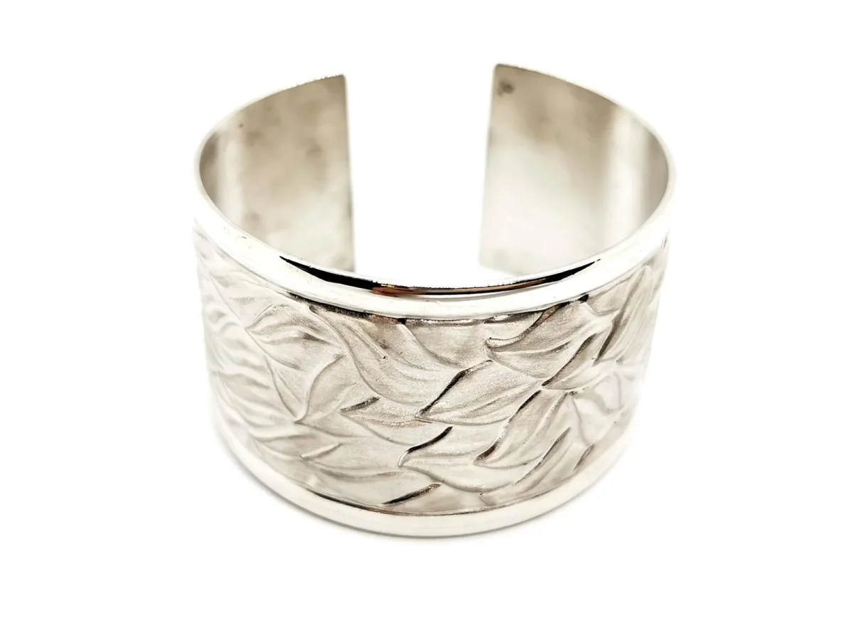 Bracelet manchette, en argent 925 millièmes, ouvert à motifs, taille: 18 cm, largeur: 3,5 cm, diamètre intérieur: 5,8 cm x 5,8 cm, épaisseur: 0,18 cm, poids total: 87,89 g, poinçonné, excellent état