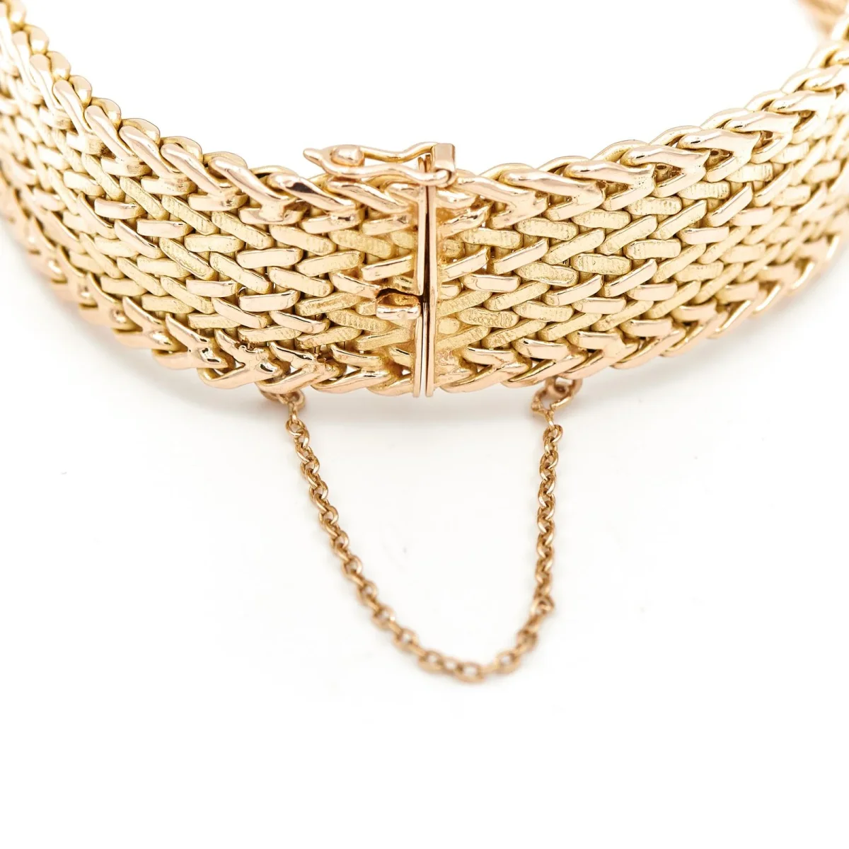 Bracelet manchette en or jaune 750 millièmes (18 carats), maille polonaise brossée et brillante, fermoir avec huit et chainette de sécurité, longueur: 19,5 cm, largeur: 1,47 cm, épaisseur: 0,24 cm, poids total: 31,49 g, poinçon tête d’aigle, excellent état