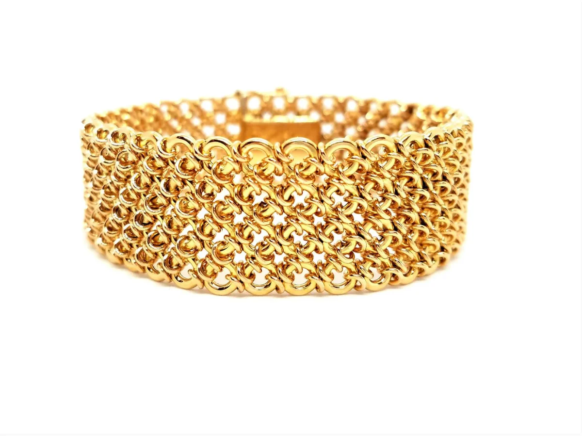 Bracelet manchette en or jaune et rose750 millièmes (18 carats), maille travaillée, longueur: 20 cm, largeur: 2,17 cm, épaisseur: 0,38 cm, poids total: 63,12 g, poinçon tête d’aigle, excellent état