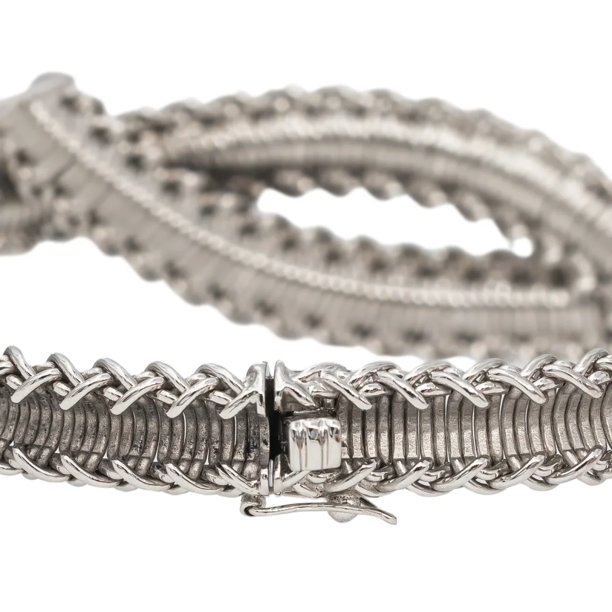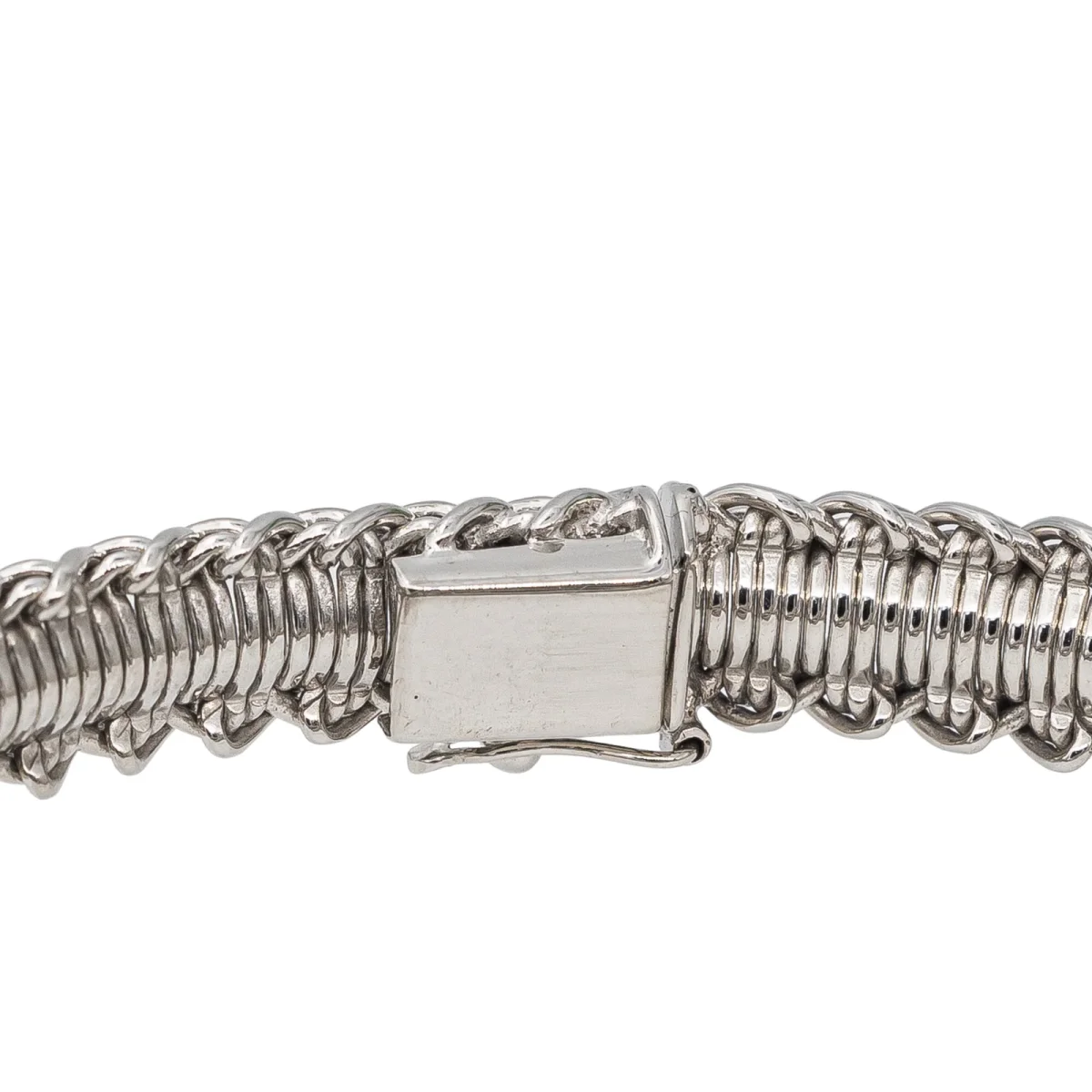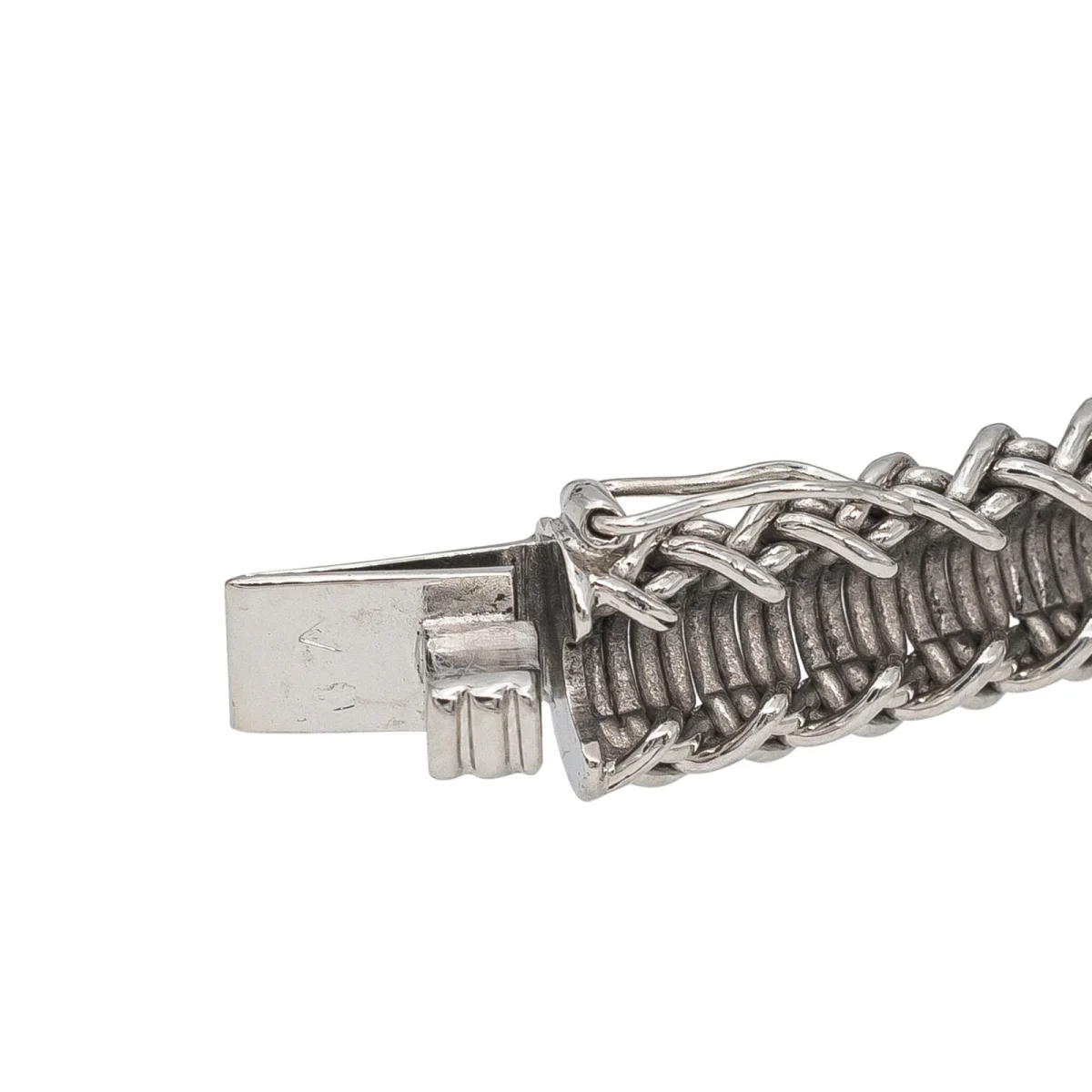 Bracelet or blanc 750 millièmes (18 carats), sertie de 8 émeraudes taille ronde, d’un poids d’environ 0,56 ct (chaque émeraude d’un poids d’environ 0,07 ct), sertie de 8 diamants taille brillant, environ G-VS, d’un poids total d’environ 0,40 ct (chaque diamant d’un poids d’environ 0,05 ct), longueur: 17,50 cm, largeur: 1,80 cm, épaisseur: 0,40 cm, poids total: 32,92 g, fermoir avec huit de sécurité, poinçon tête d’aigle, excellent état