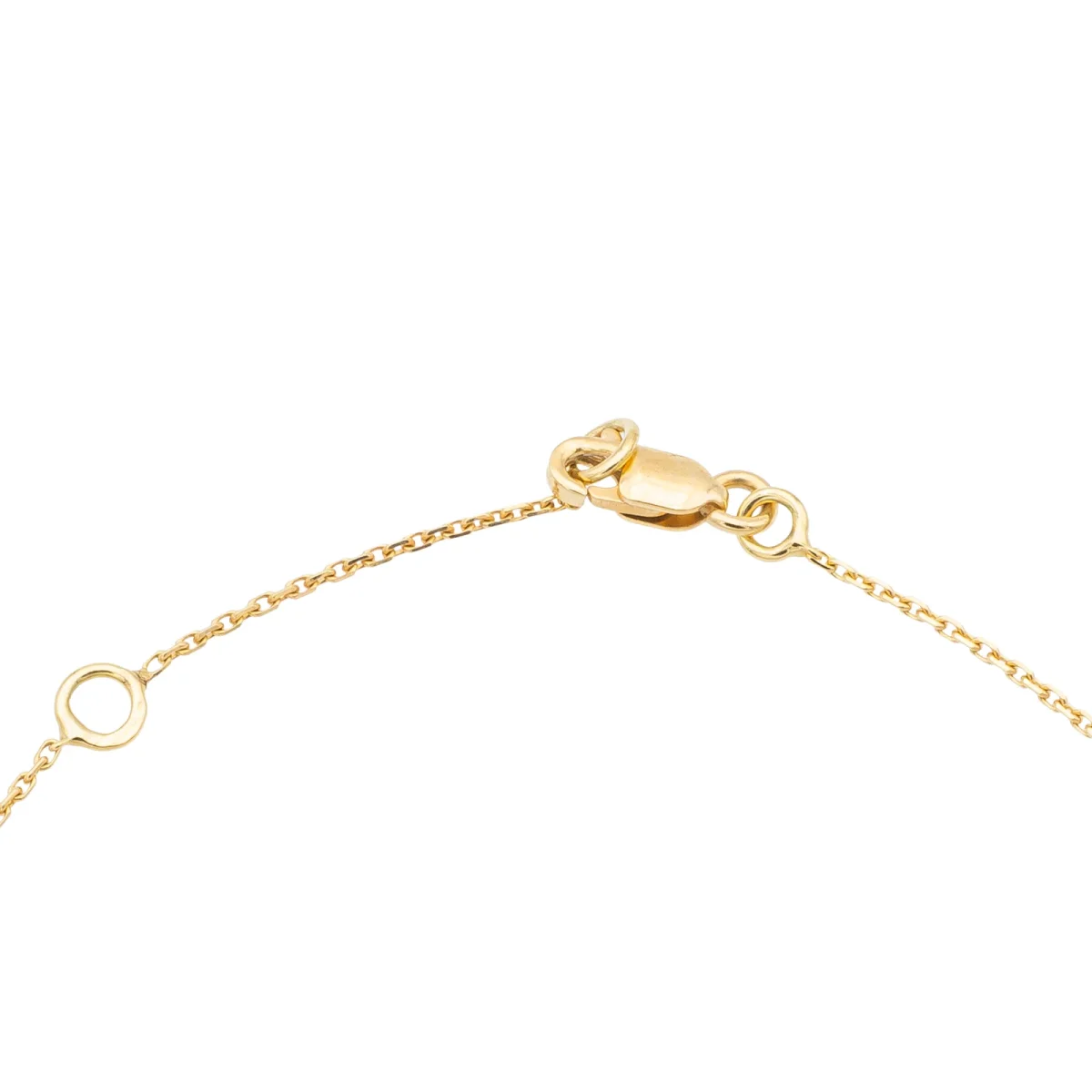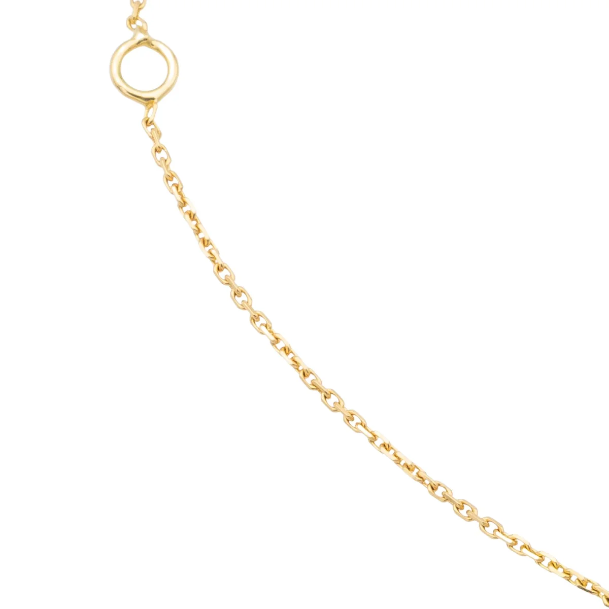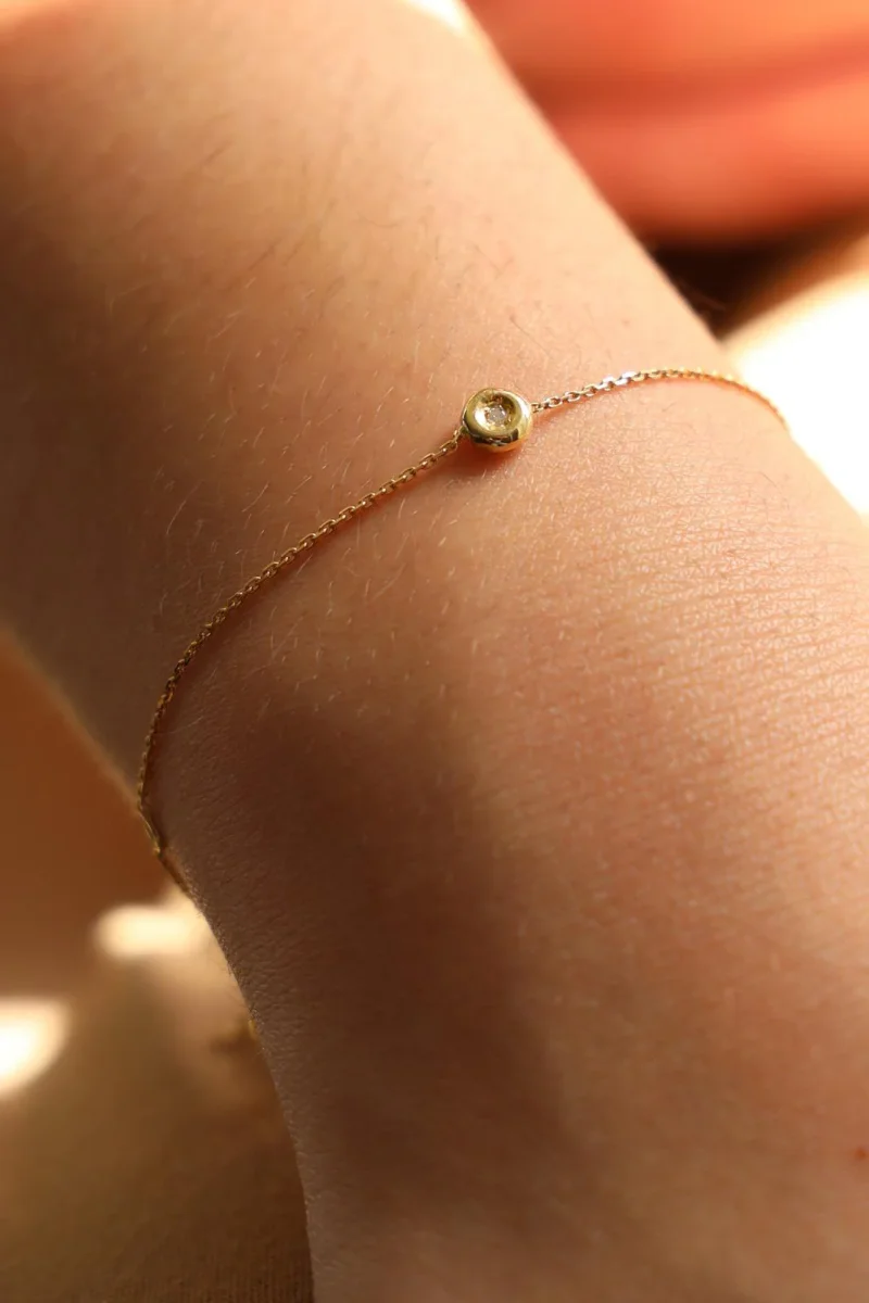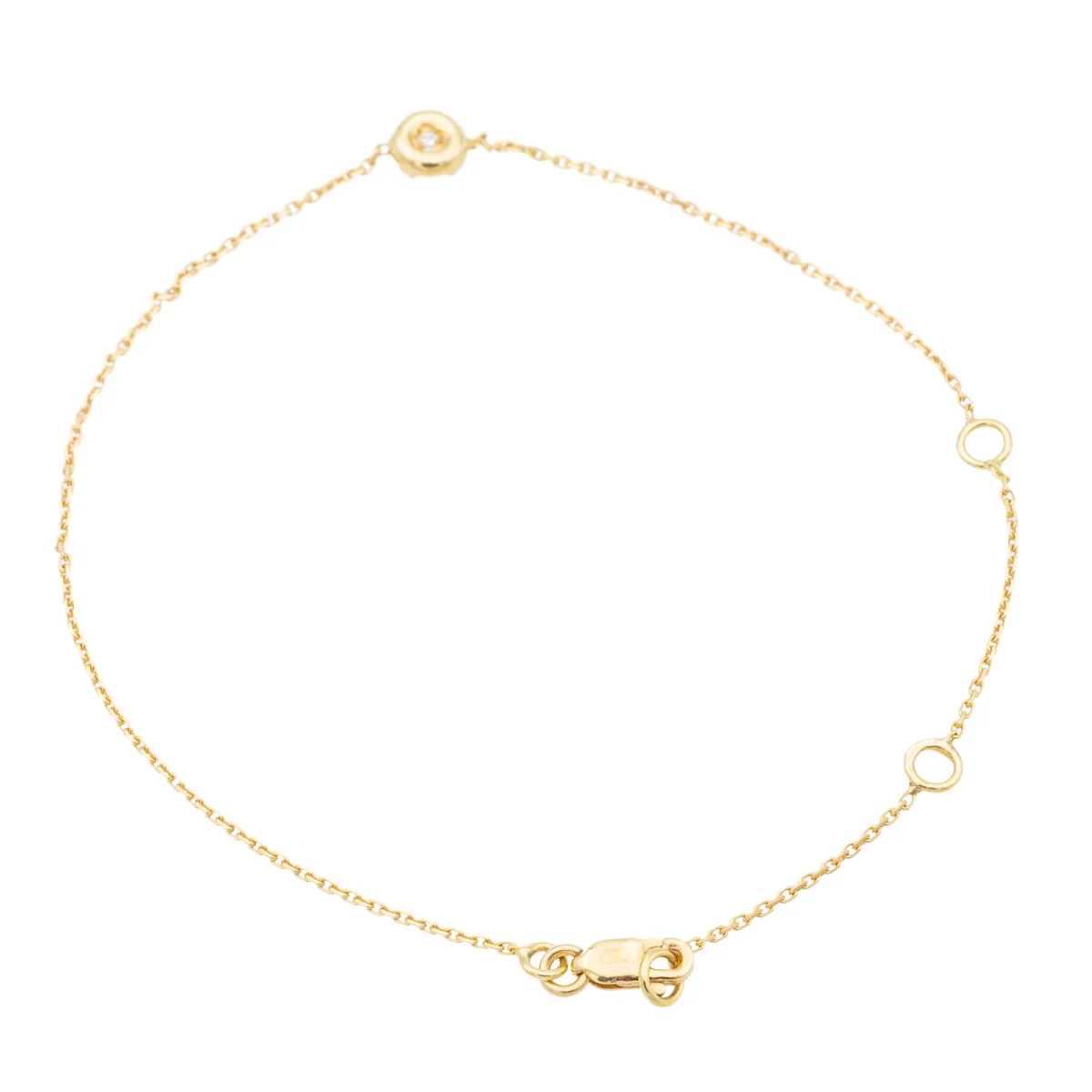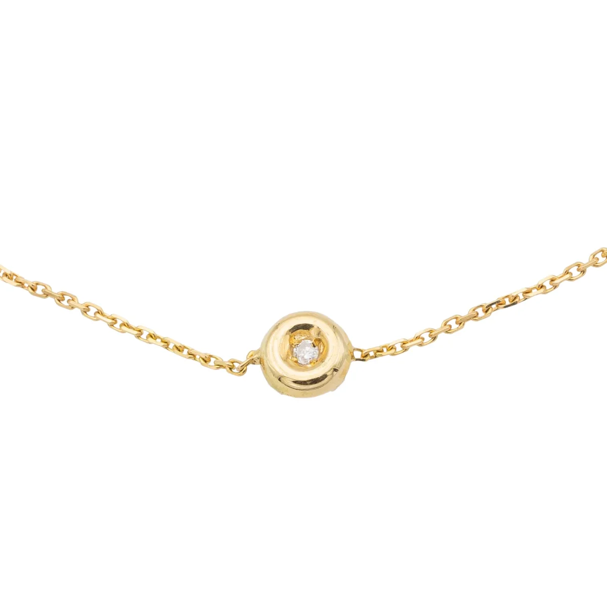 Bracelet en or jaune 750 millièmes (18 carats), fine chaîne en maille forçat sur laquelle est posé un diamant taille brillant G-H V-SI de 0,012 ct en serti clos, Longueur: 18 cm avec anneaux intermédiaires à 16 cm et à 14 cm, diamètre du motif: 0,48 cm, largeur de la chaîne: 0,7 mm, poids total: 1,07 g, poinçon tête d’aigle, état neuf