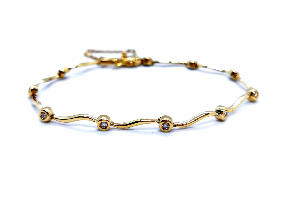 Bracelet en or jaune 750 millièmes (18 carats), articulé, 10 diamants en sertis clos, G-H VSI pour un total d’environ 0,25 ct, fermoir avec huit et chaînette de sécurité, longueur: 17,5 cm, largeur: 0,15 cm, diamètre des sertis clos: 0,38 cm, poids total: 5,79 g, poinçonné, excellent état