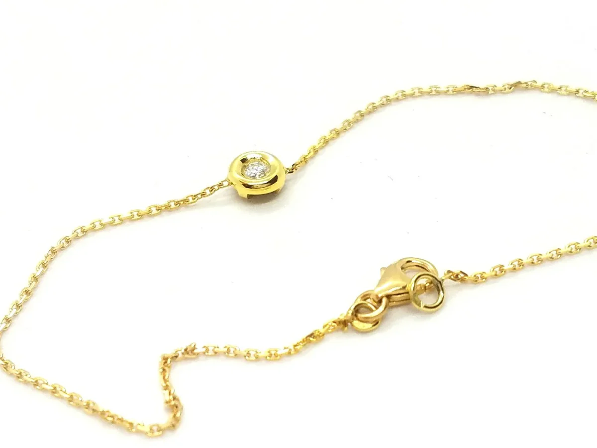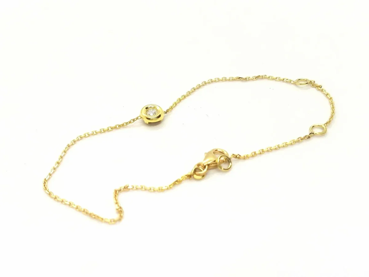 Bracelet en or jaune 750 millièmes (18 carats), fine chaîne en maille forçat sur laquelle est posé un diamant taille brillant G-H V-SI de 0,05 ct en serti clos, Longueur: 18 cm avec anneaux intermédiaires à 16 cm et à 14 cm, diamètre du motif: 0,55 cm, largeur de la chaîne: 0,7 mm, poids total: 1,29 g, poinçon tête d’aigle, état neuf