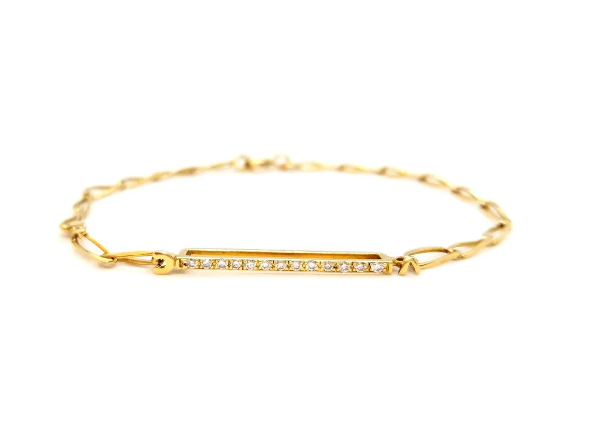 Bracelet en or jaune 750 millièmes (18 carats) testé, motif serti de 13 diamants taille brillant G-H VSI pour environ 0,07 ct au total, longueur: 16,5 cm, largeur chaîne: 0,22 cm, dimensions motif: 2,37 cm x 0,15 cm, poids total: 2,91 g, excellent état