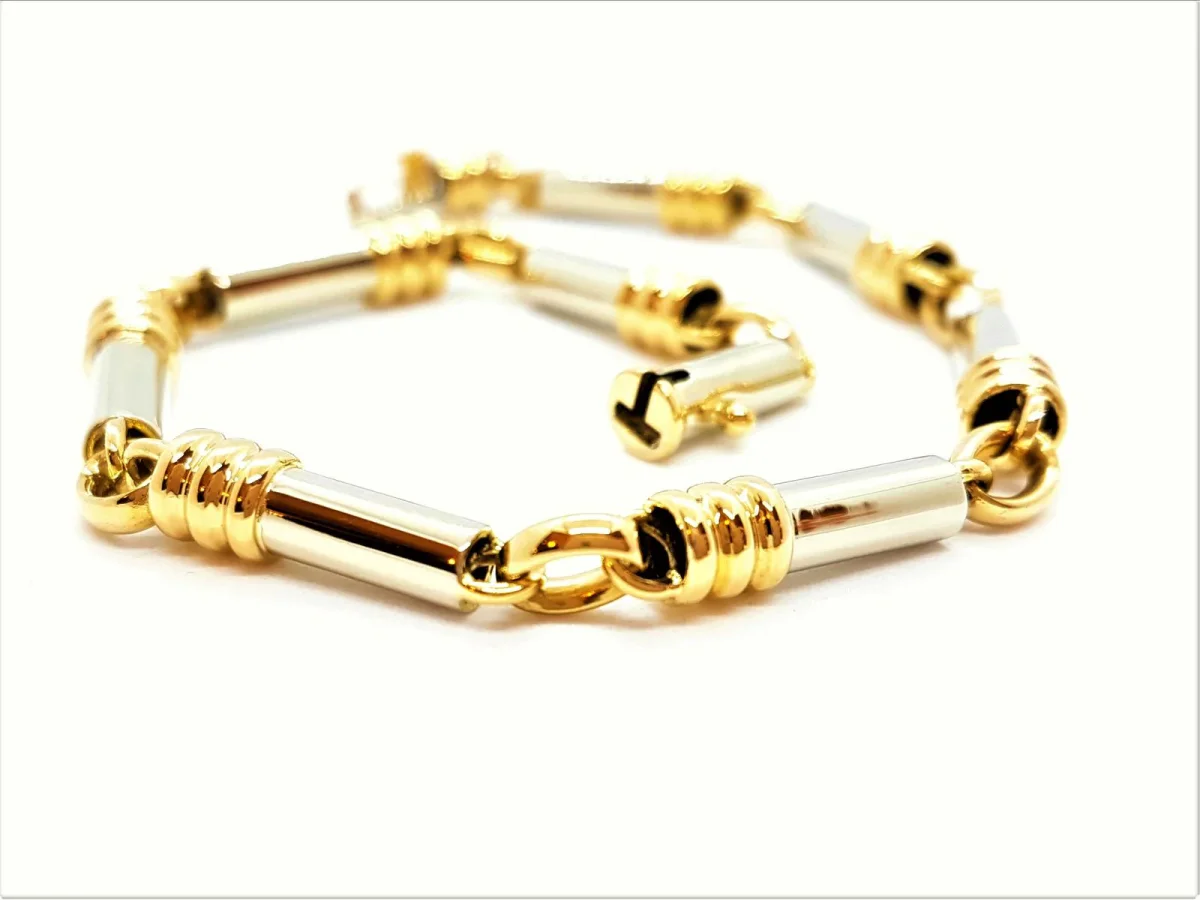 Bracelet bicolore, en Or jaune et blanc 750 millièmes (18 carats), Forme tubes, Longueur: 20 cm, longueur des tubes d un anneau de bout à l autre est 2,5 cm, tube seul: 1,5 cm et la largeur est de 0,38 cm, Poids total: 13,20 g, Excellent état, Poinçonné