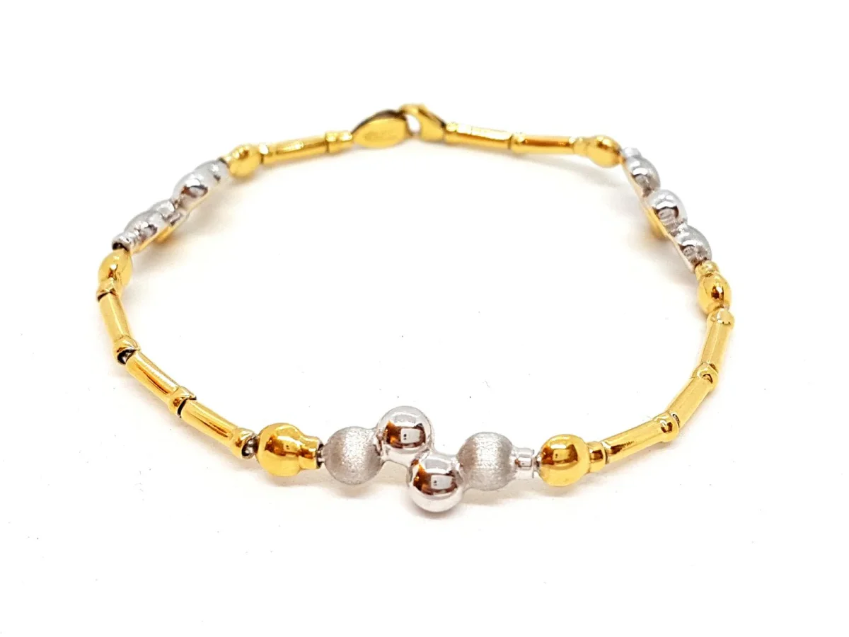 Bracelet bicolore, en or jaune et blanc 750 millièmes (18 carats), motifs en or blanc mat et brillant, longueur: 18,5 cm, largeur motif: 0,85 cm, poids total: 6,70 g, poinçon tête d’aigle, état neuf