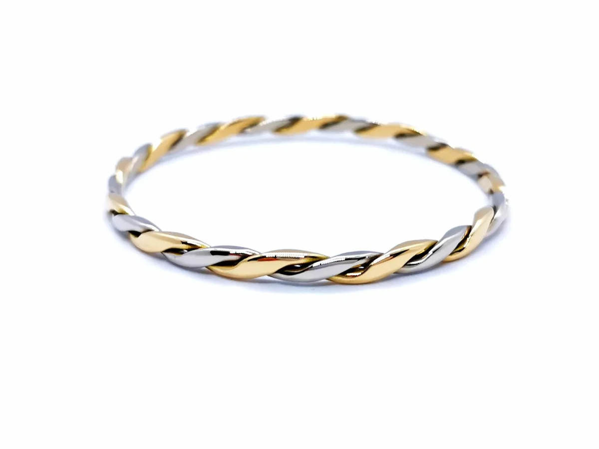 Bracelet rigide bicolore, en or jaune et blanc 750 millièmes (18 carats), massif, forme ronde, modèle torsadé, Taille: 21 cm, largeur: 0,44 cm, diamètre intérieur: 6,5 cm, poids total: 25,62 g, poinçon tête d’aigle, excellent état