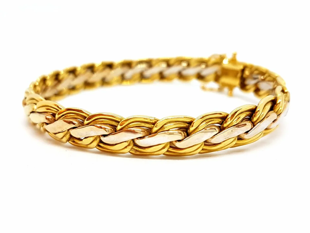 Bracelet bicolore, en or jaune et blanc 750 millièmes (18 carats), maille tressée, longueur: 19,5 cm, largeur: 0,9 cm, poids total: 17,14 g, poinçon tête d’aigle, état neuf