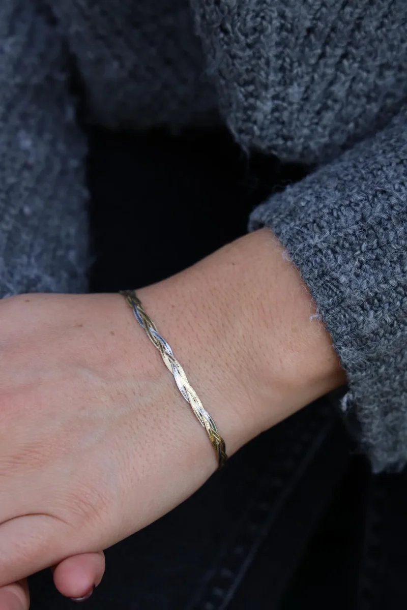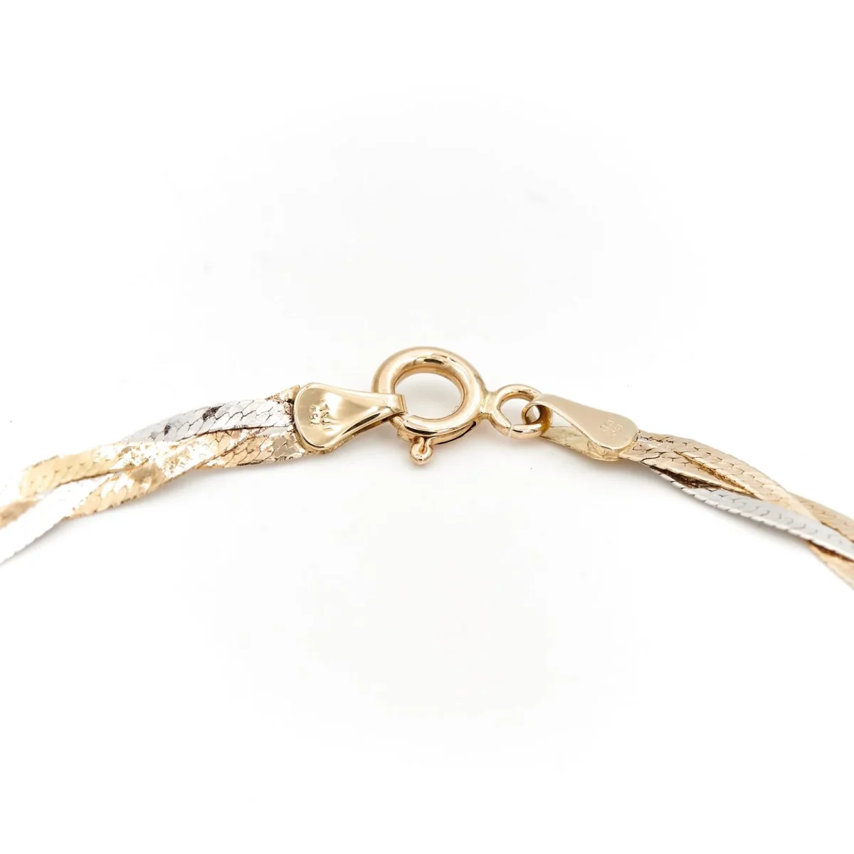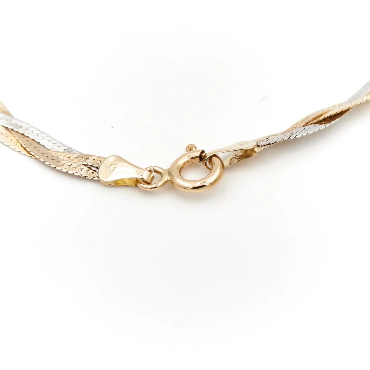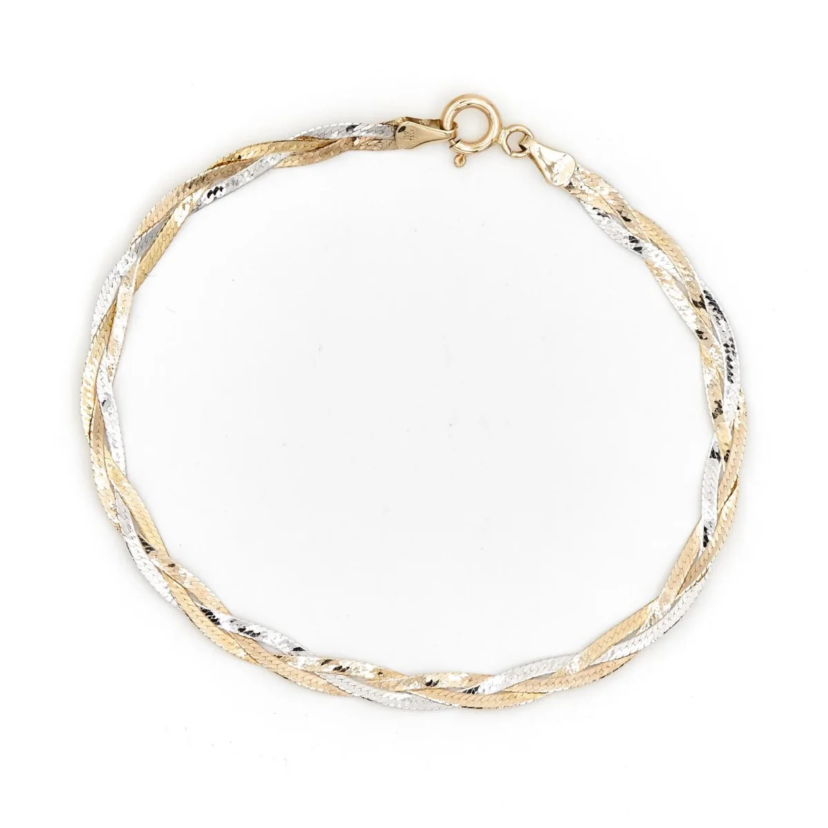 Bracelet en or jaune et or blanc 750 millièmes testé (18 carats), maille serpent tressée, longueur: 18,5 cm, largeur: 0,39 cm, poids total: 2,15 g, excellent état.