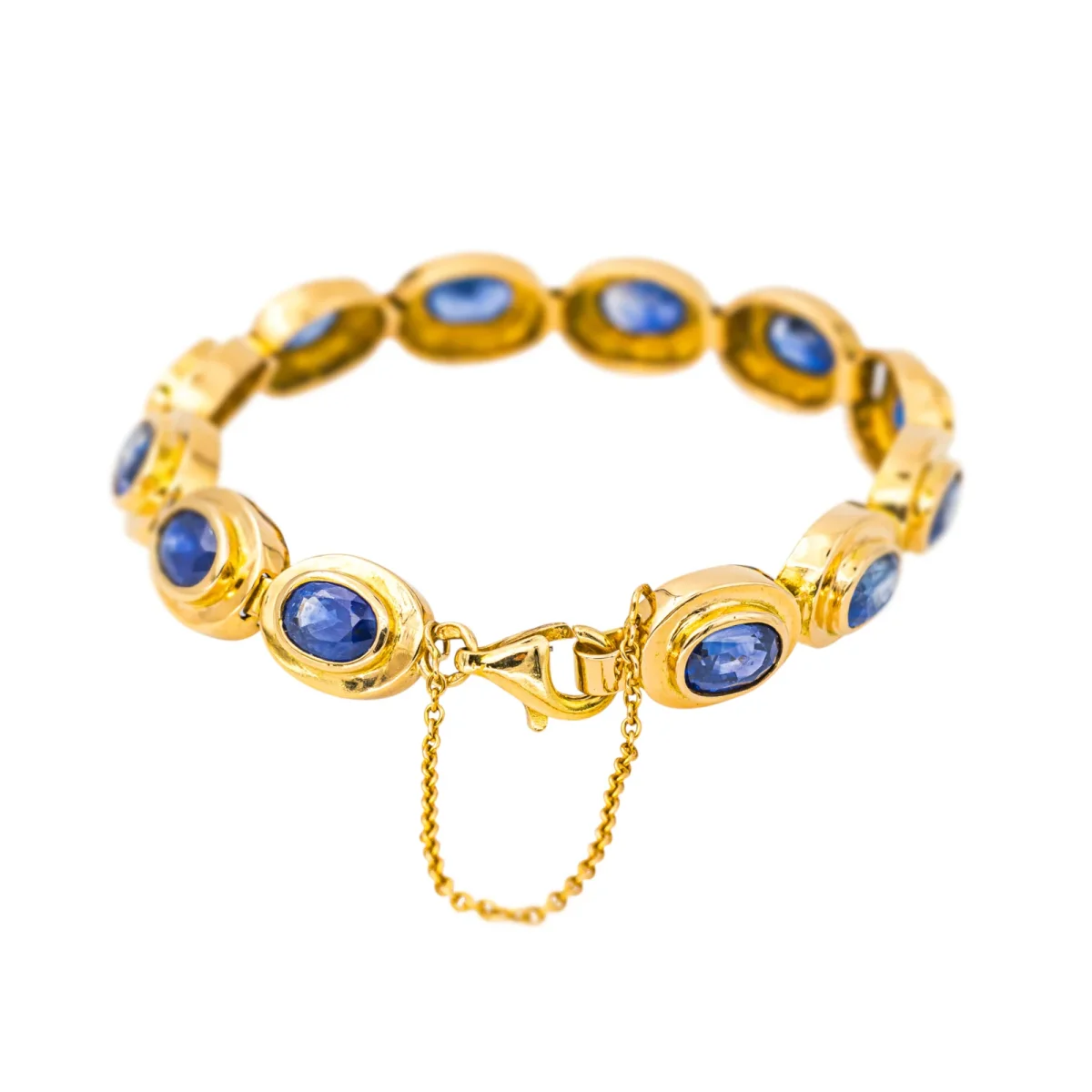 Bracelet en or jaune 750 millièmes (18 carats), serti de saphirs taille ovale, d’un poids total d’environ 11,40 cts, (chaque saphir d’un poids d’environ 0,95 ct), maille souple, longueur : 16,50 cm, largeur : 0,90 cm, épaisseur : 0,47 cm, fermoir avec huit de sécurité, poids total : 21,46 g, poinçon hibou, excellent état