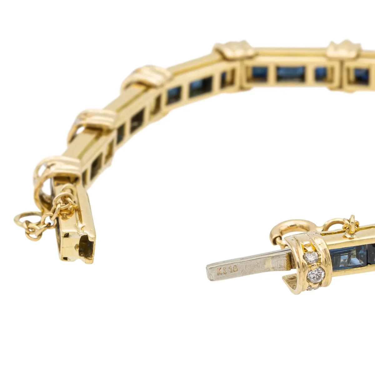 Bracelet or jaune 750 millièmes (18 carats), serti de 53 saphirs taille rectangle, chacun d’un poids d’environ 0,20 ct, poids total des saphirs: environ 10,80 cts, et 51 diamants taille brillant, estimés H/SI, poids total des diamants: environ 1,53 cts, chacun d’un poids d’environ 0,03 ct, longueur: 21 cm, largeur: 0,58 cm, poids total: 23,89 g, fermoir languette avec chainette, poinçon hibou, excellent état