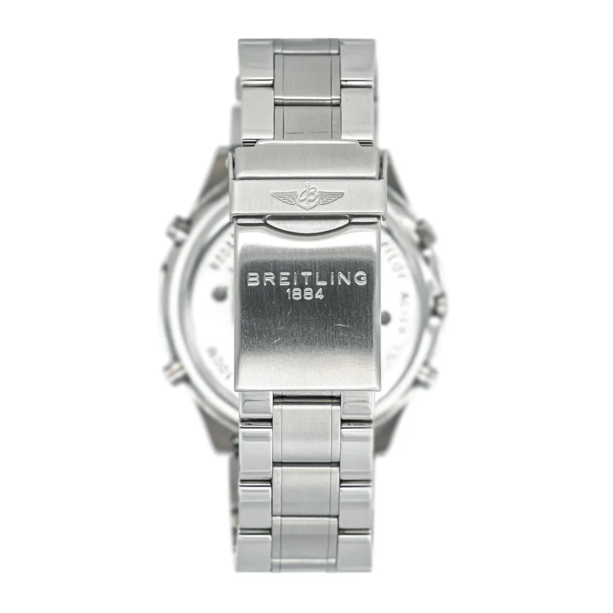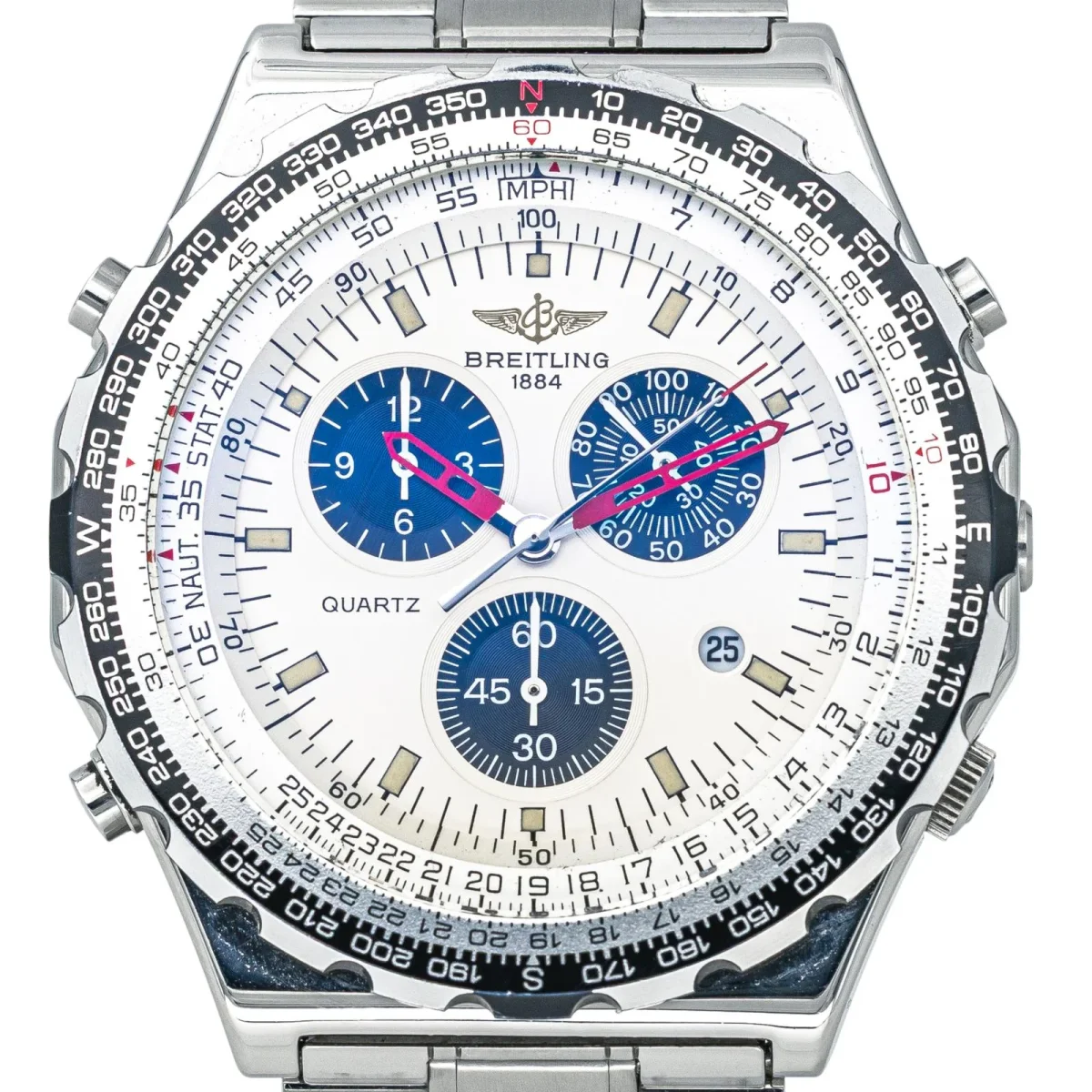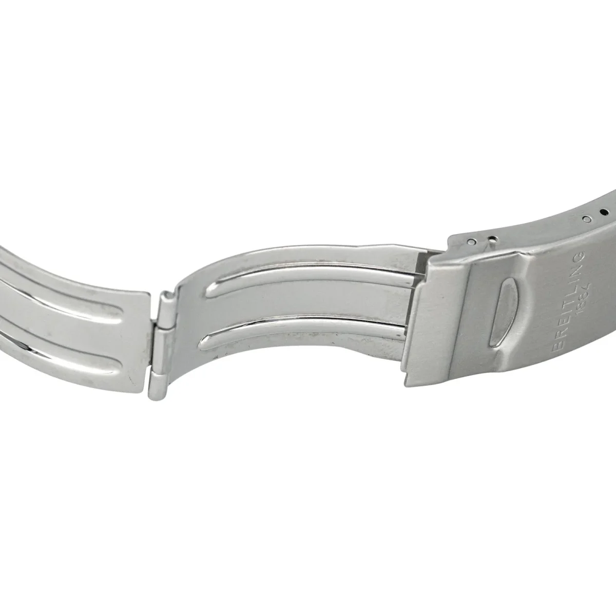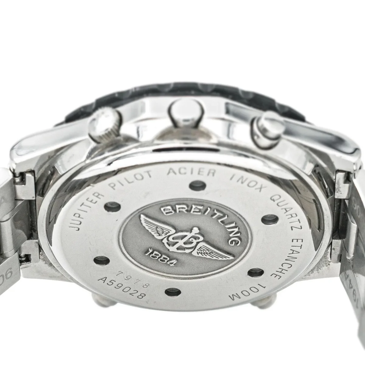 Montre Breitling modèle Jupiter Pilot acier, réf A59028, n°série 7978, cadran blanc à chiffres index bâtons et chiffre arabes, mouvement à quartz, boîtier 42 mm, verre saphir, bracelet acier à boucle déployante (taille poignet 21 cm, largeur bracelet 2,00 cm), poids total : 137,23 g, années 90, révision complète et garantie 1 an, excellent état