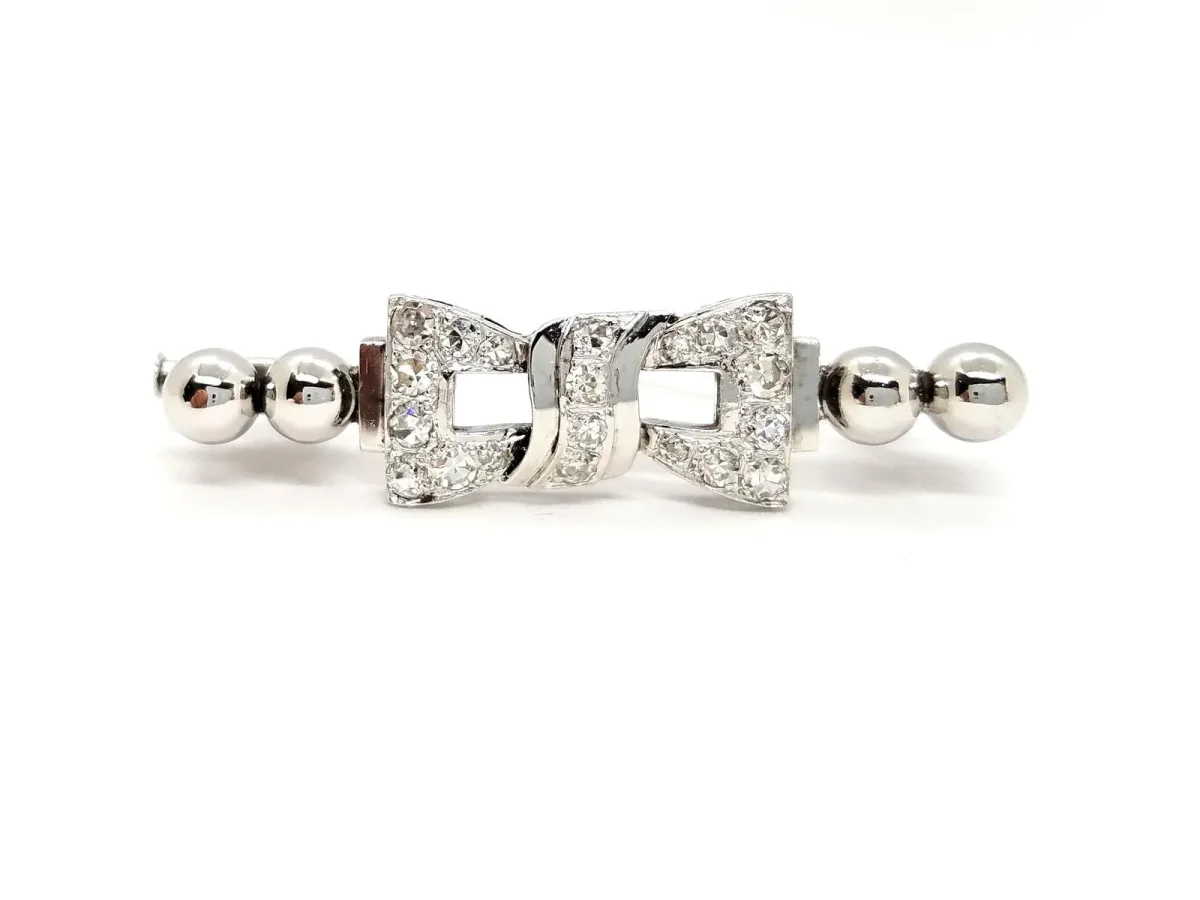 Broche Art Déco en or blanc 585 millièmes (14 carats), Sertie de 20 diamants taille ancienne H-SI pour environ 0.26 ct au total, Poids : 3.92 g, poinçonné, forme noeud et boules, dimensions: 4 cm x 1 cm, excellent état