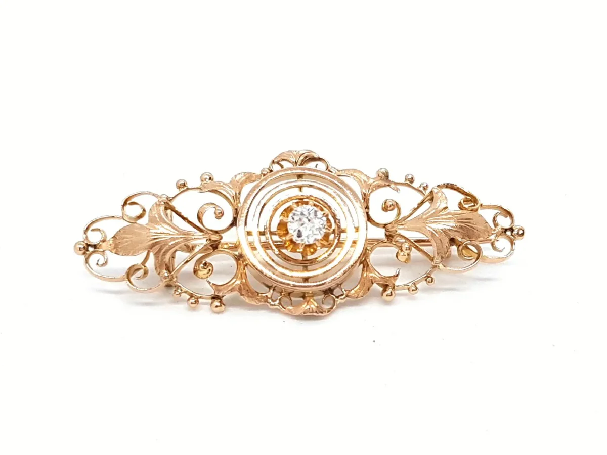 Broche des années 30, art déco, en Or Rose 750 millièmes (18 carats), Sertie en son centre d’un diamant taille ancienne H-SI d’environ 0.20 ct, Poids : 4.37 g, dimensions: 4,4 cm x 1,7 cm, poinçonné, excellent état