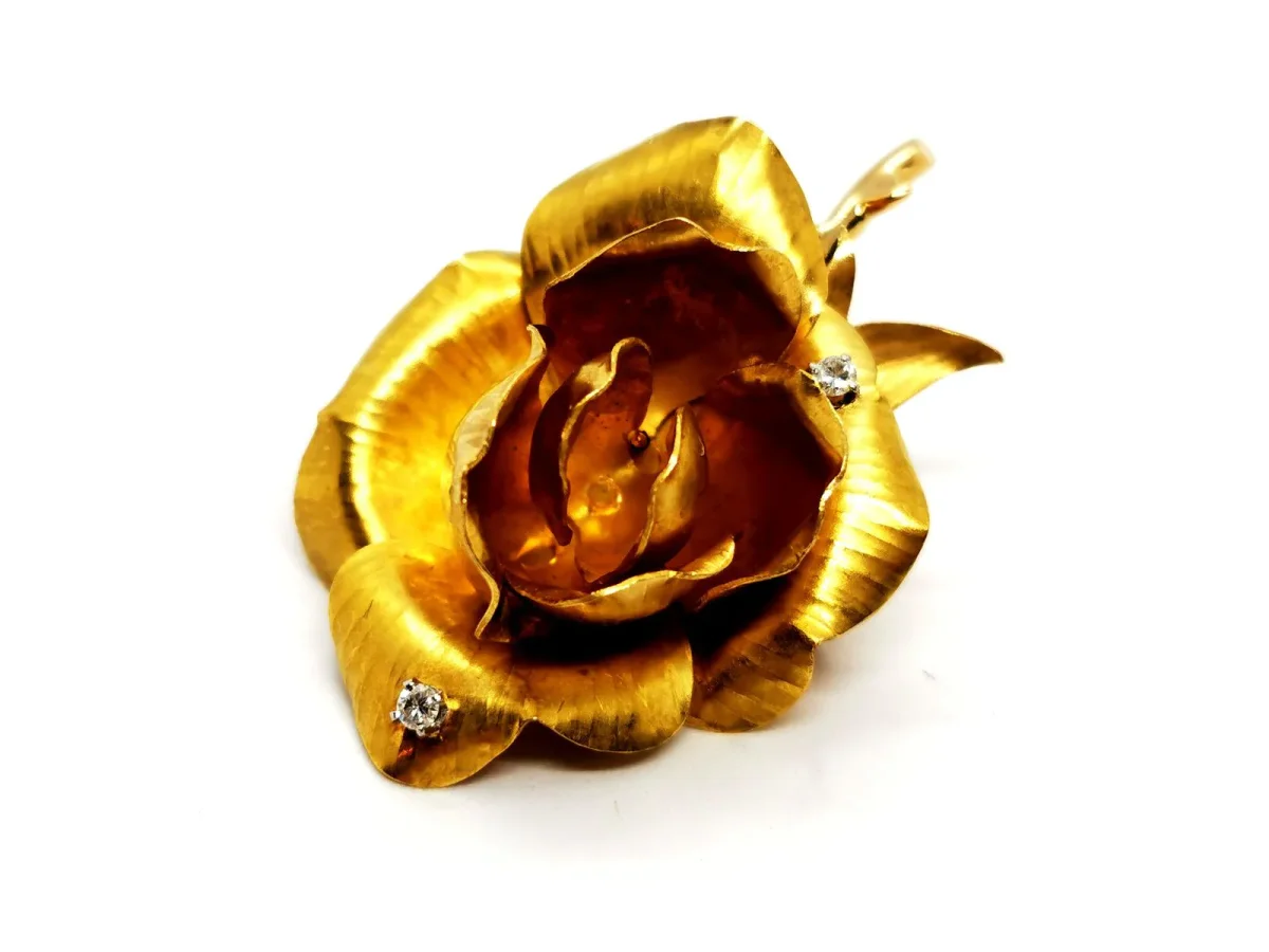 Broche fleur, en or jaune 833 millièmes (20 carats), et tige en or rose 750 millièmes (18 carats), fleur en or mat et brillant, sertie de deux diamants, taille brillant G/VS, d’environ 0,045 ct chacun, poids total diamants: environ 0,09 ct, dimensions: 5,34 cm x 3,53 cm, poids total: 23,14 g, poinçon tête d’aigle, excellent état