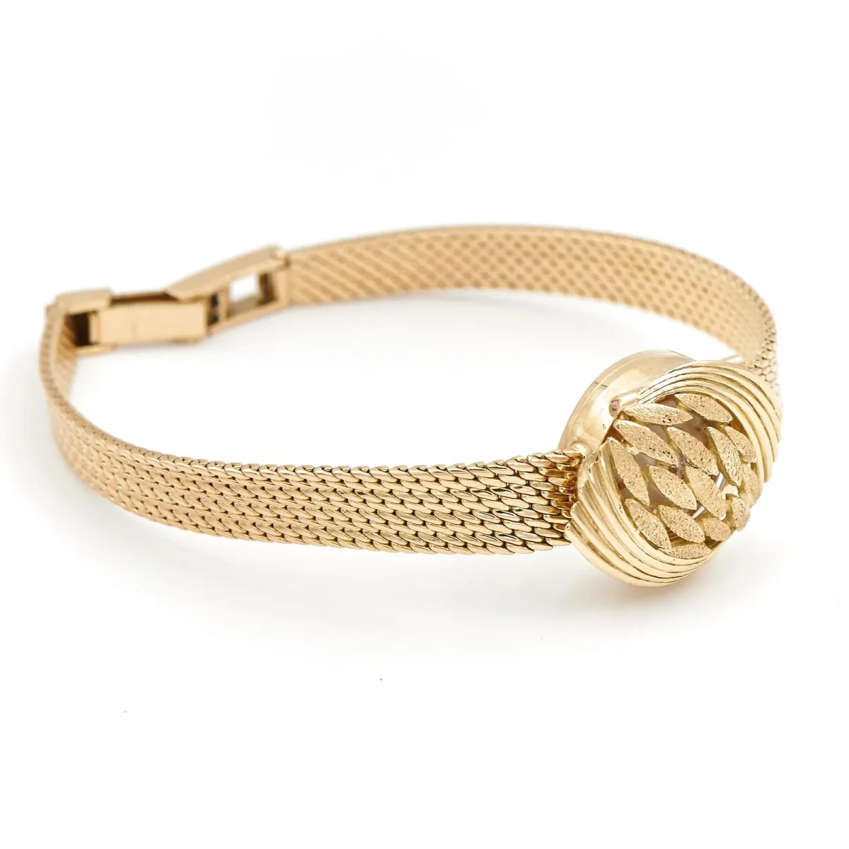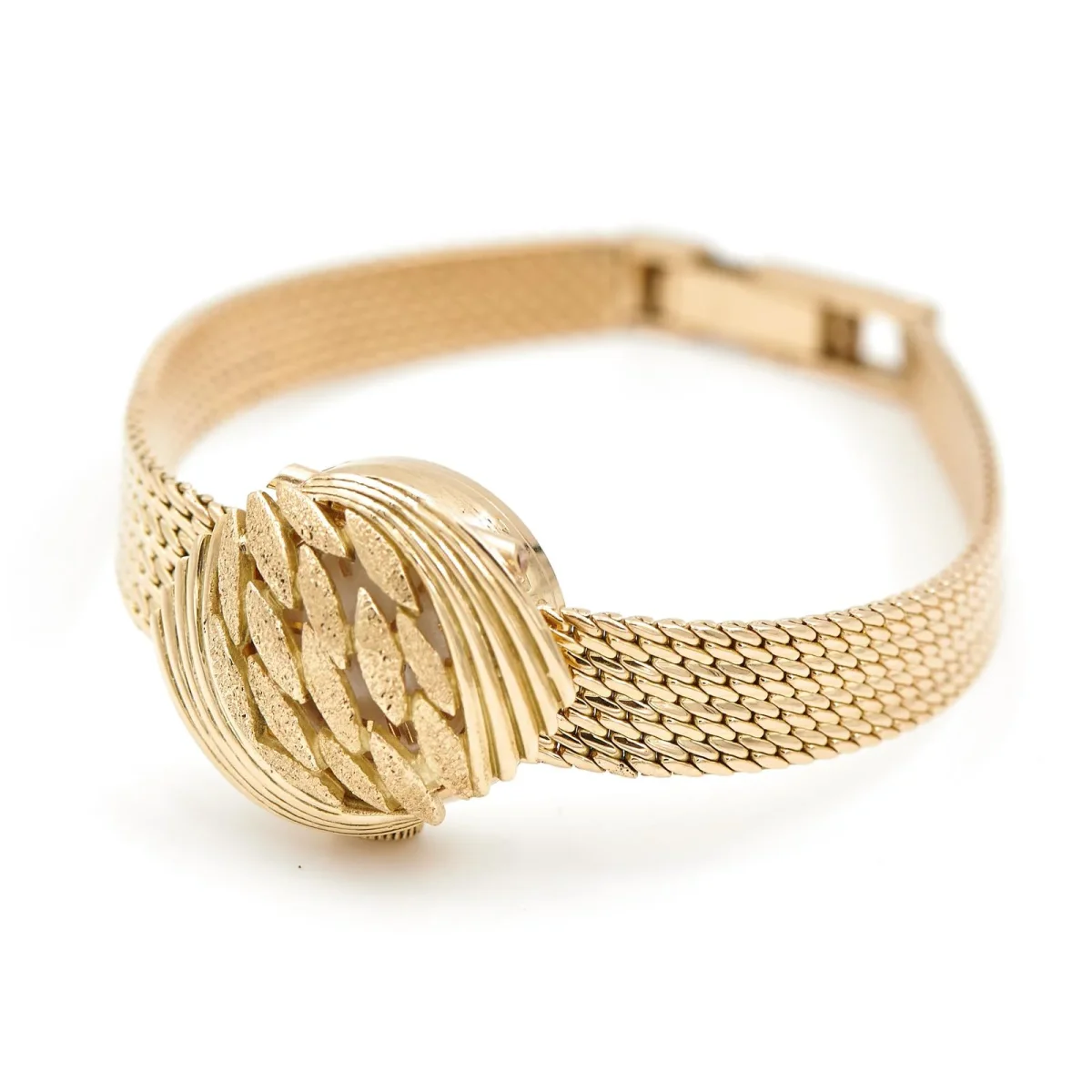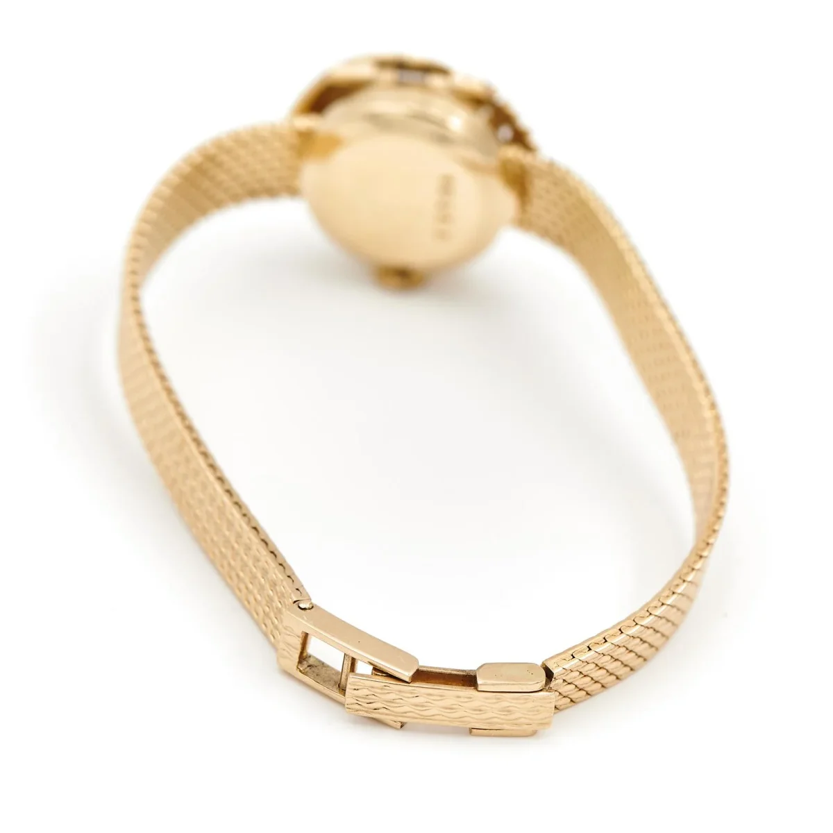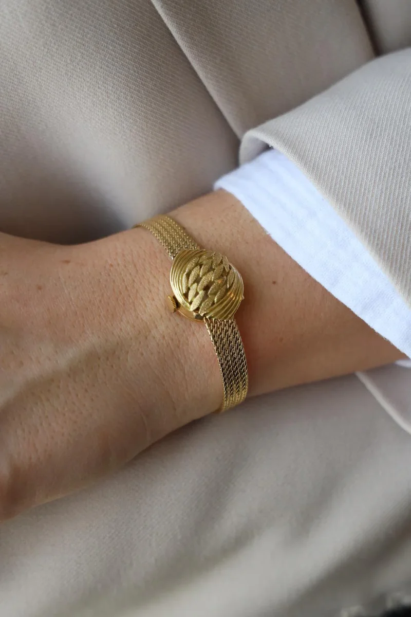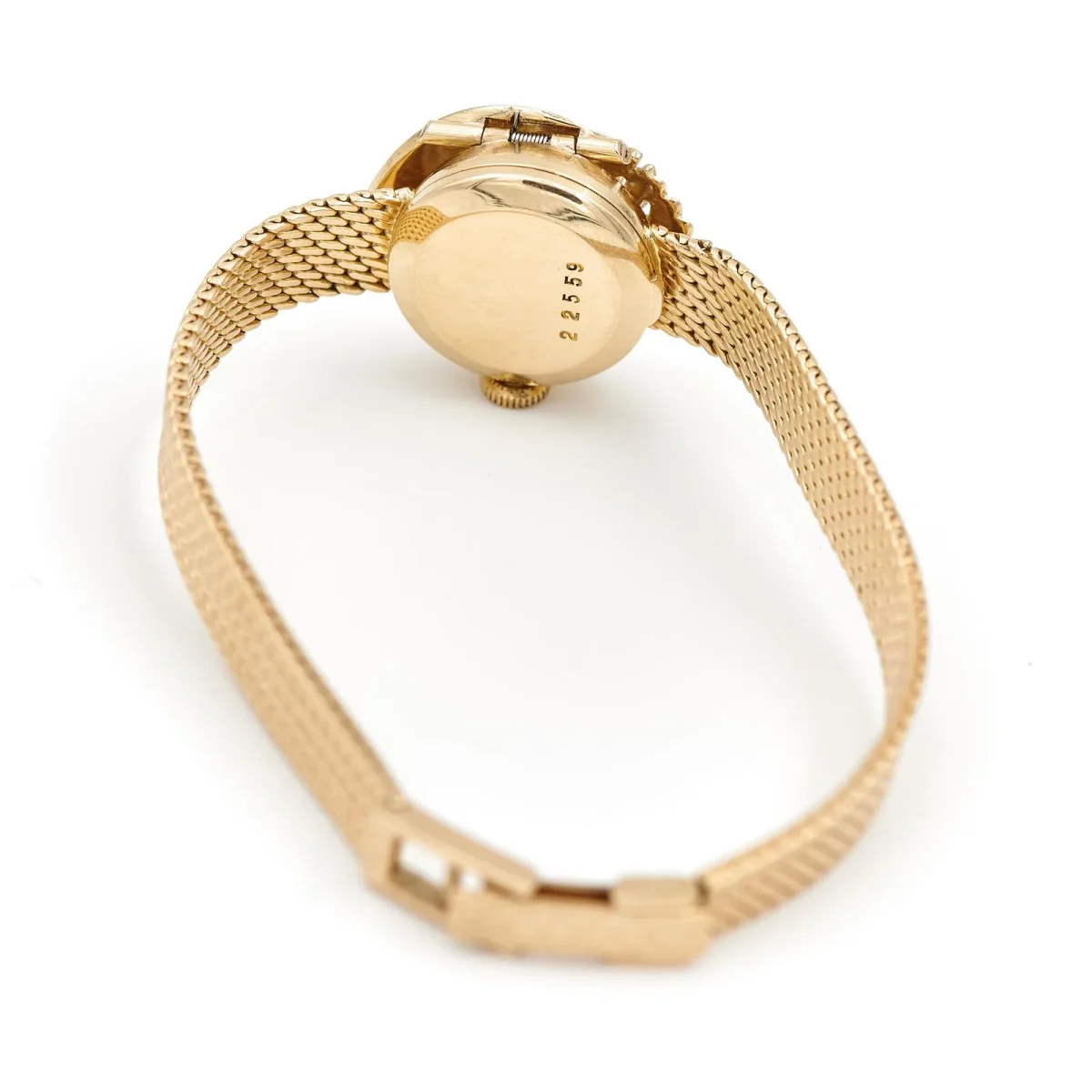 Montre dame à secret signée de la maison Bucherer, en or jaune 750 millièmes (18 carats), le cadran recouvert d’un motif ajouré amovible, taille du boitier: 1,85 cm, longueur: 18 cm, largeur du bracelet au devant: 0,77 cm, largeur du bracelet au revers: 0,47 cm, poids total: 25,87 g, excellent état, numérotée 22559