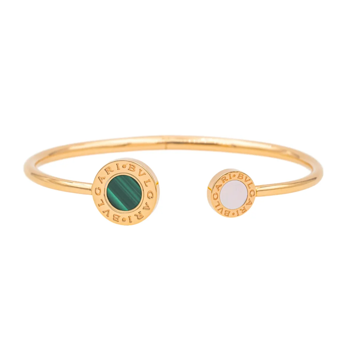 Bracelet signé de la Maison Bulgari, collection Bvlgari Bvlgari classique, en or rose 750 millièmes (18 carats), jonc ouvrant, grand motif reversible serti d’un côté de malachite et d’onyx d’autre part, petit motif sertif de nacre blanche, taille : 17 cm, diamètre grand motif : 1,35 cm, petit motif : 0,97 cm, poids total : 21,94 g, full set, excellent état, jamais porté